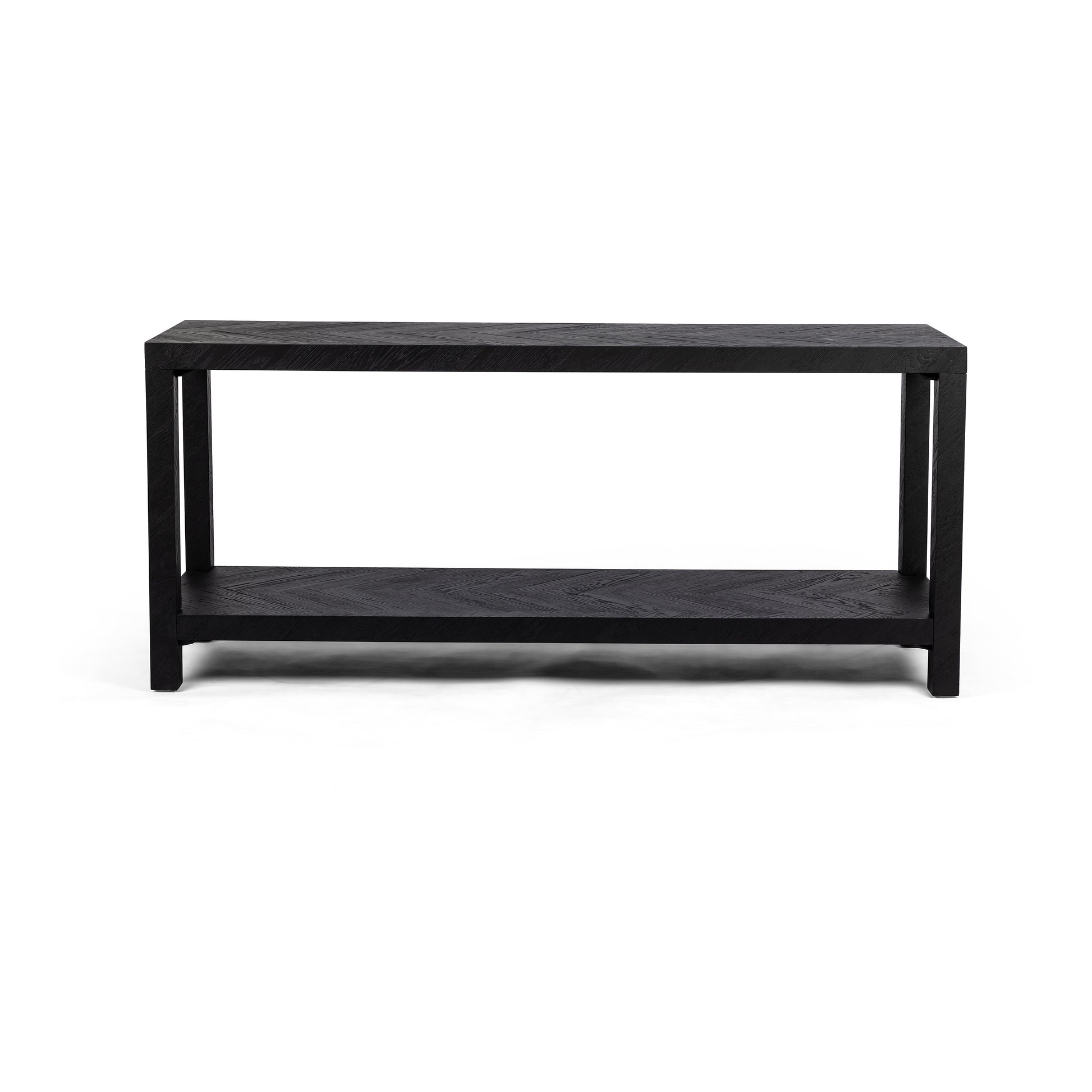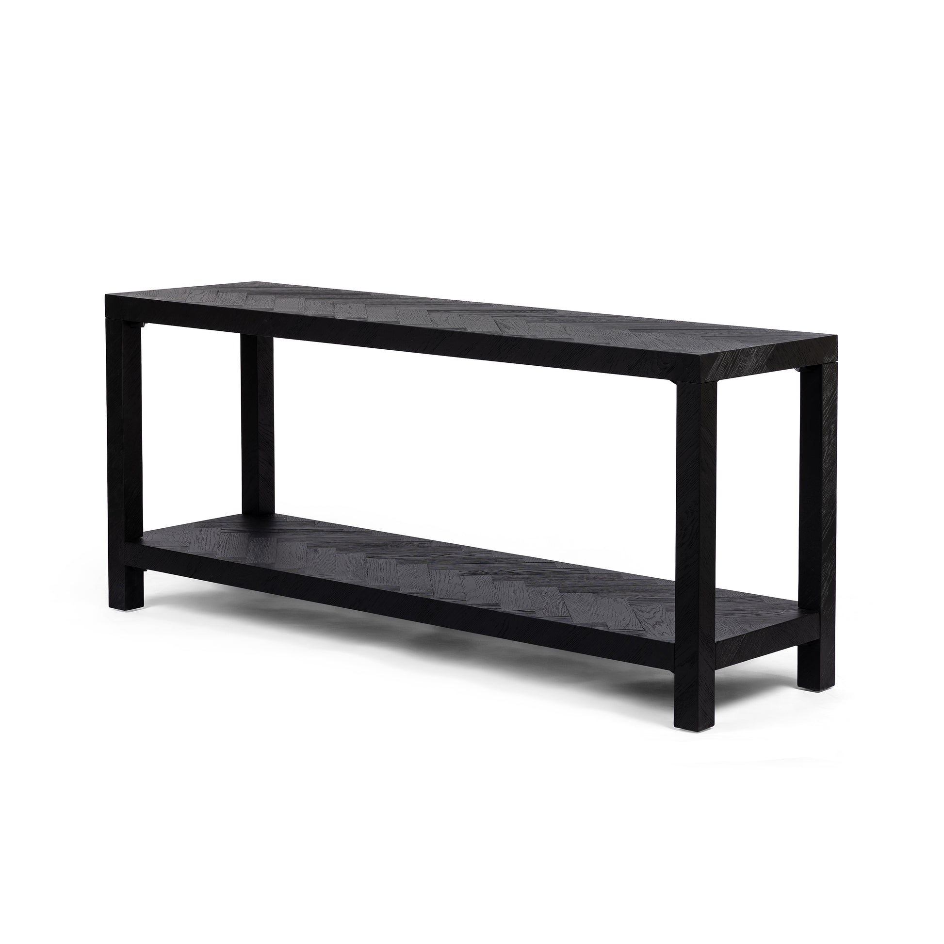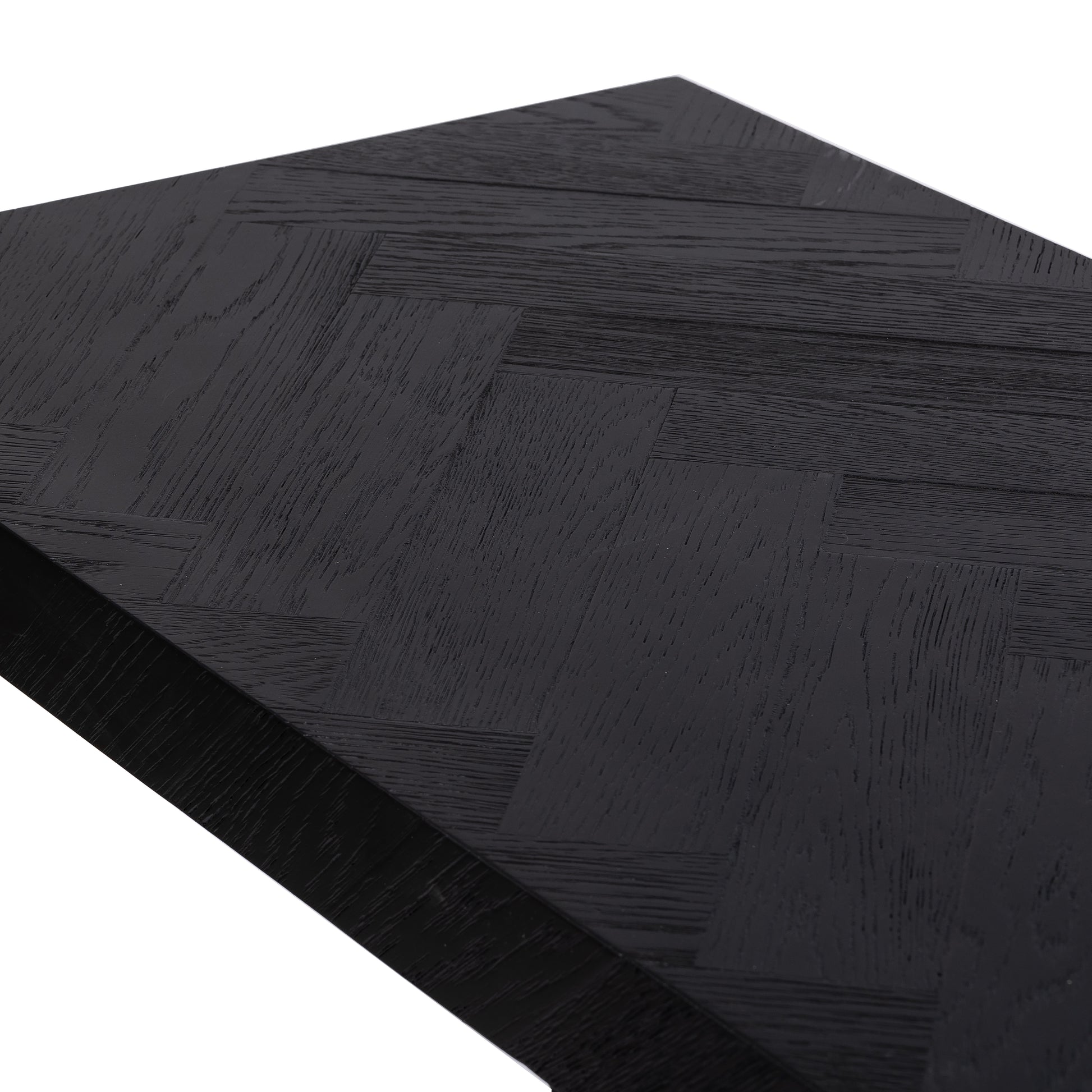 The simplest answer is often the right one. This deceptively simple Parsons-style table offers grandly exaggerated dimensions and a subtle, herringbone parquet pattern on every surface.