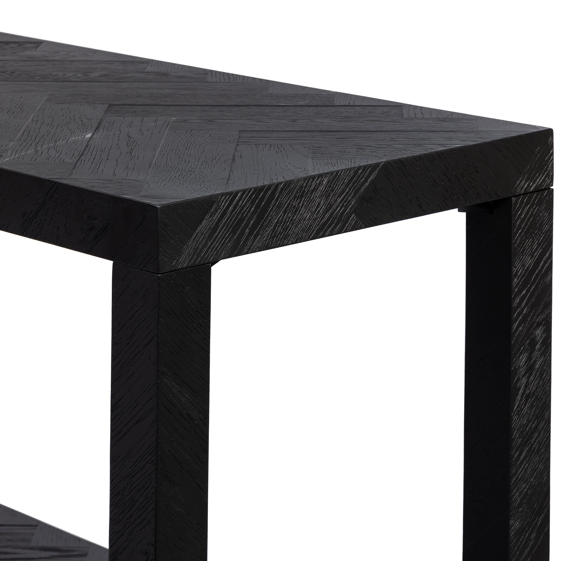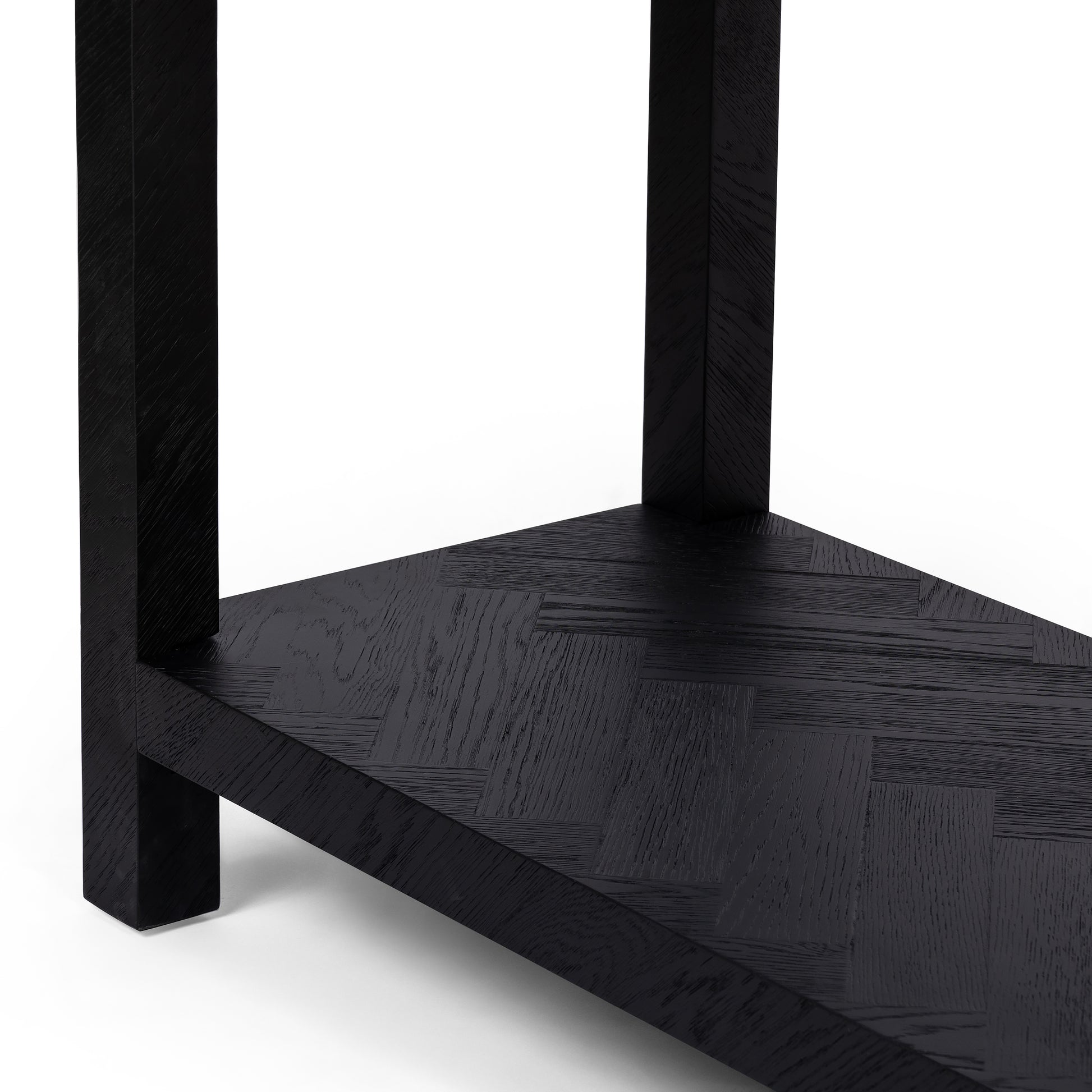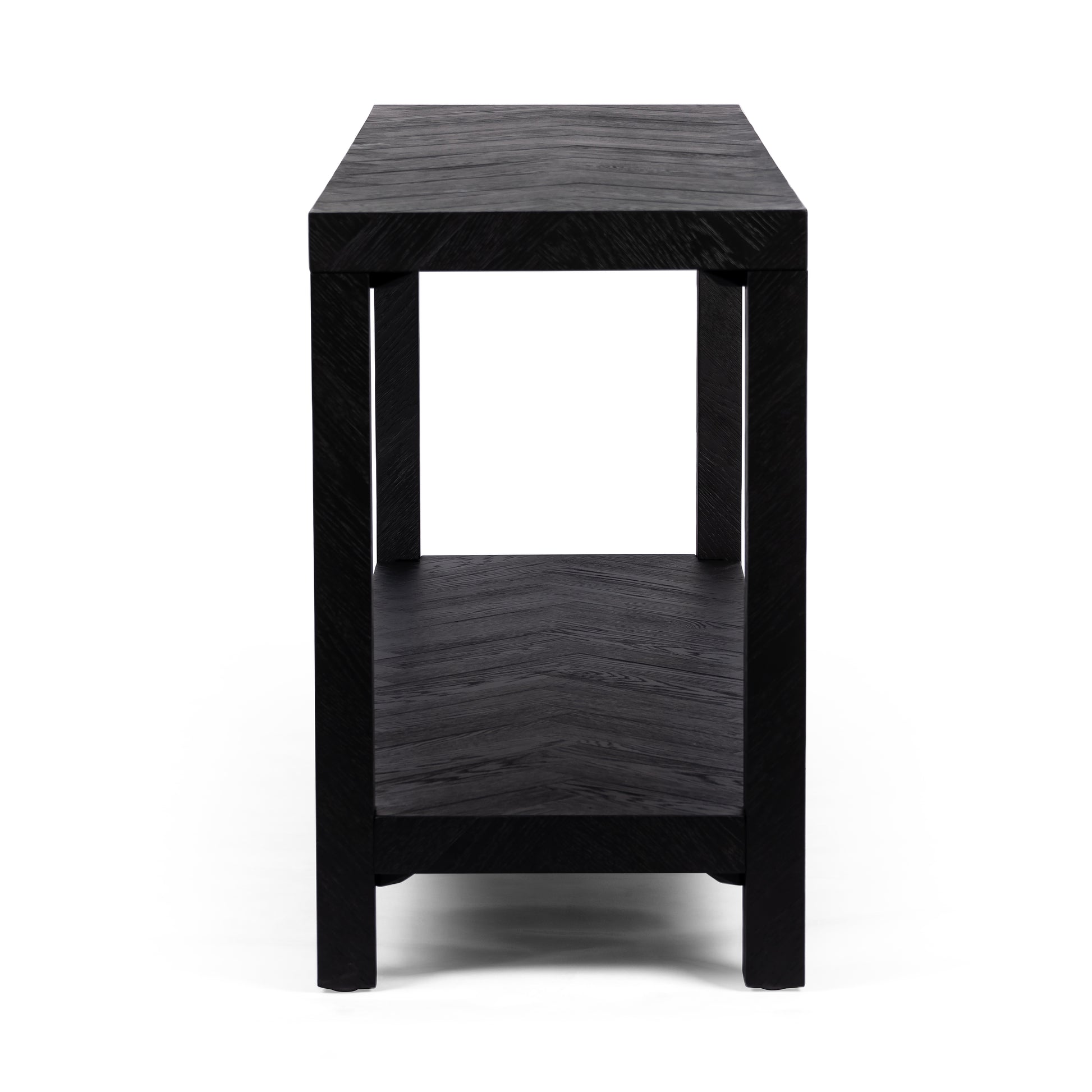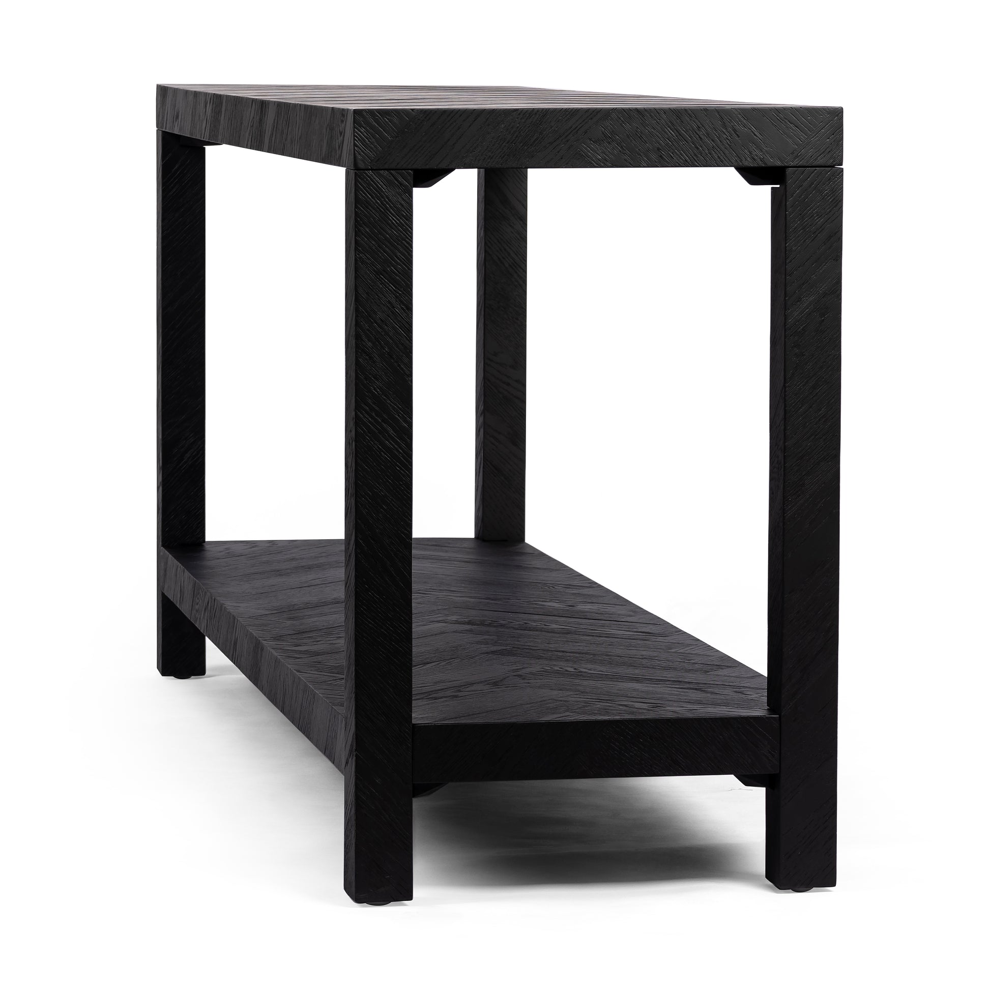The simplest answer is often the right one. This deceptively simple Parsons-style table offers grandly exaggerated dimensions and a subtle, herringbone parquet pattern on every surface.