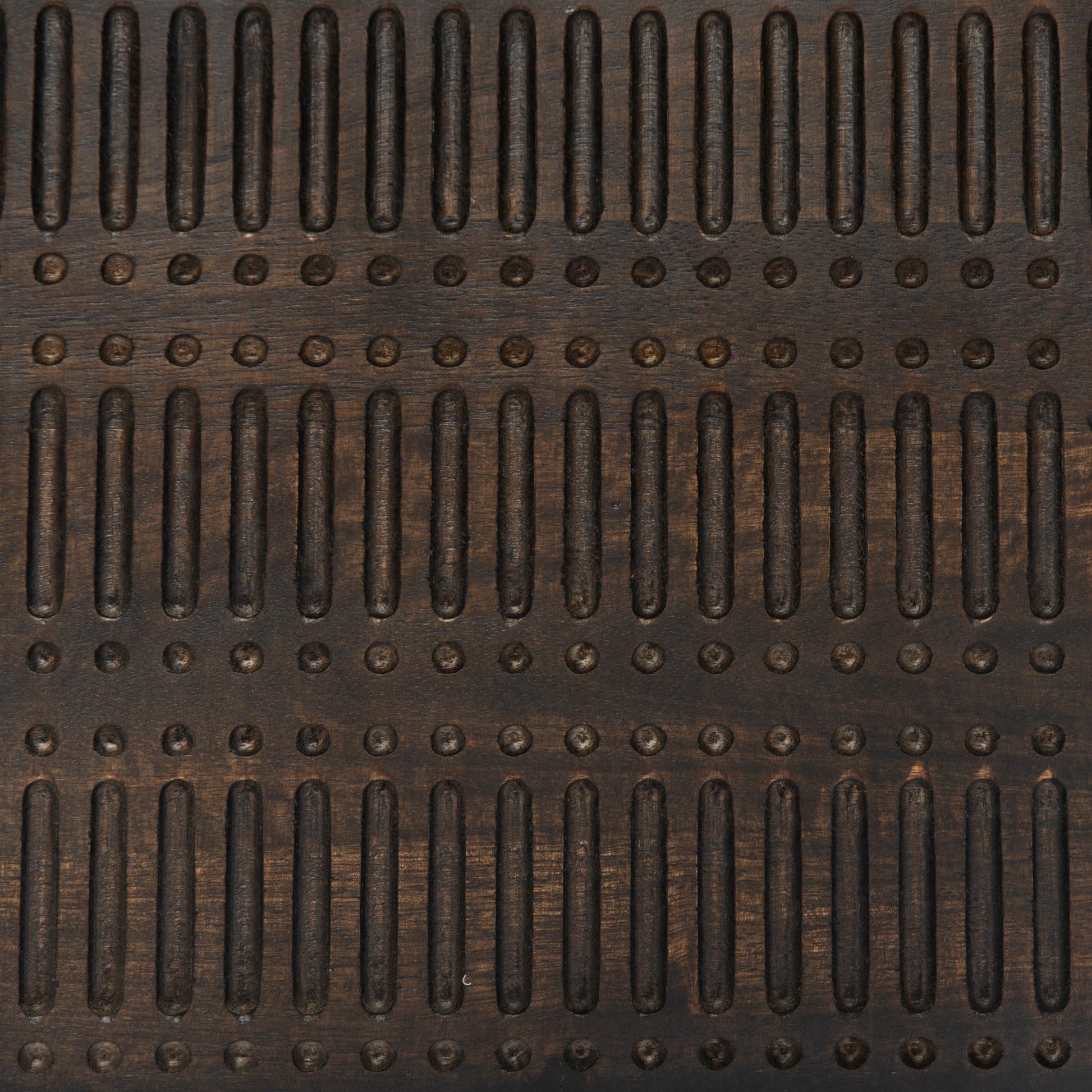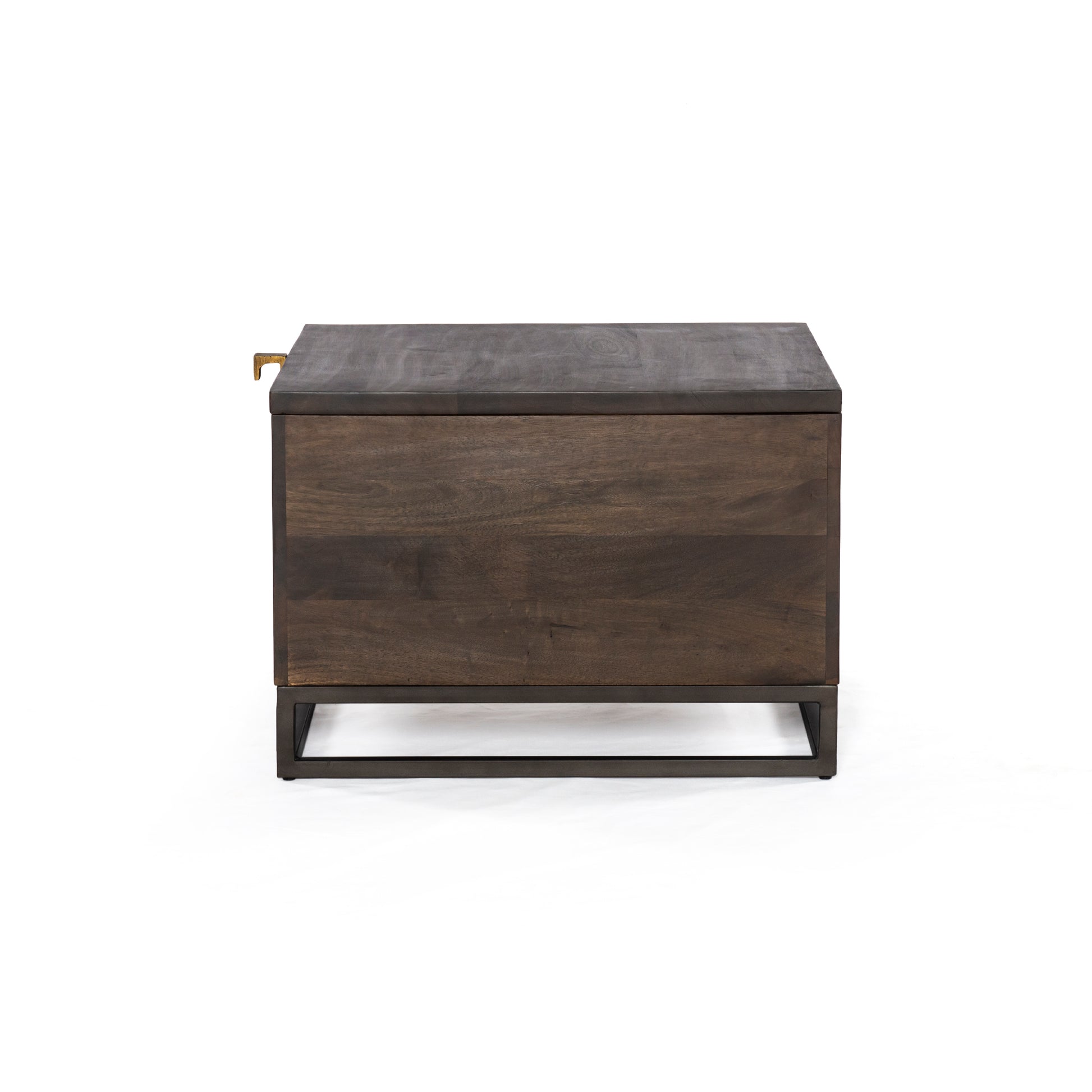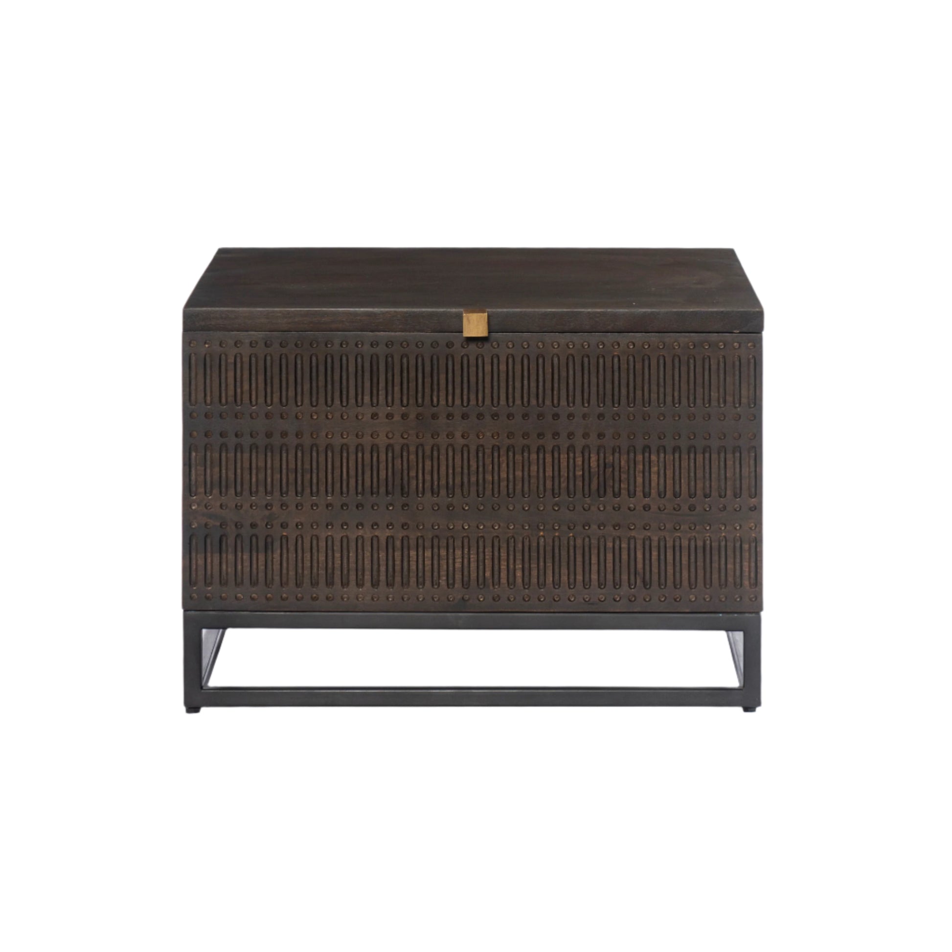 Unique linear carving adopts an artisan slant. Finished in a vintage brown, textural mango wood casing meets a slim iron base. Lift open to reveal spacious trunk-style storage. Perfect in pairs.
