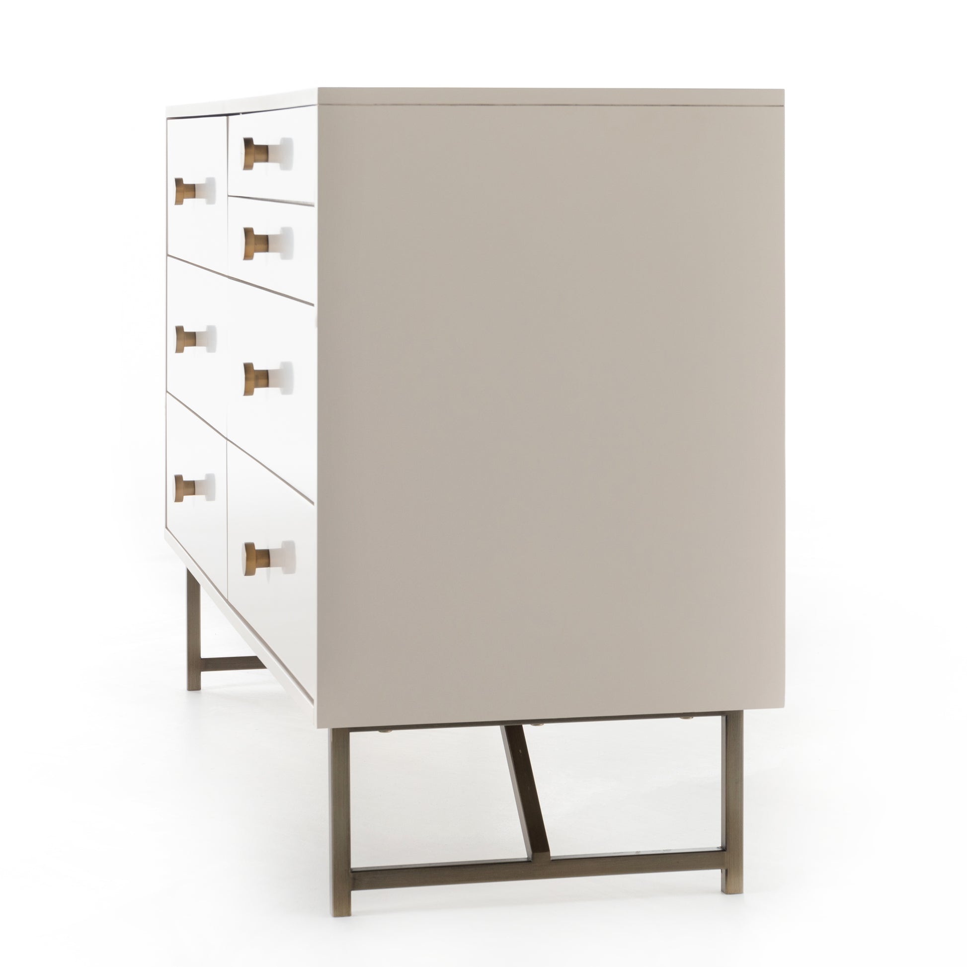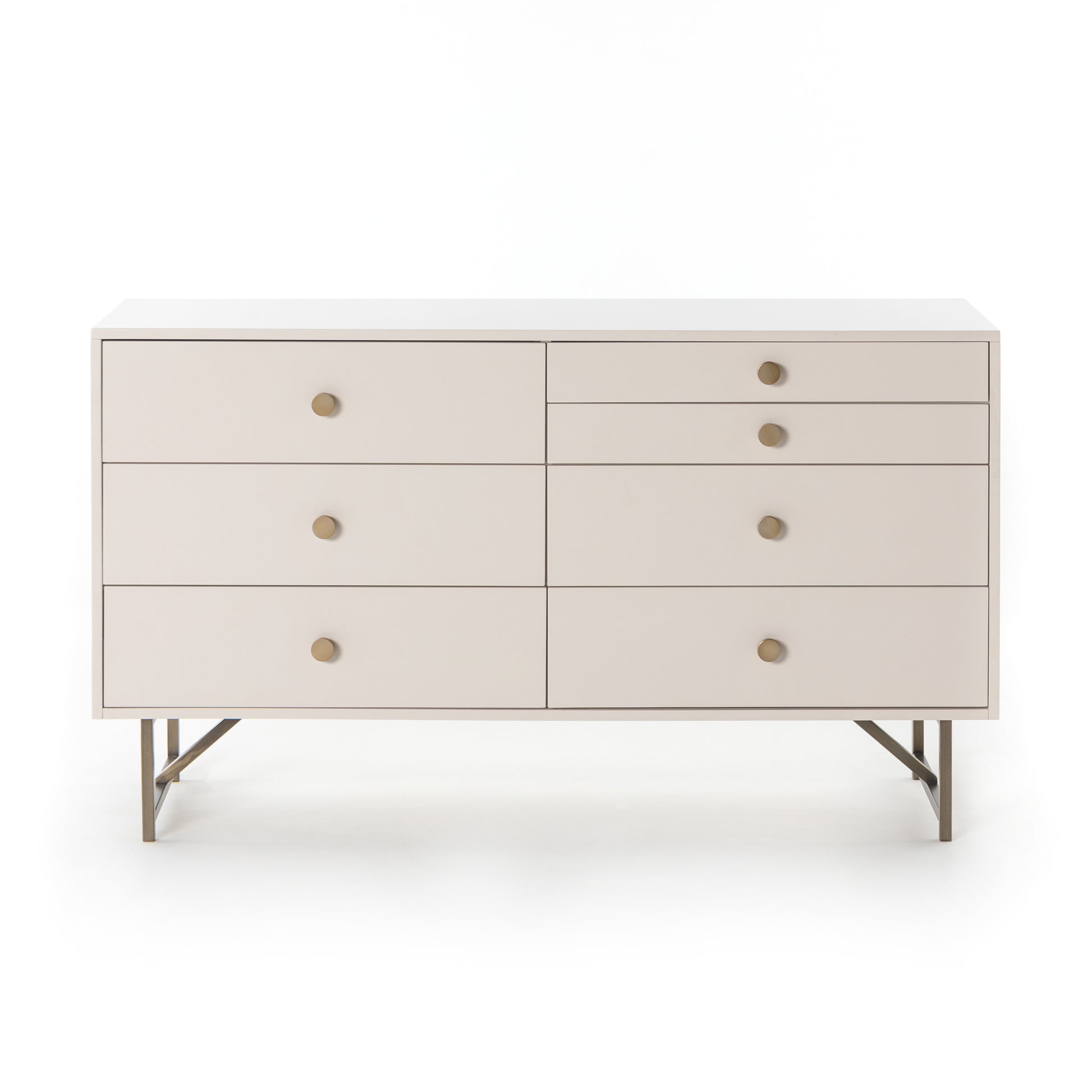 Finished in a dreamy off-white, an engineered hardwood dresser features five spacious drawers plus two smaller velvet-lined ones, perfect for storing jewelry and accessories. Aged brass-finished hardware and stainless steel base for a touch of contrast.