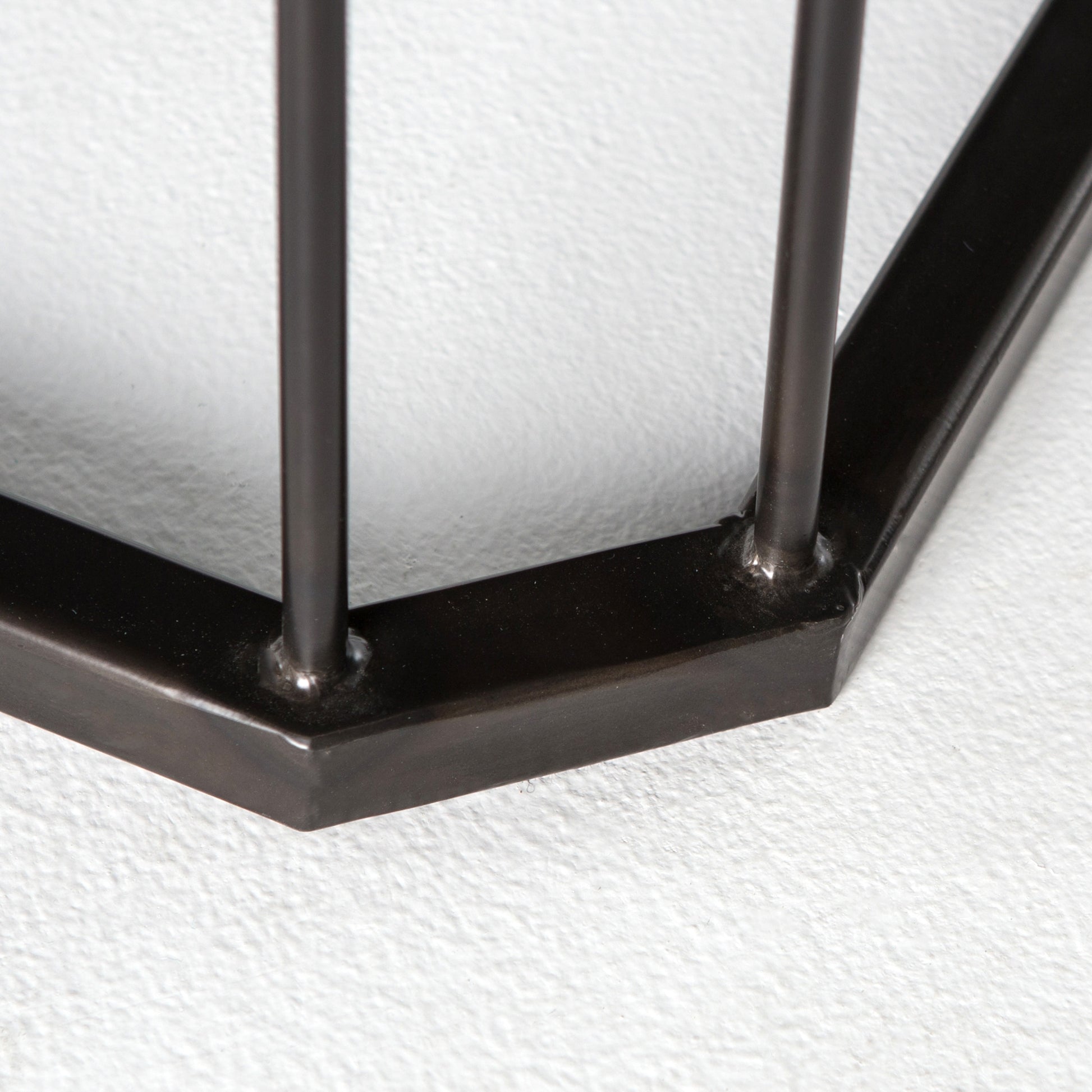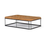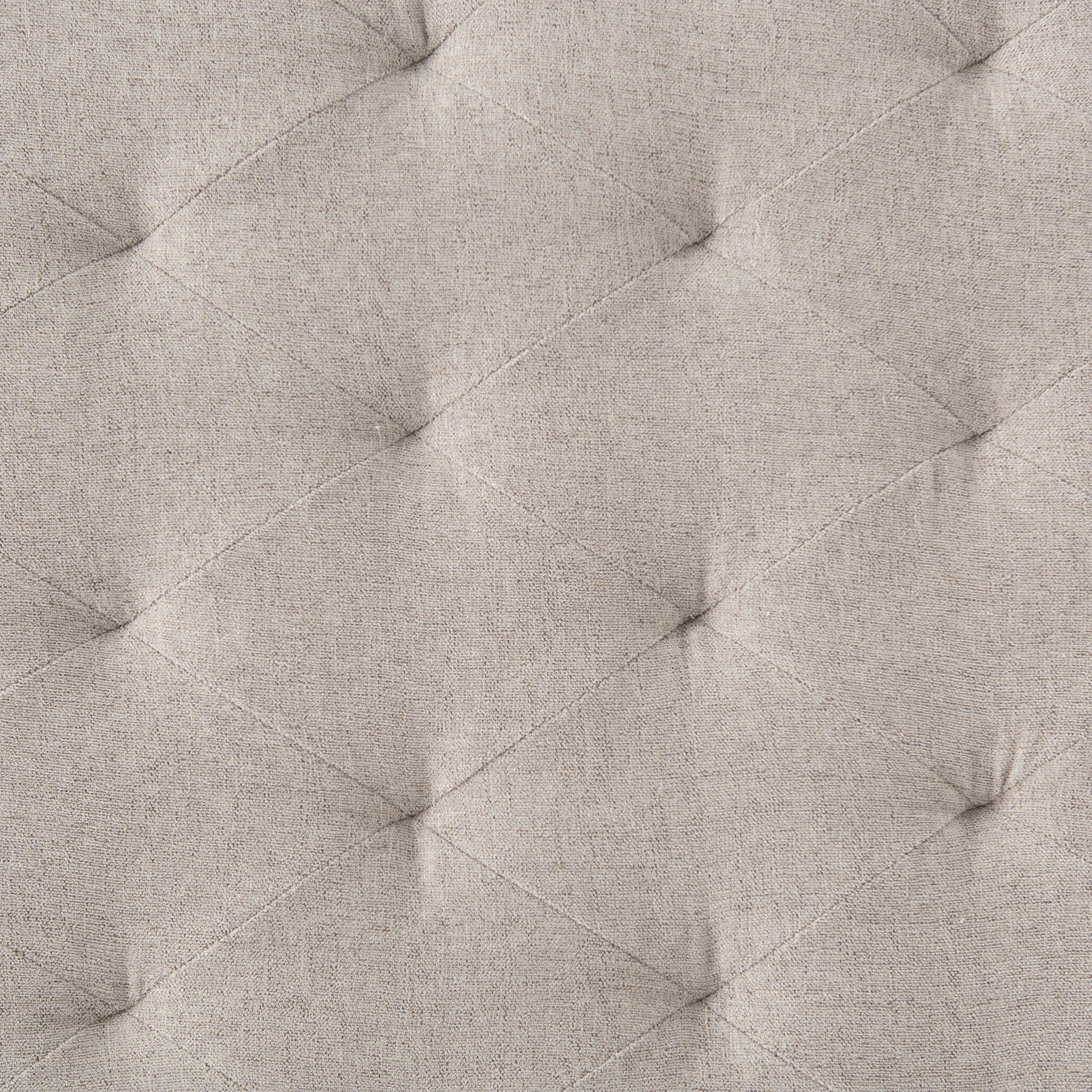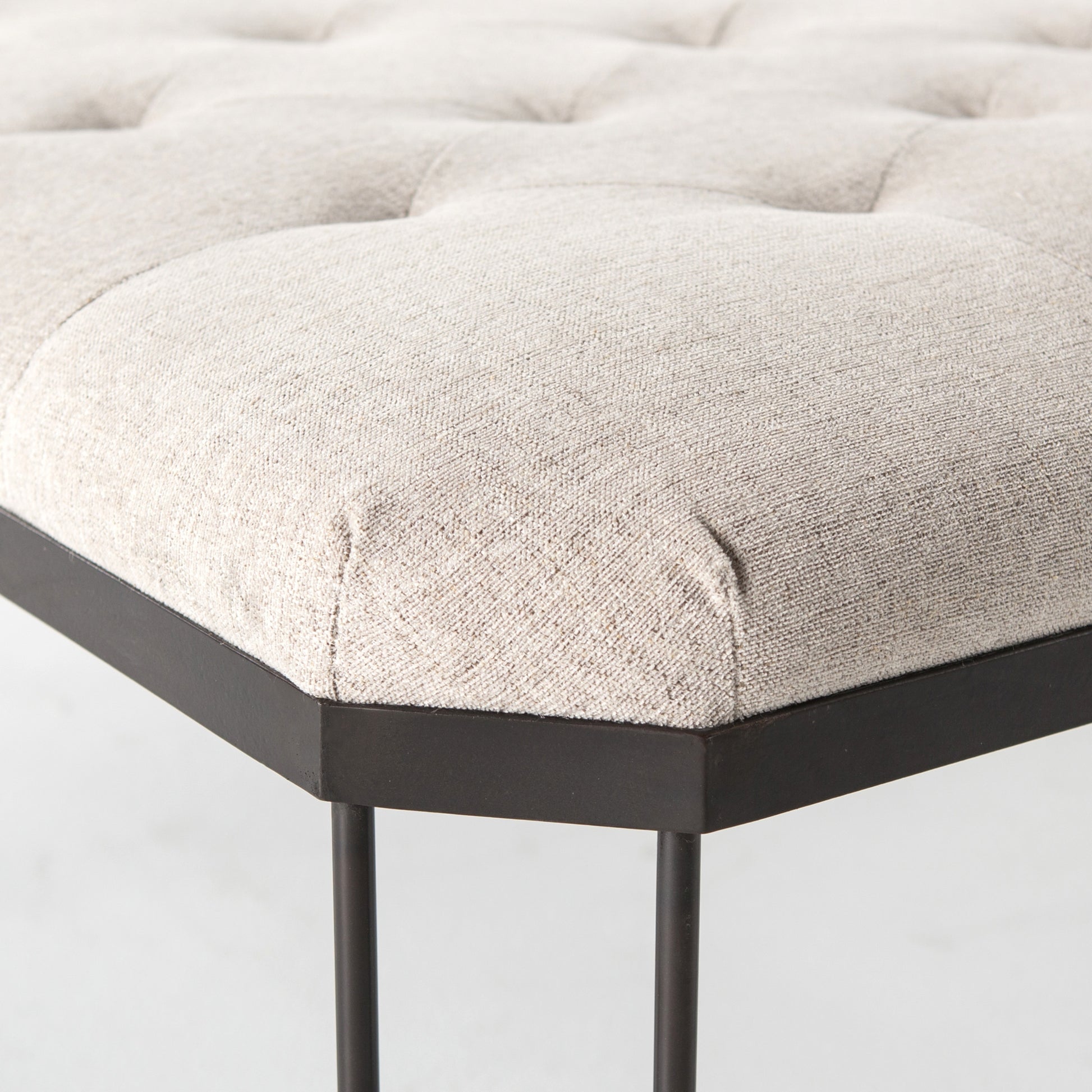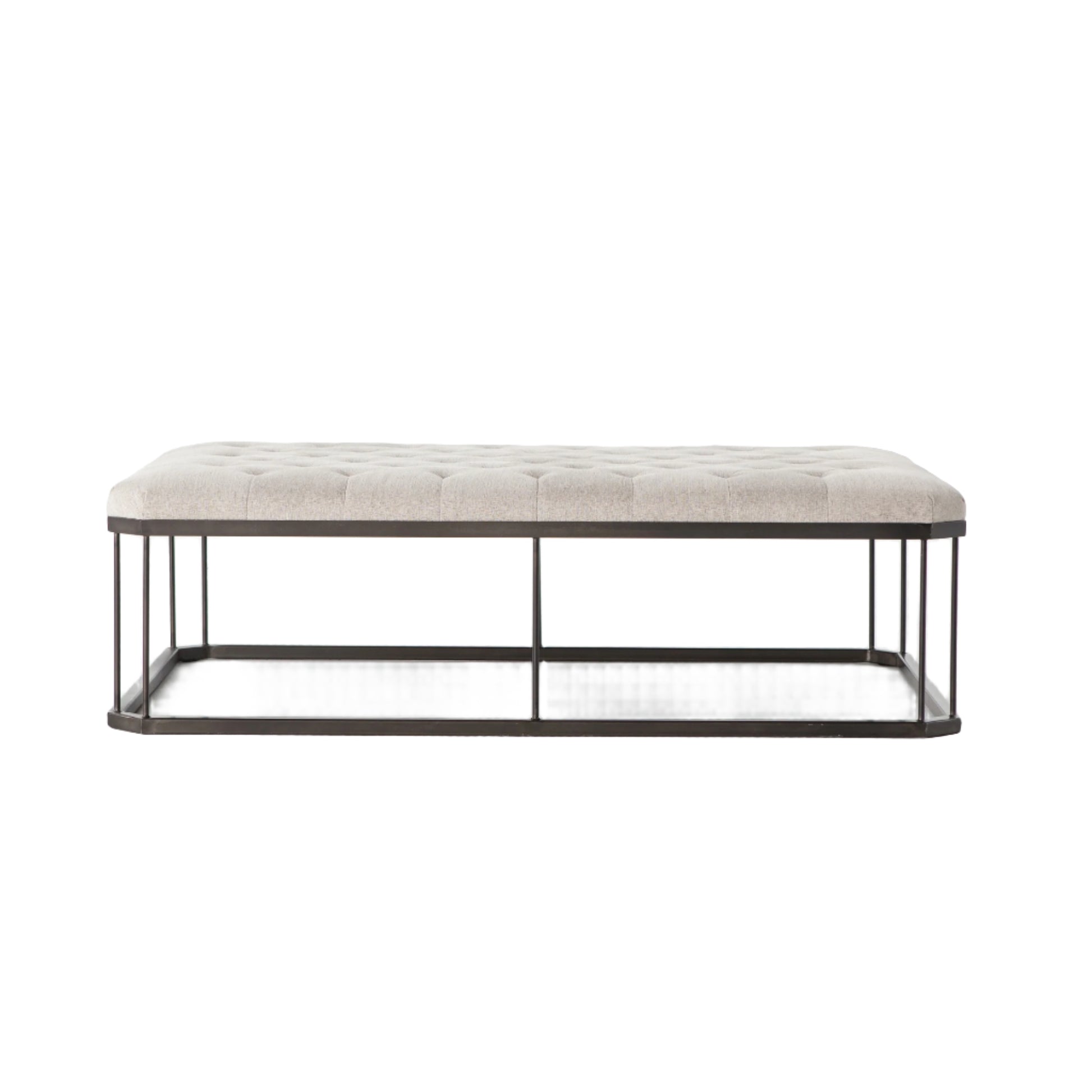 A new take on the ottoman intrigues with dramatic diamond-tufting, angled corners, and an open iron base. Great as a coffee table, too.