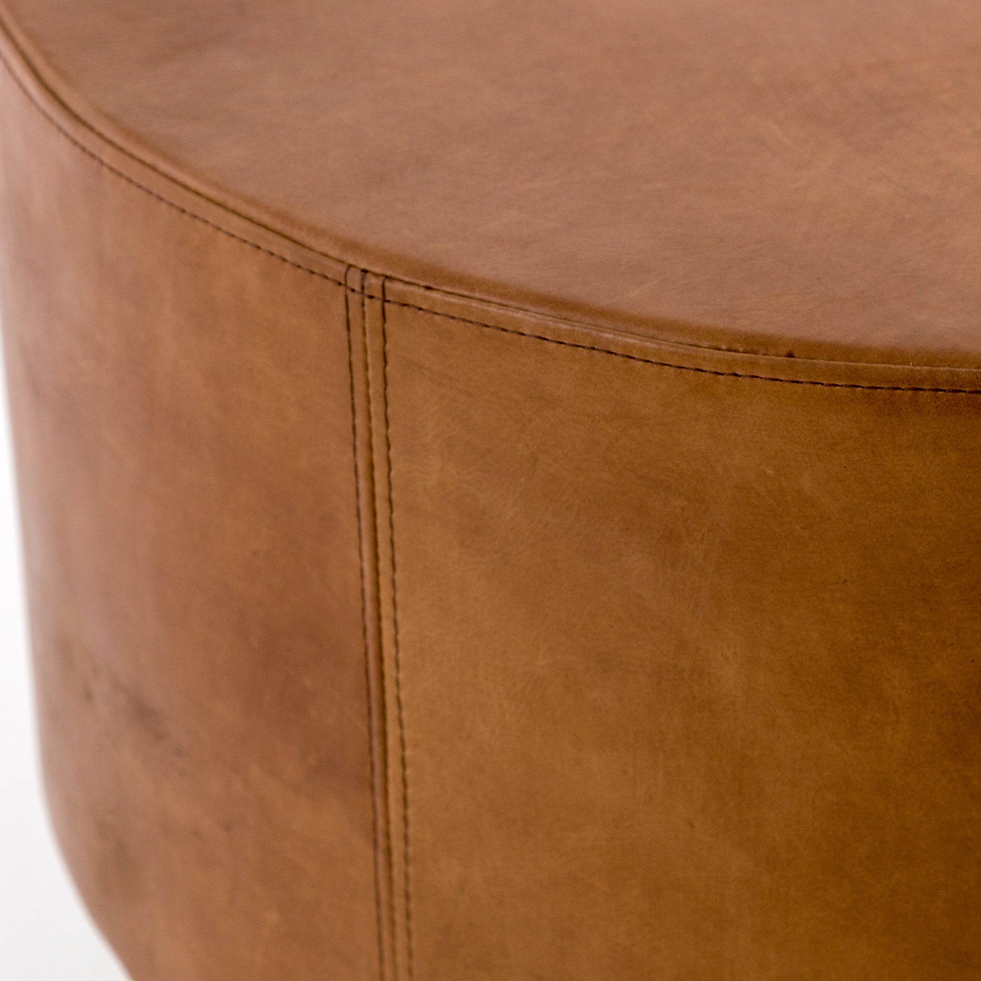 Details add depth to a deceptively simple shape. Hand-stitched copper leather offsets a bright brass base with rivet detail for a striking material mix and mid-century spirit. Perfect in pairs as the new alternative to the traditional coffee table.