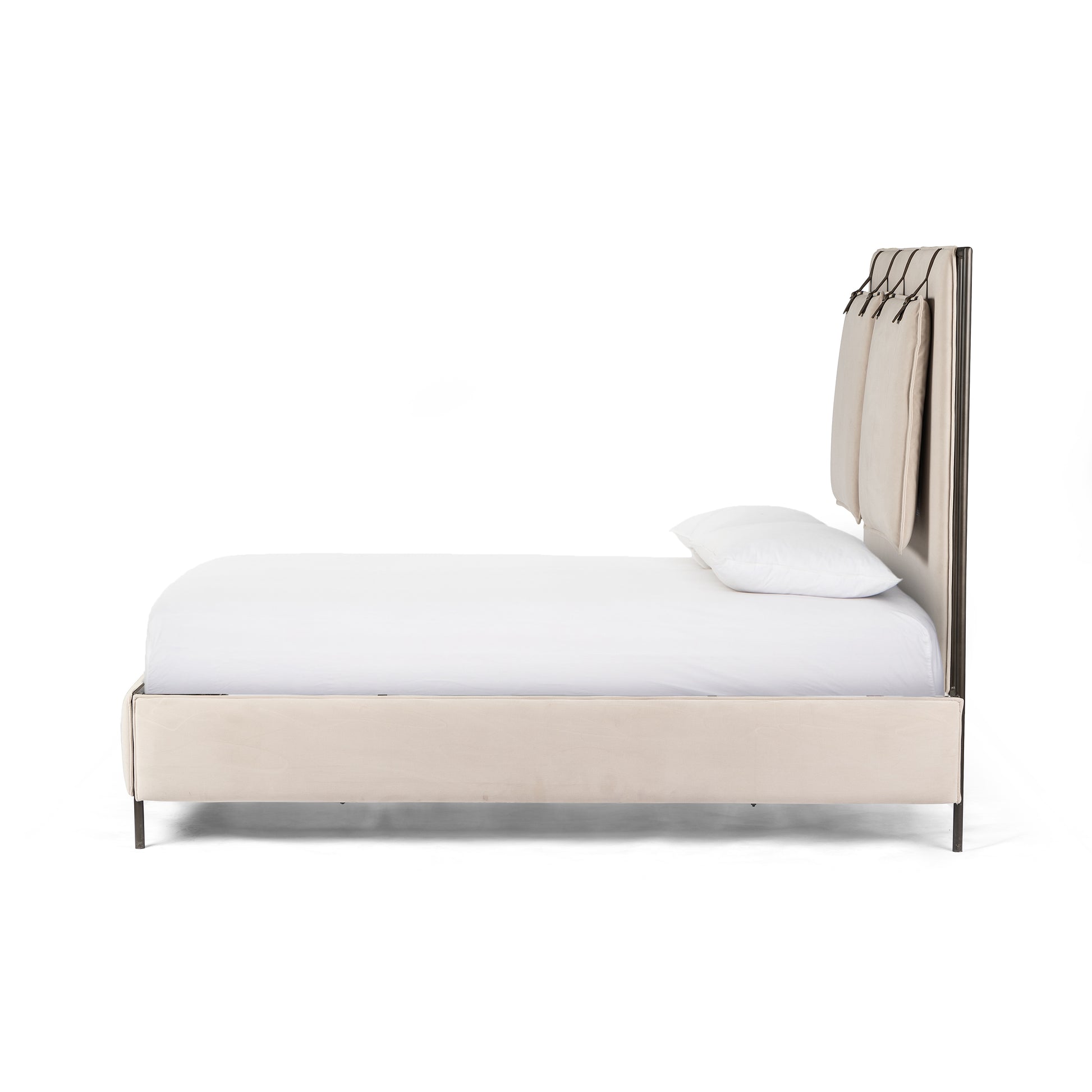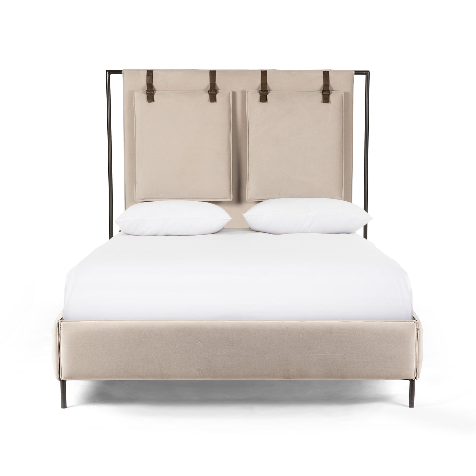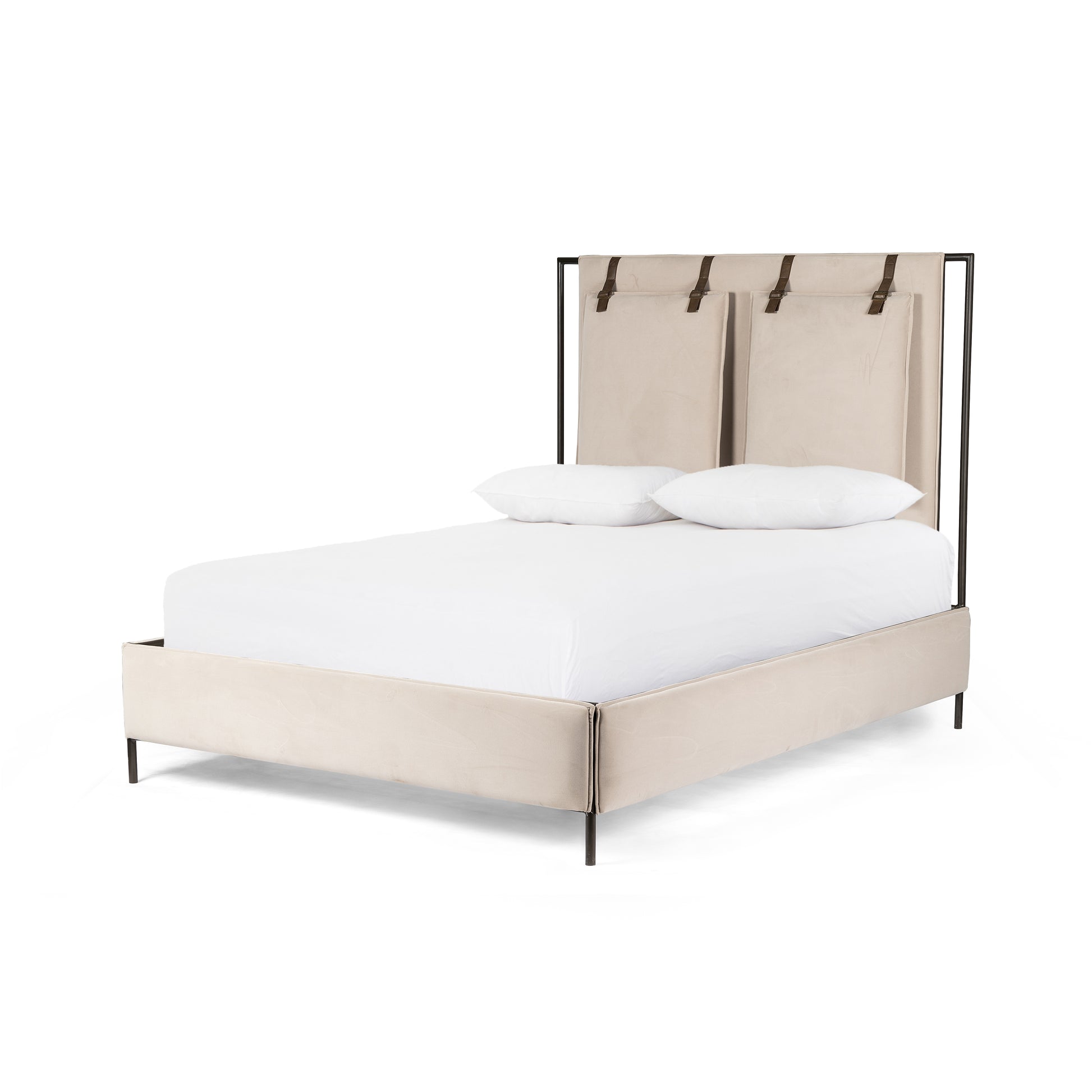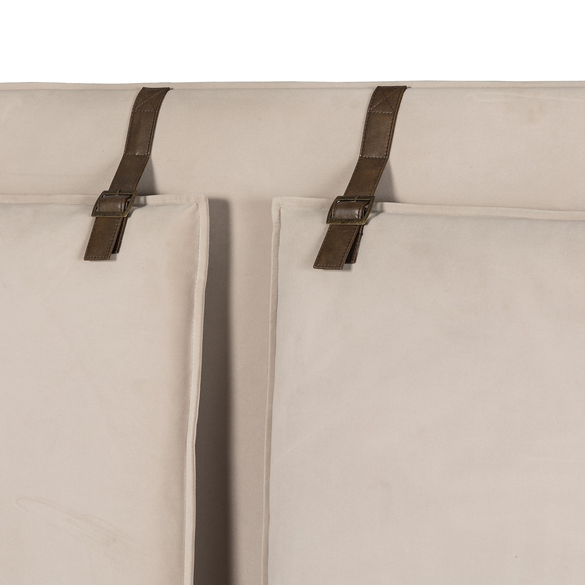 Safari styling gets a modern reboot. Velvety polyester brings softness to this forward-thinking bedroom look. Brown leather straps secure decorative headboard pillows, suspended for eye-catching effect. Box spring required. This bed is not compatible with an adjustable mattress.