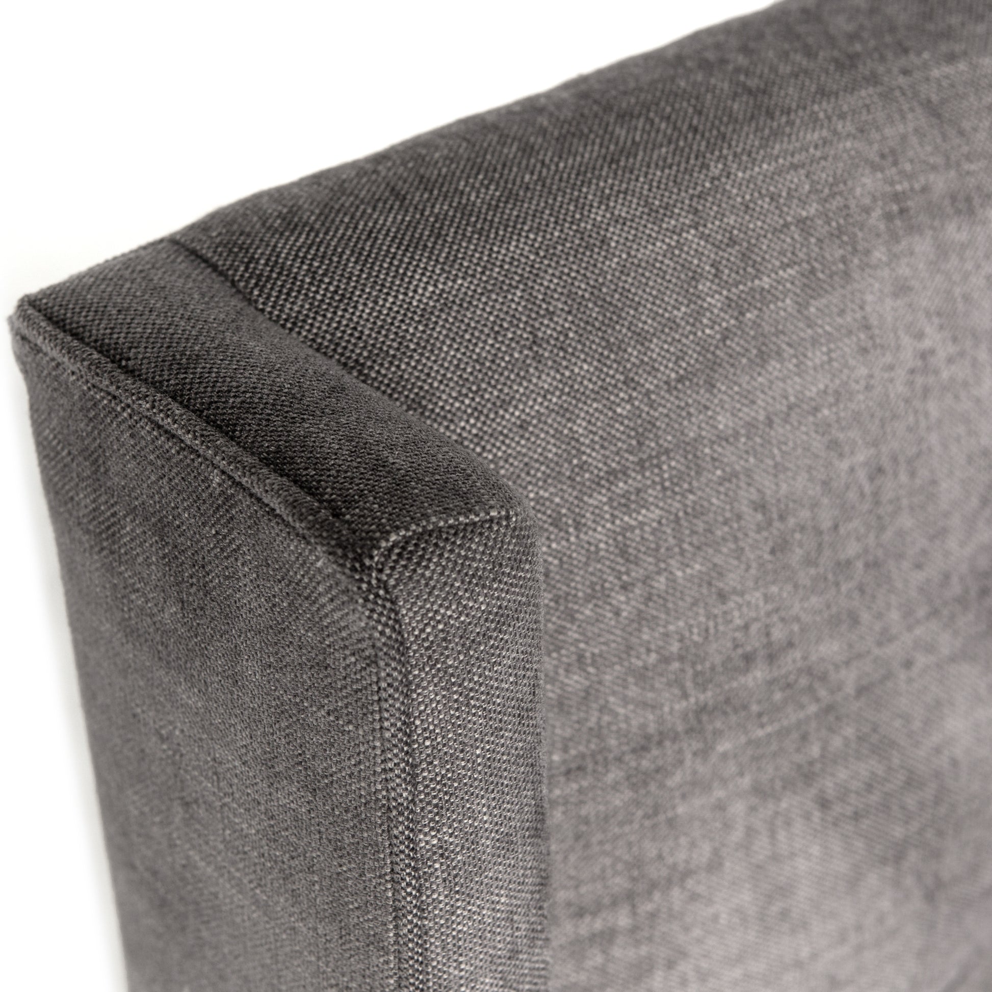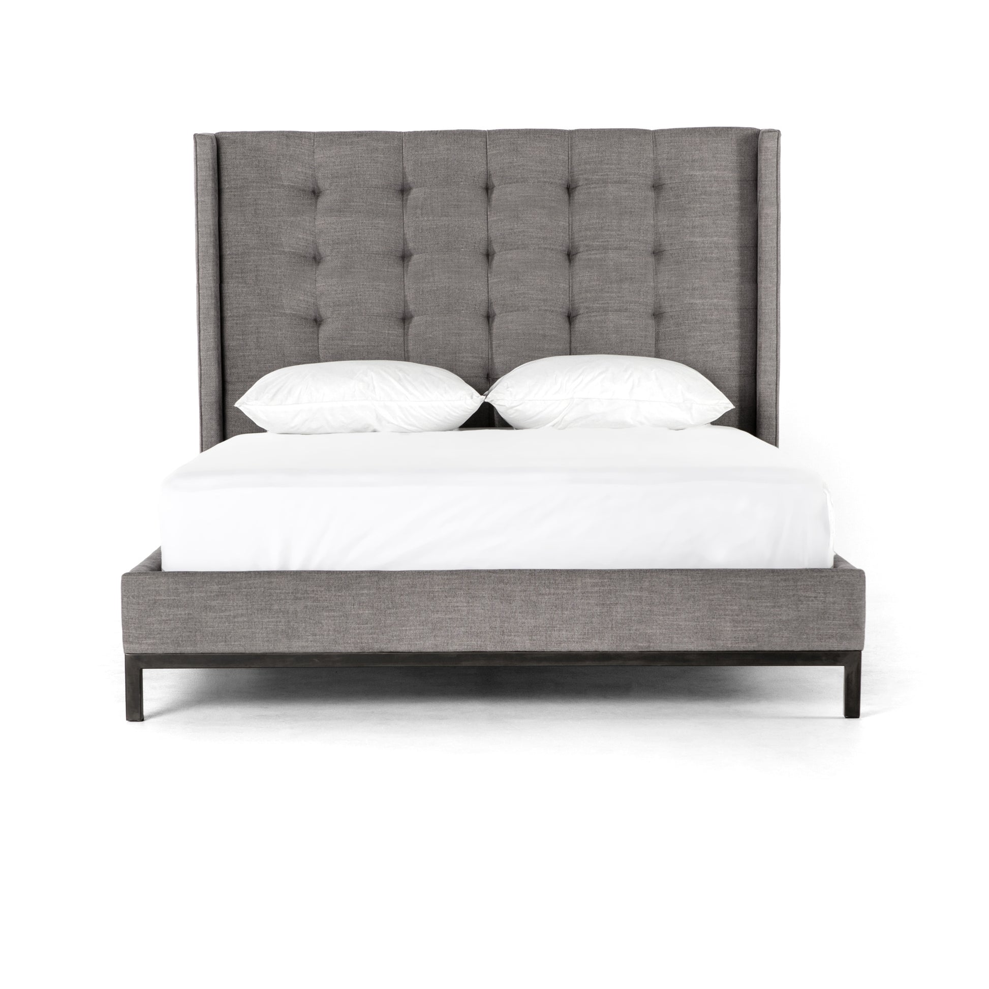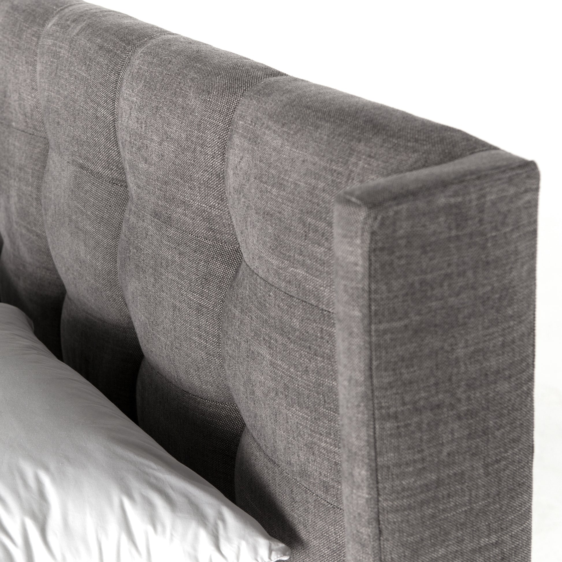 Subtle, modern elegance. A high, tufted headboard in a fashion-forward grey pairs with a simple gunmetal iron base. Performance fabrics are specially created to withstand spills, stains, high traffic and wear, ensuring long-term comfort and unmatched durability. This bed is not compatible with an adjustable mattress.