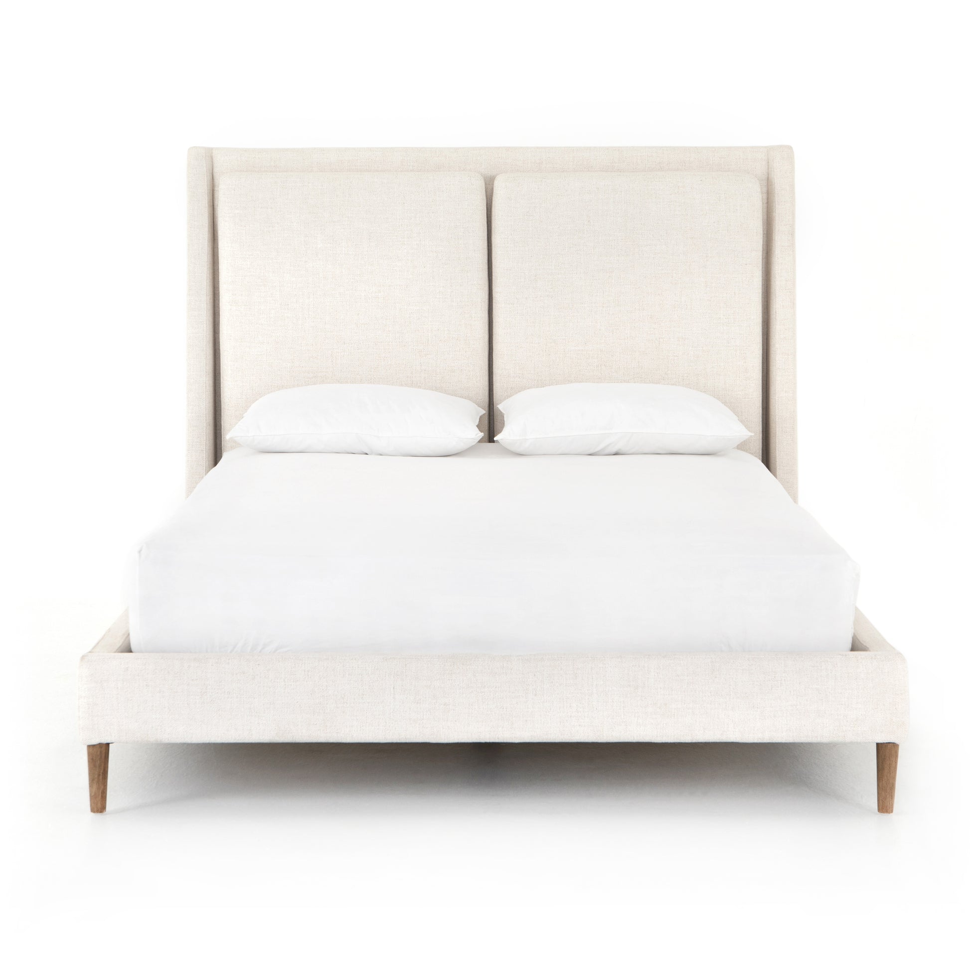 Light, livable luxury. Upholstered in a cream linen-blend, a tapered headboard features fixed overscale pillows, for a calming look with great depth. Wire-brushed parawood legs lend a warm, natural finishing touch. Performance fabrics are specially created to withstand spills, stains, high traffic and wear, ensuring long-term comfort and unmatched durability. This bed is not compatible with an adjustable mattress.