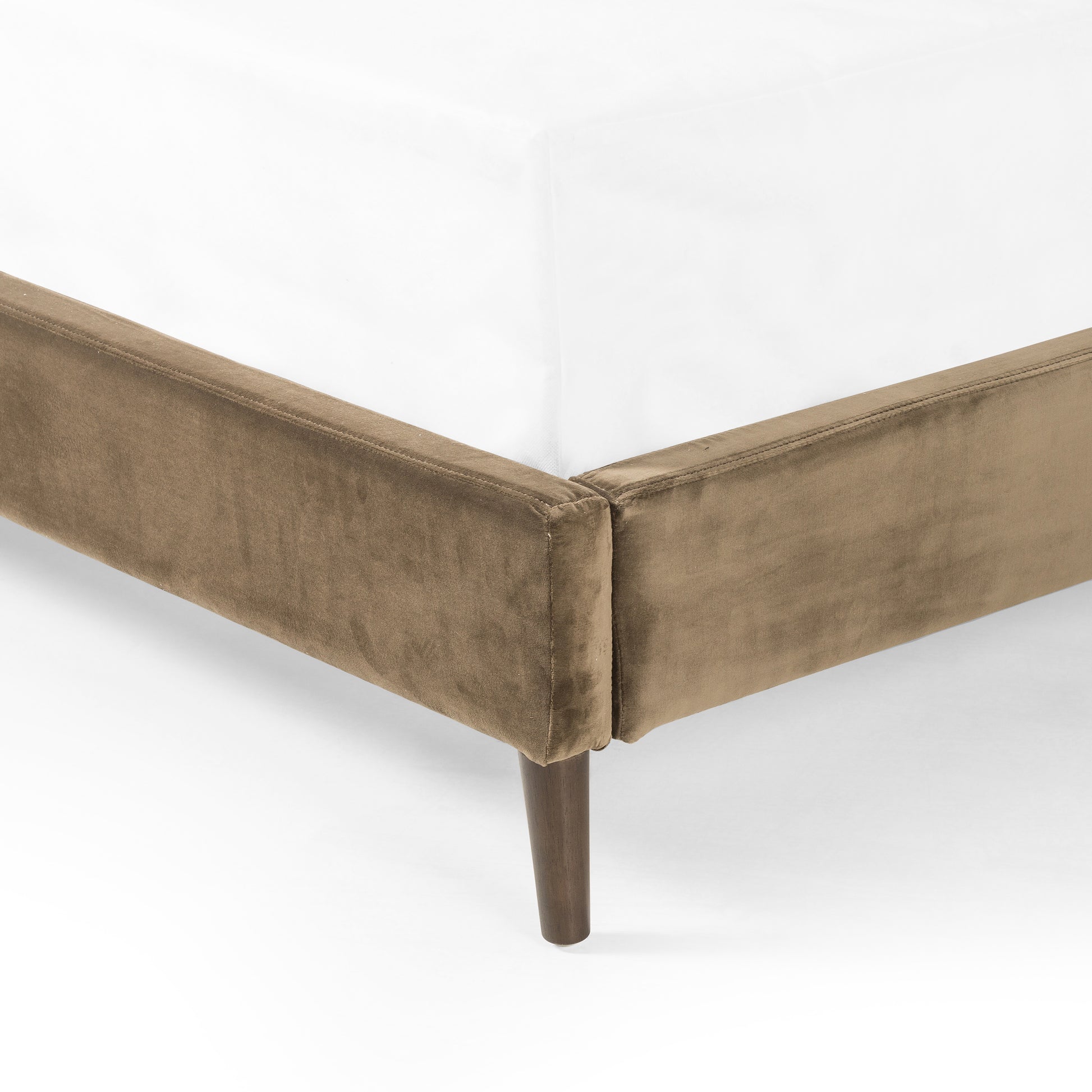 Upholstered in a velvety olive with subtle highs and lows that change in appearance depending on the direction of the fabric's nap. Fixed headboard cushioning for adds texture and comfort, while tapered oak legs lend a low-profile look.