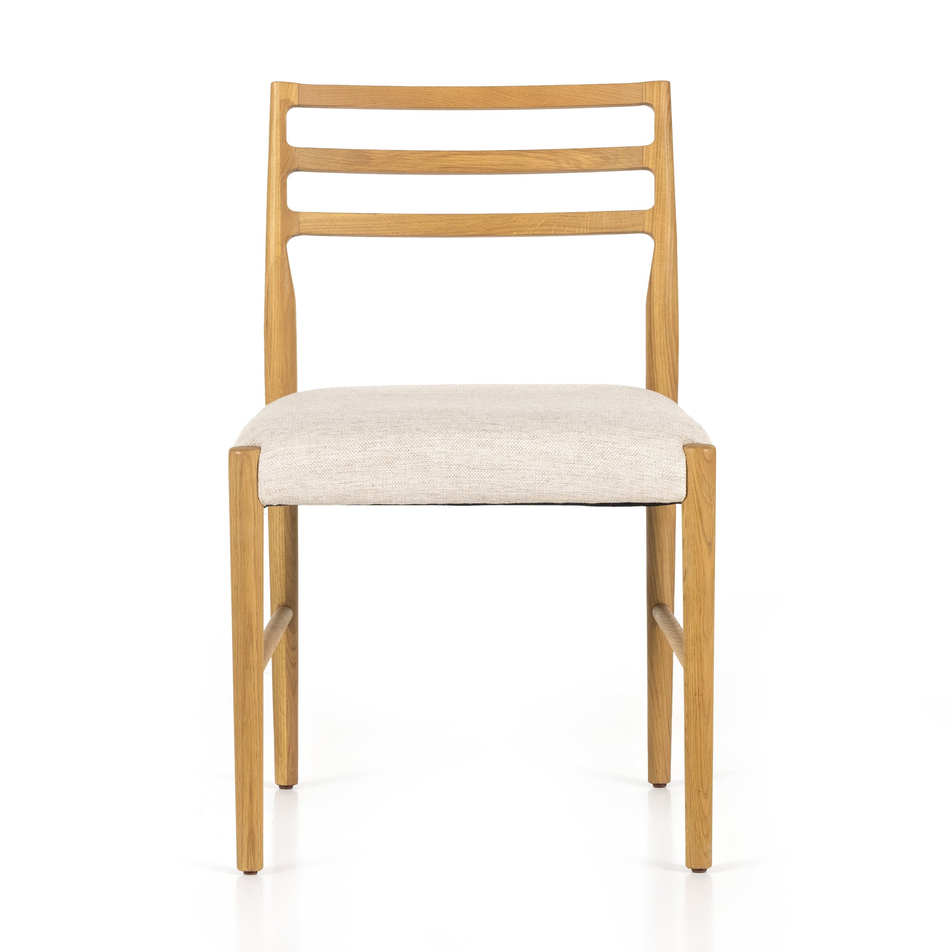 Textured materials redefine the classic ladderback chair. Buff oak finished framing for a clean, open look with natural depth. Woven seating blends cotton with linen for a textured feel and comfortable sit.