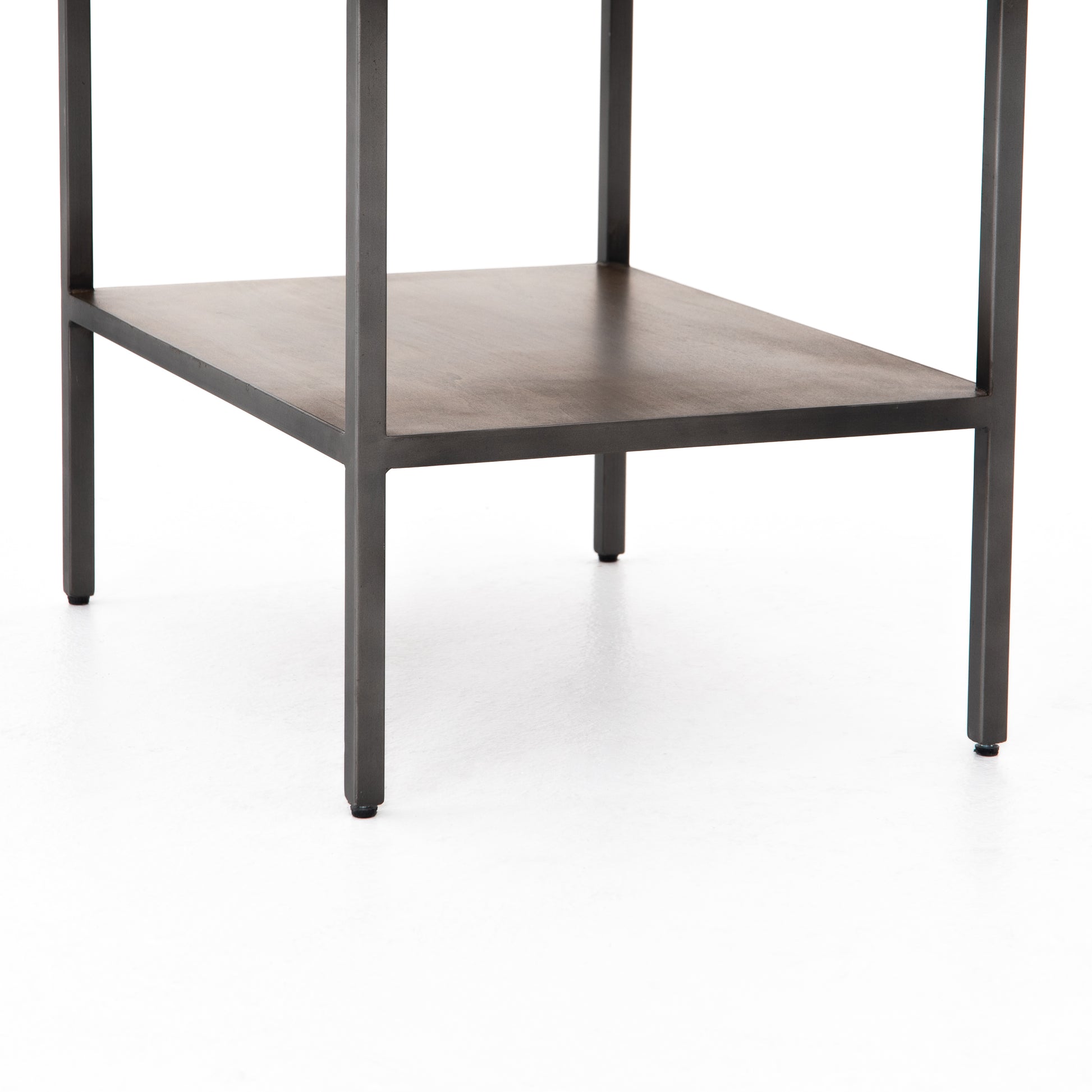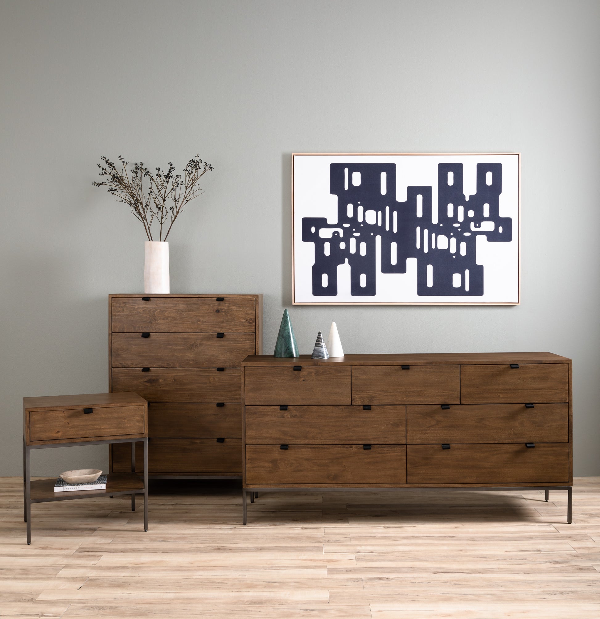 Inspired by clean mid-century design, a stylish nightstand of solid auburn-finished poplar brings extra space to bedside storage. Metal-secured leather pull adds a textural element of surprise.