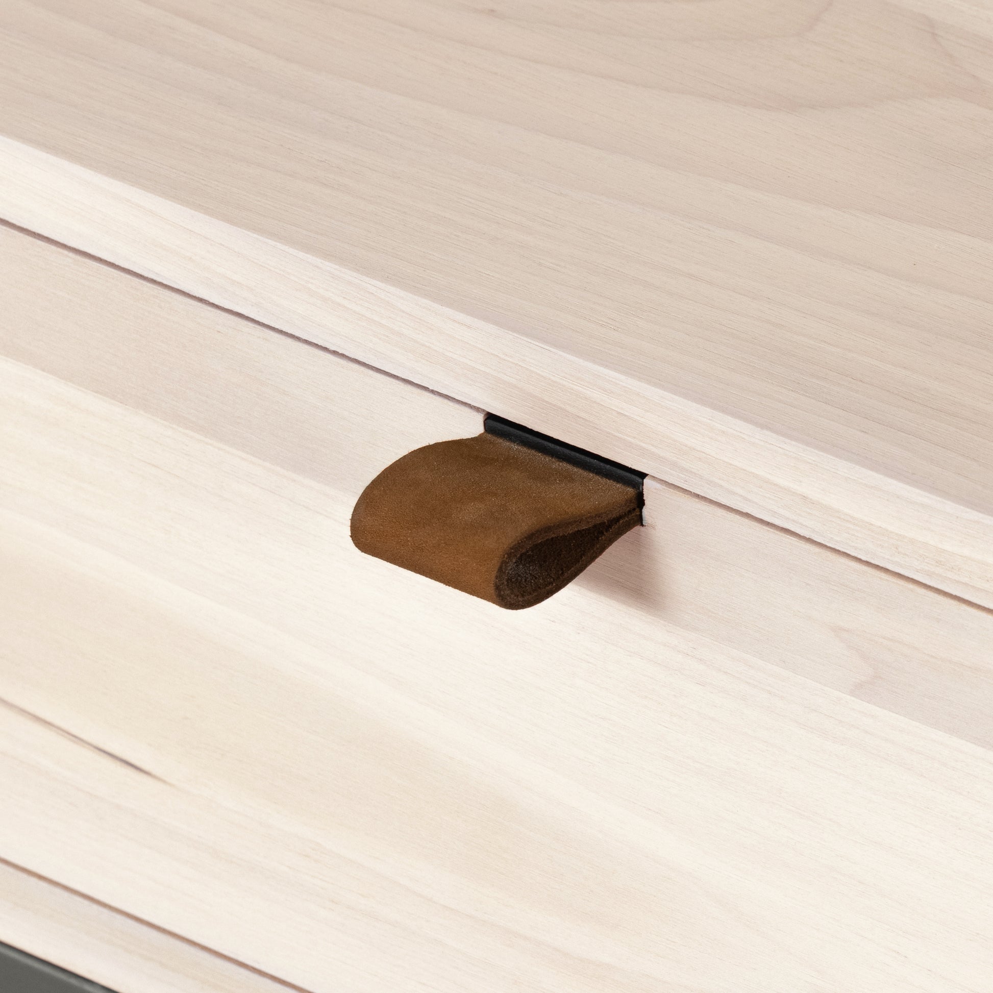 Inspired by clean midcentury design, a stylish nightstand of light-washed solid poplar brings extra storage space to the bedside. A metal-secured top-grain leather pull adds a textural element of surprise.