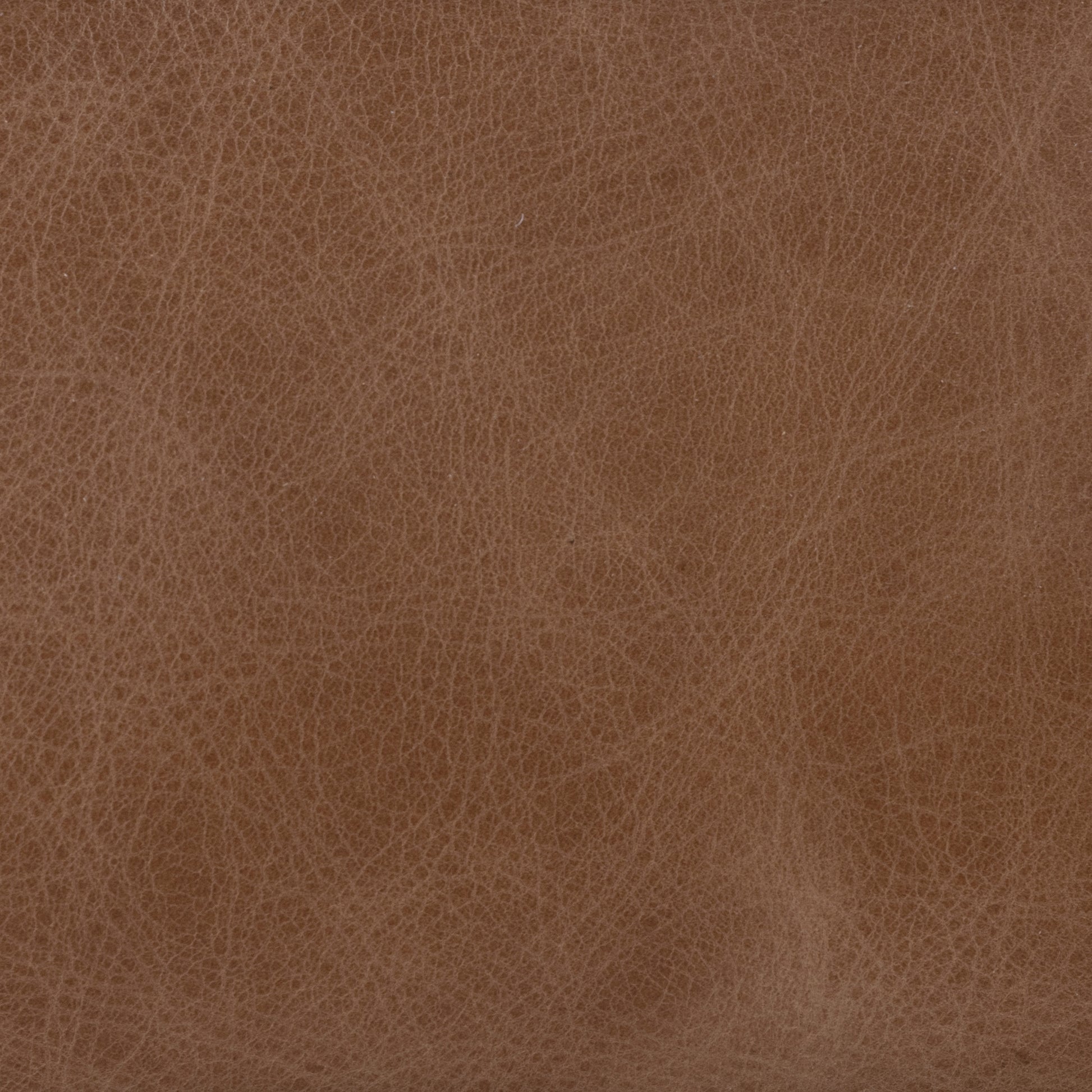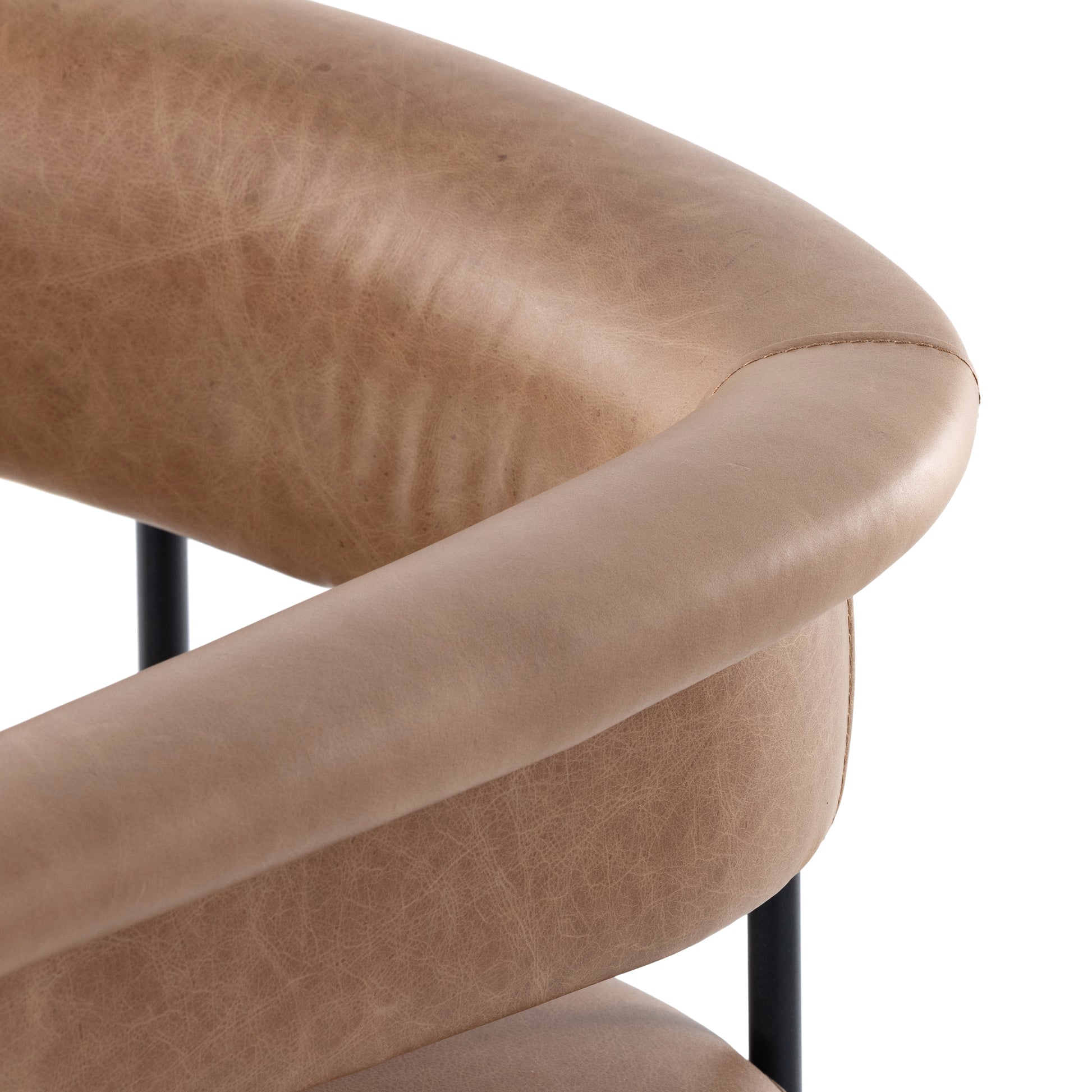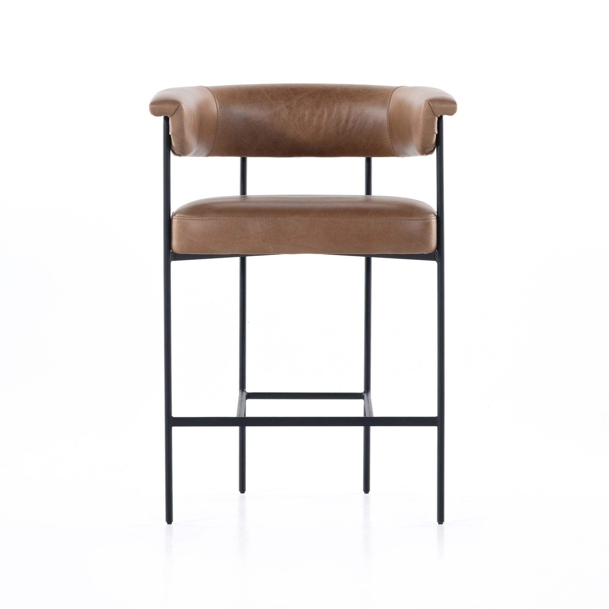 Airy and light with slim, matte black-finished iron framing, tan top-grain leather lends sleekness to a beautifully sculpted counter style featuring a yoke back and exterior fold detailing.