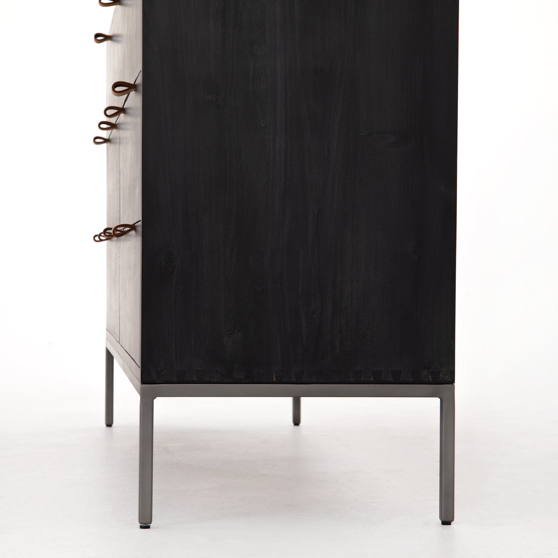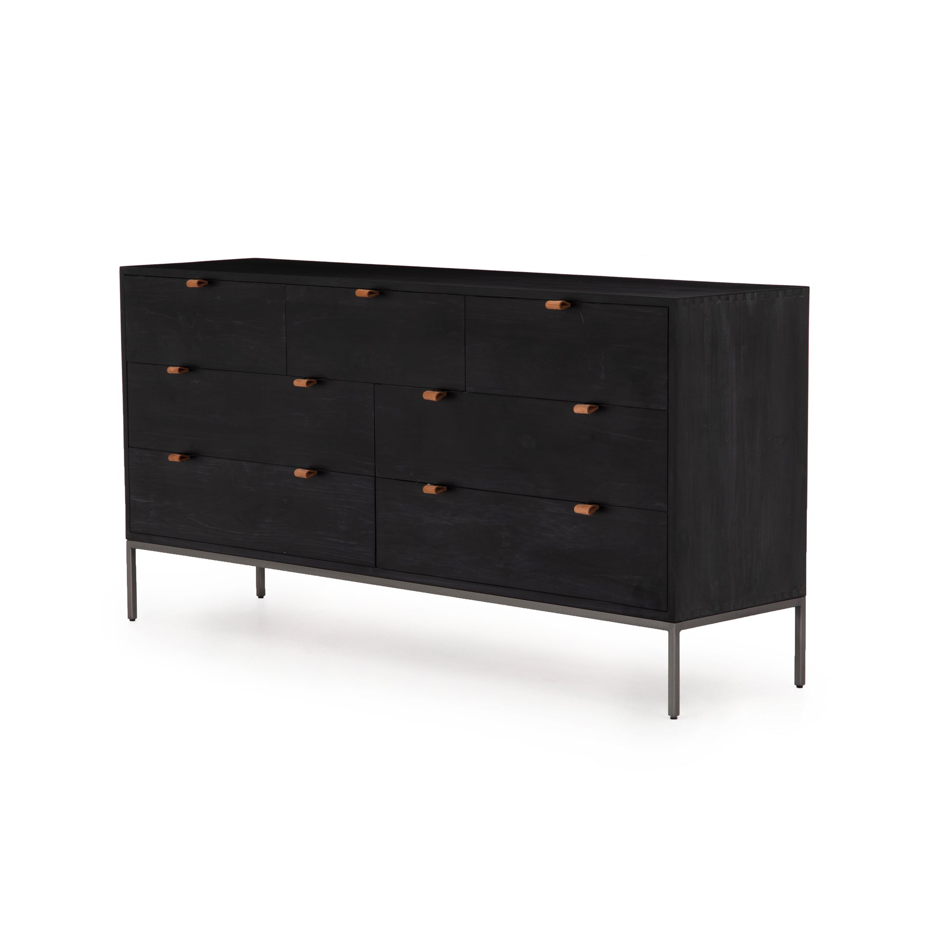 Inspired by clean mid-century design, a stylish dresser of black-washed poplar offers plenty of bedroom storage space thanks to seven spacious drawers. Metal-secured leather pulls add a textural element of surprise.
