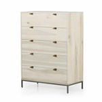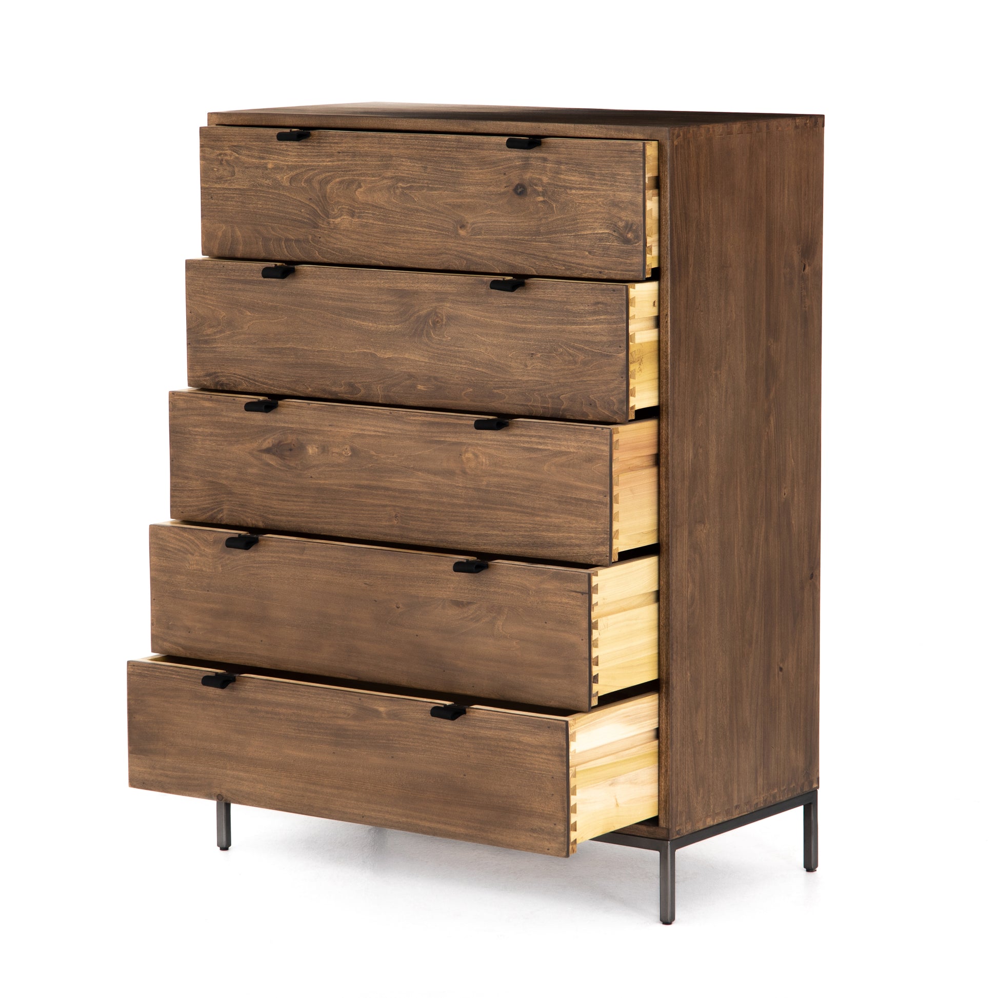Inspired by clean mid-century design, a stylish dresser of auburn poplar offers plenty of bedroom storage space thanks to five spacious drawers. Metal-secured leather pulls add a textural element of surprise.