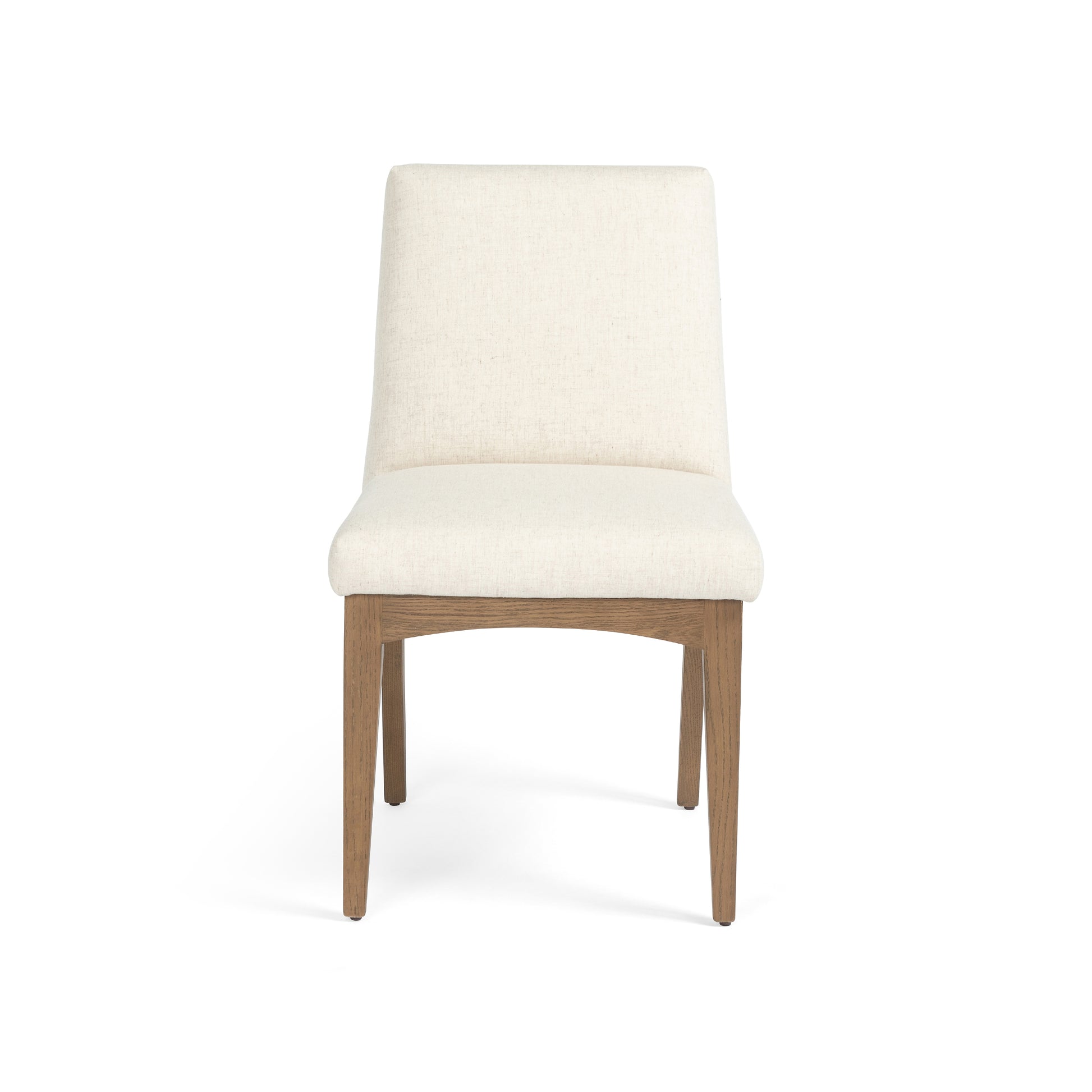 A finely tailored take on dining. Armless honey-colored oak frames performance-grade upholstered seating in an invitingly neutral off-white. Performance fabrics are specially created to withstand spills, stains, high traffic and wear, ensuring long-term comfort and unmatched durability.
