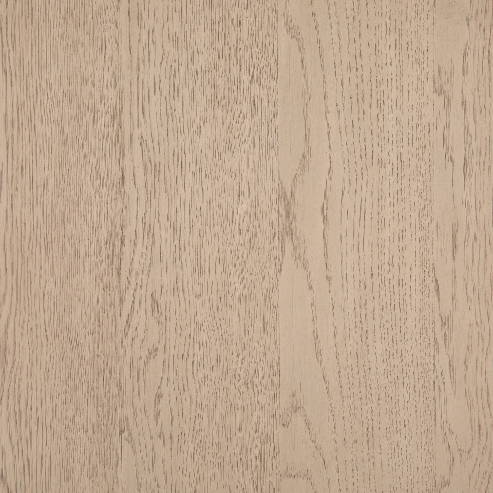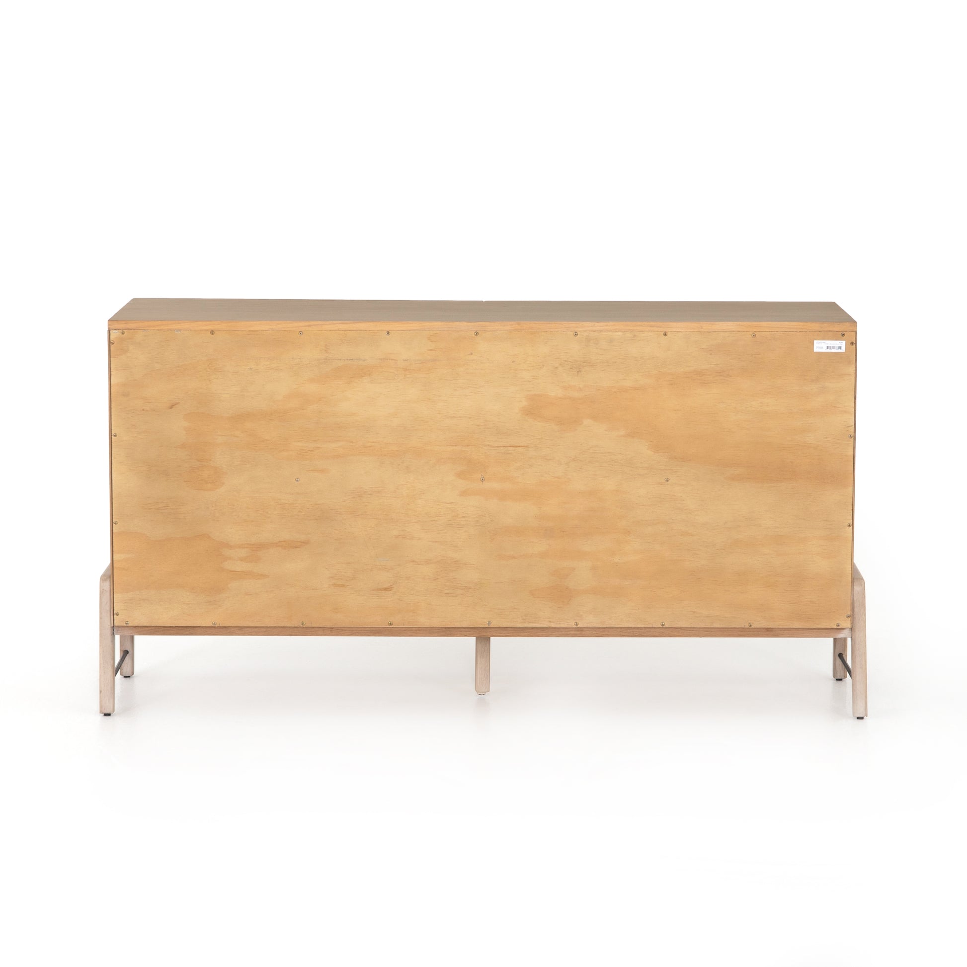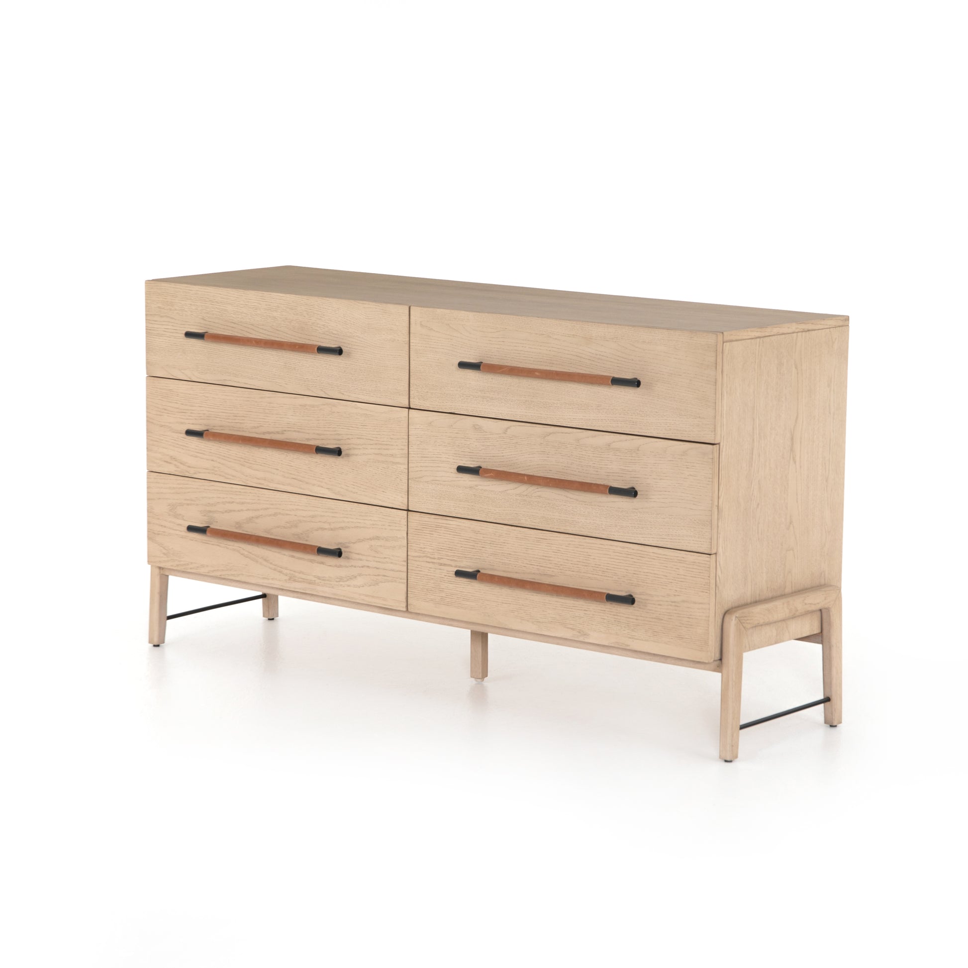 Light-finished oak forms a clean silhouette for six spacious drawers with iron hardware wrapped in tan top-grain leather.