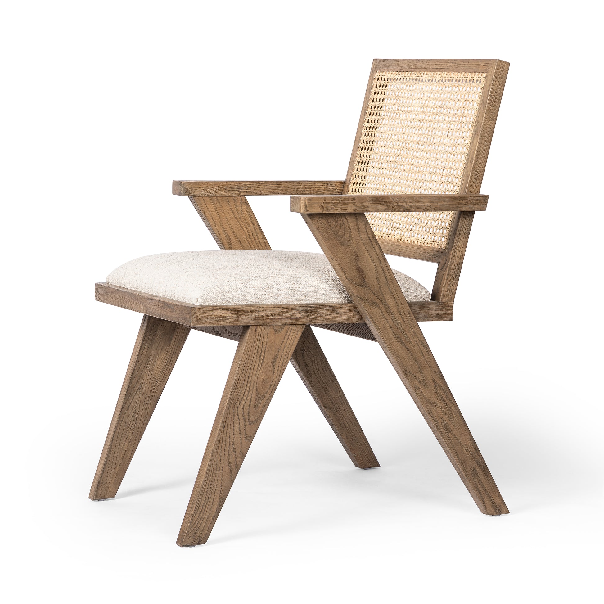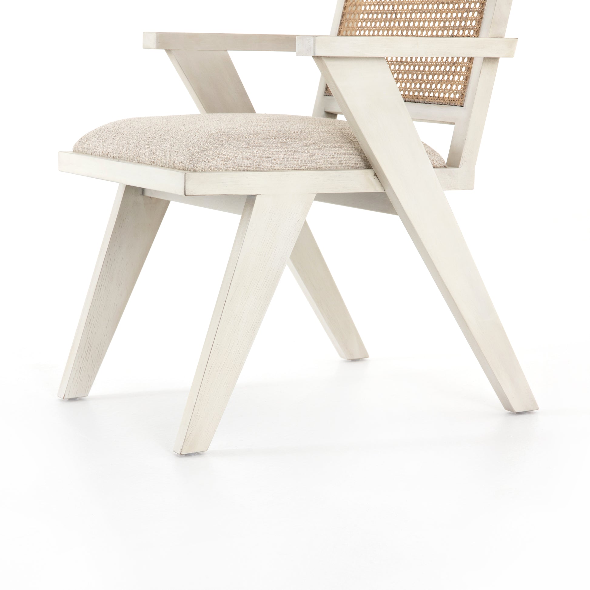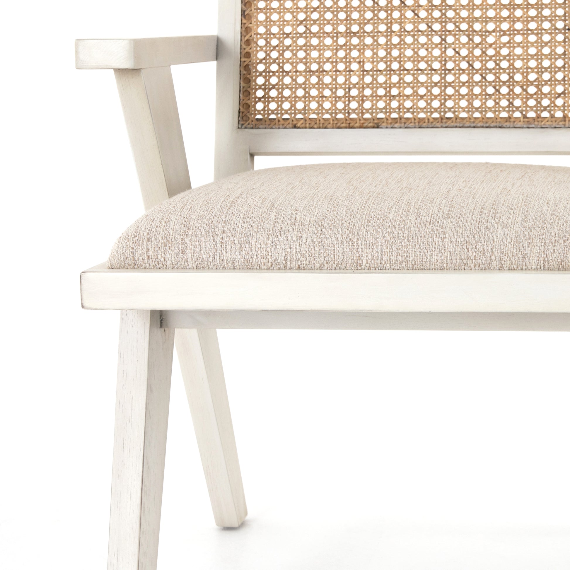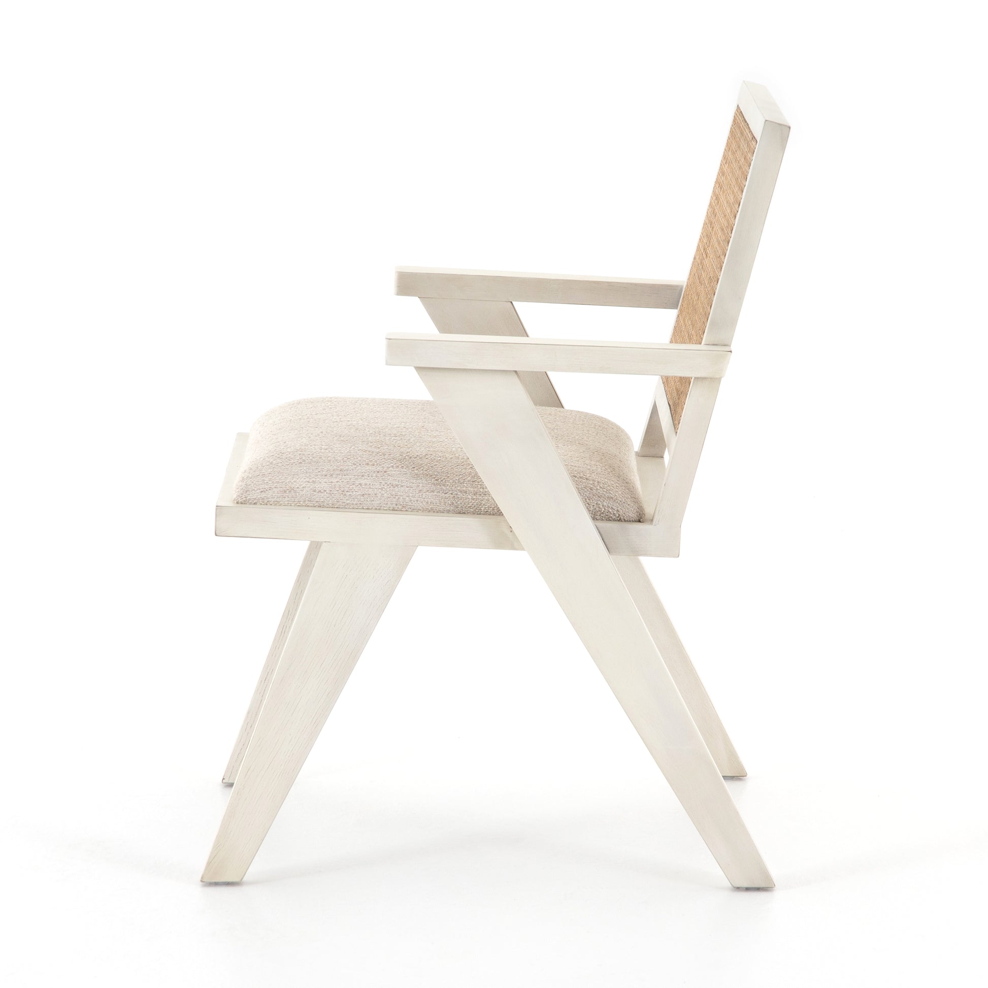 Inspired by Swiss-French architects Le Corbusier and Pierre Jeanneret, a monochromatic dining chair features cream-finished solid oak framing, with woven cane seating, for a texture-driven look with mid-century vibes. Performance fabrics are specially created to withstand spills, stains, high traffic and wear, ensuring long-term comfort and unmatched durability.