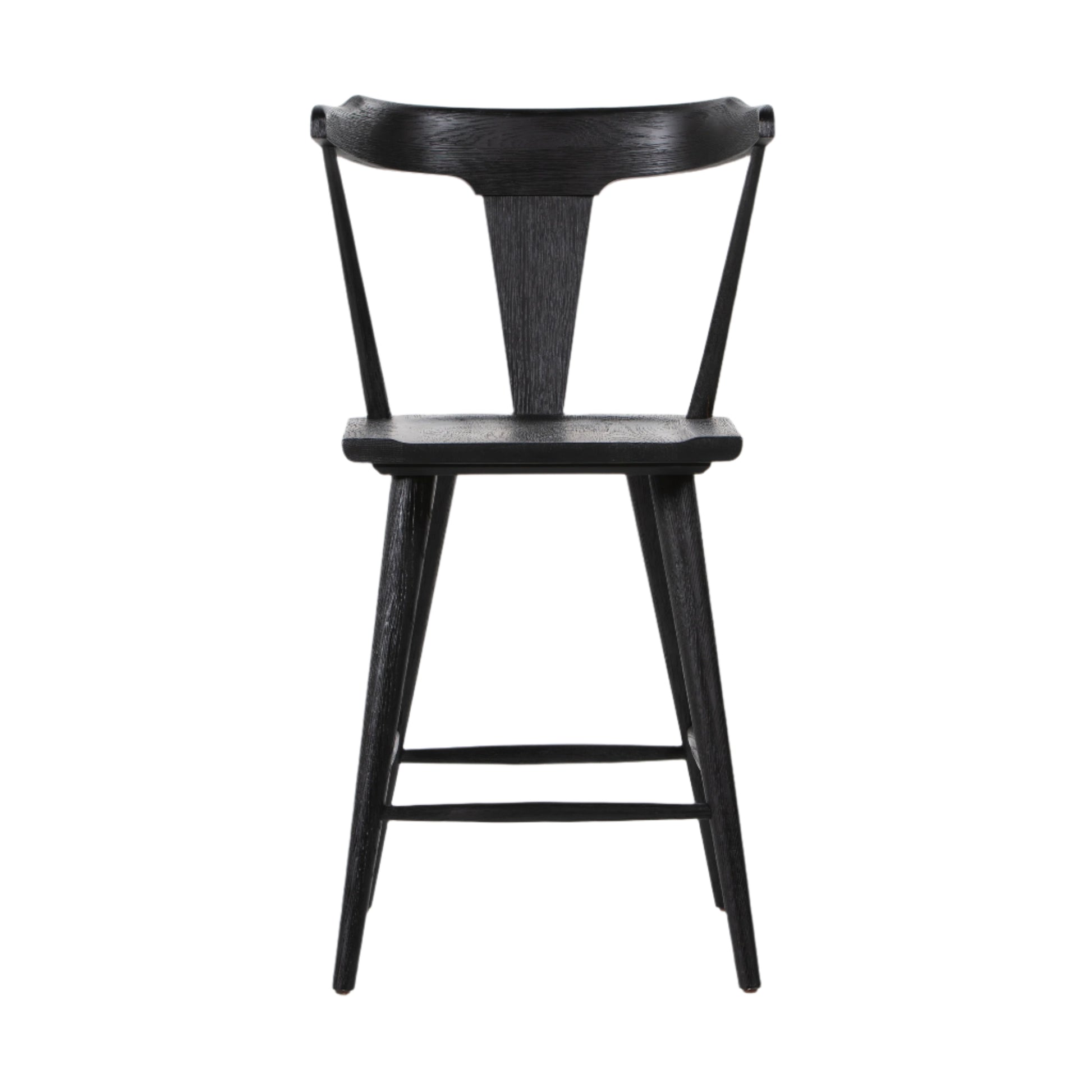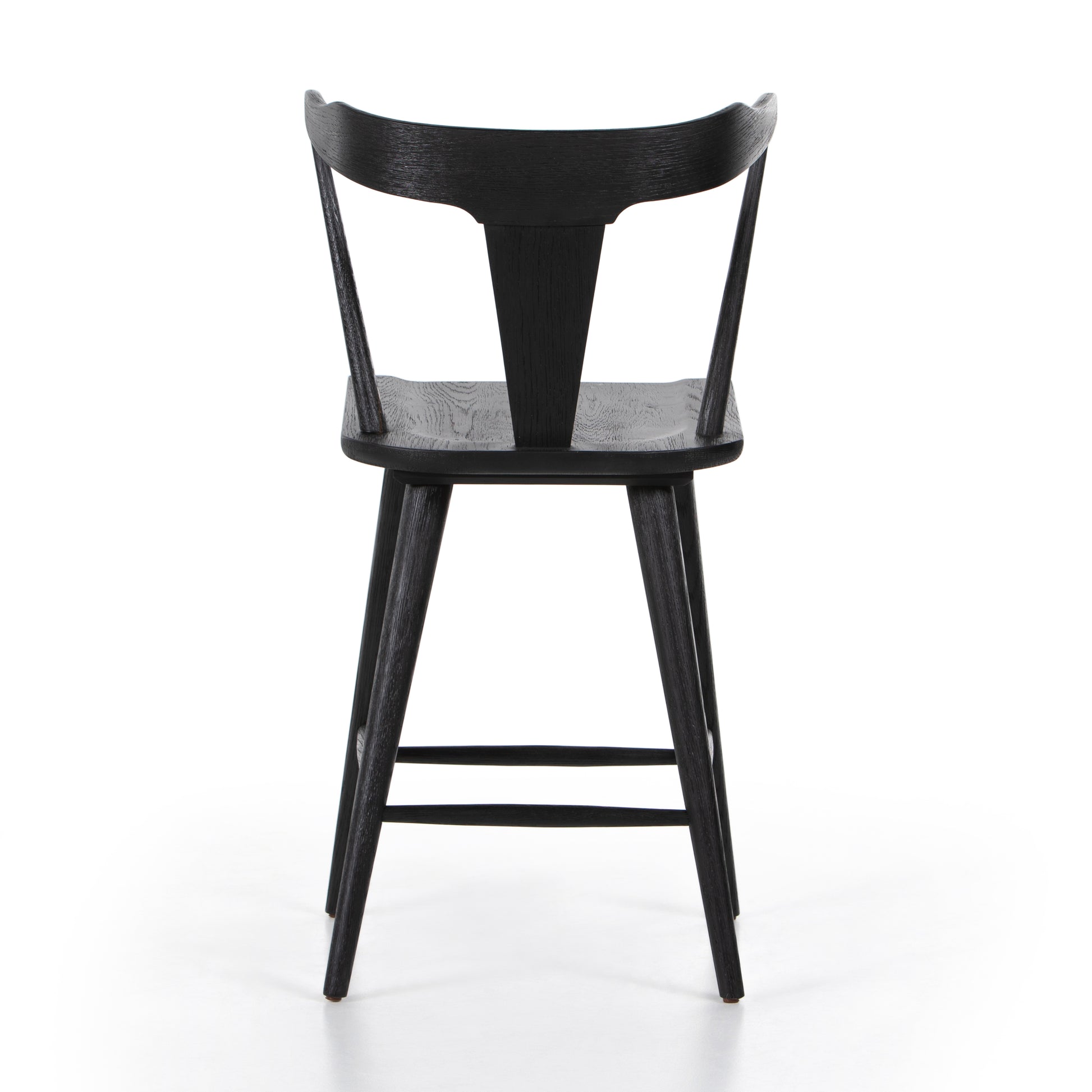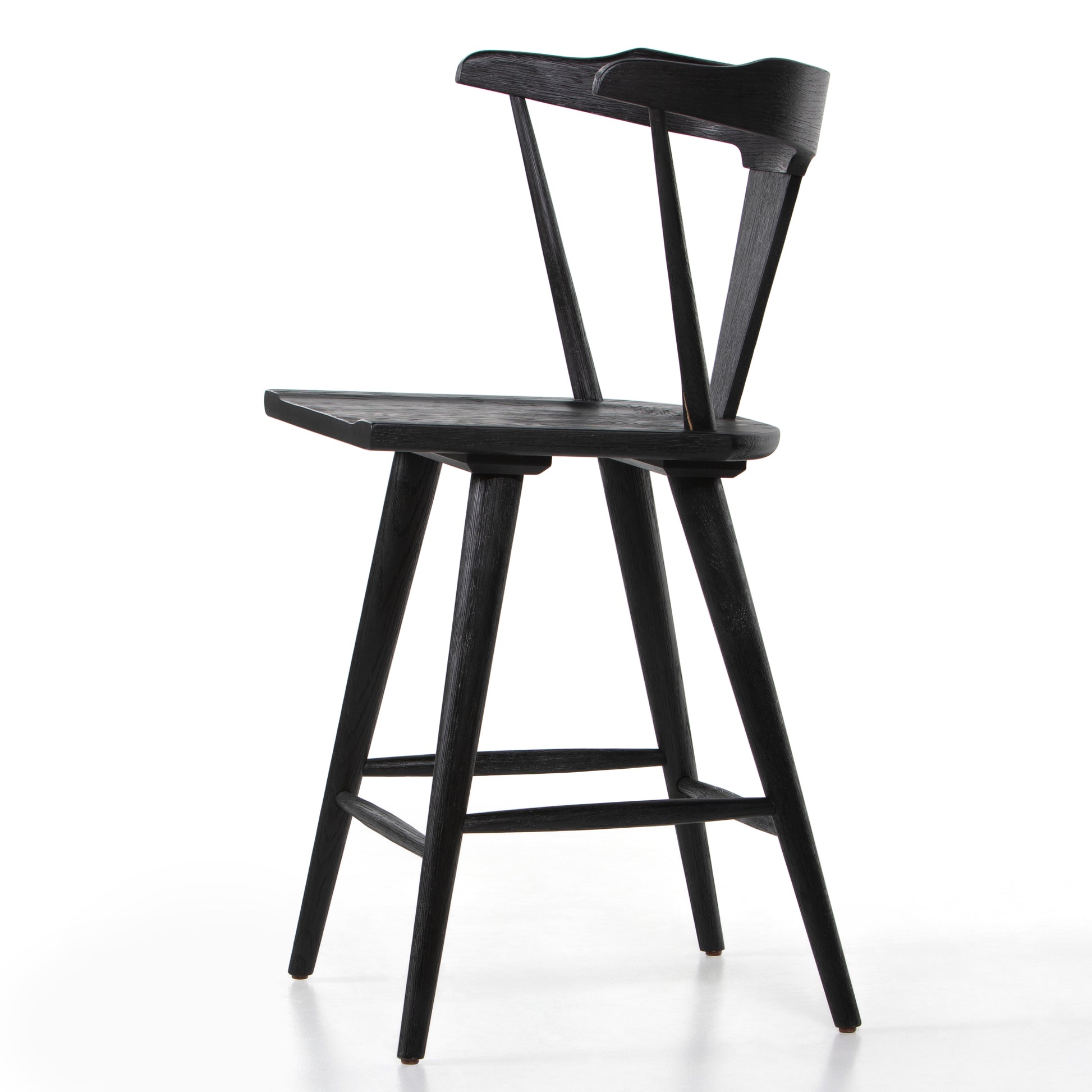 A fresh, counter-height take on mid-century Windsor seating, featuring a bowed, sculptural silhouette and soft black finish to highlight the natural grain of weathered oak.