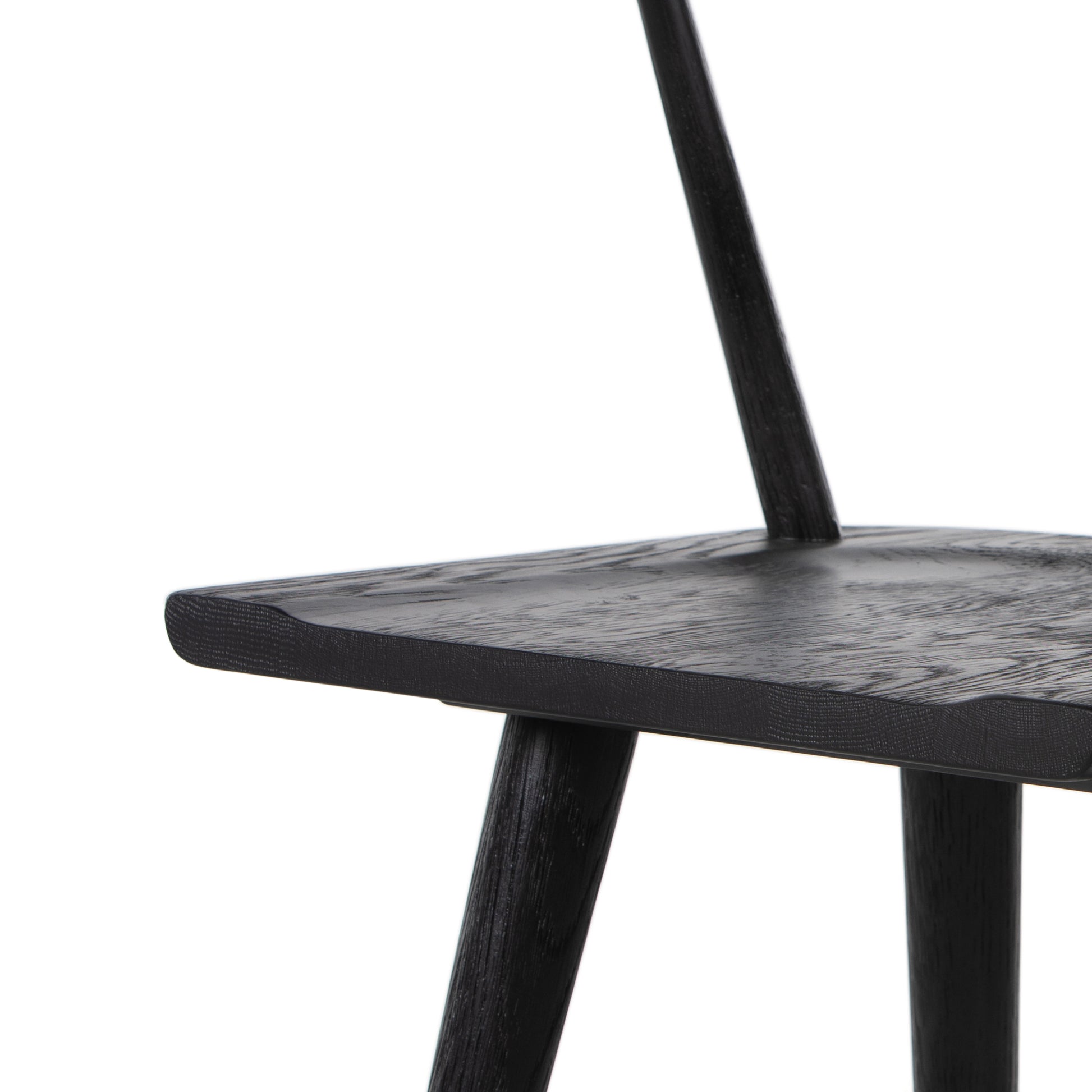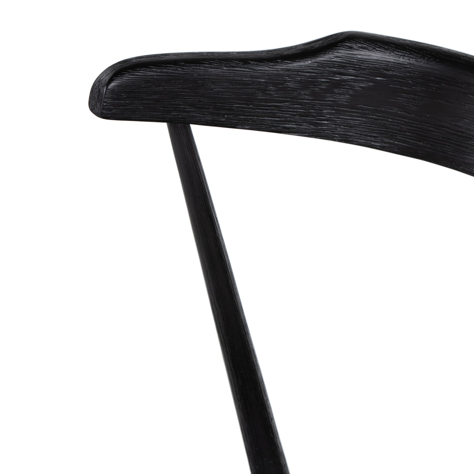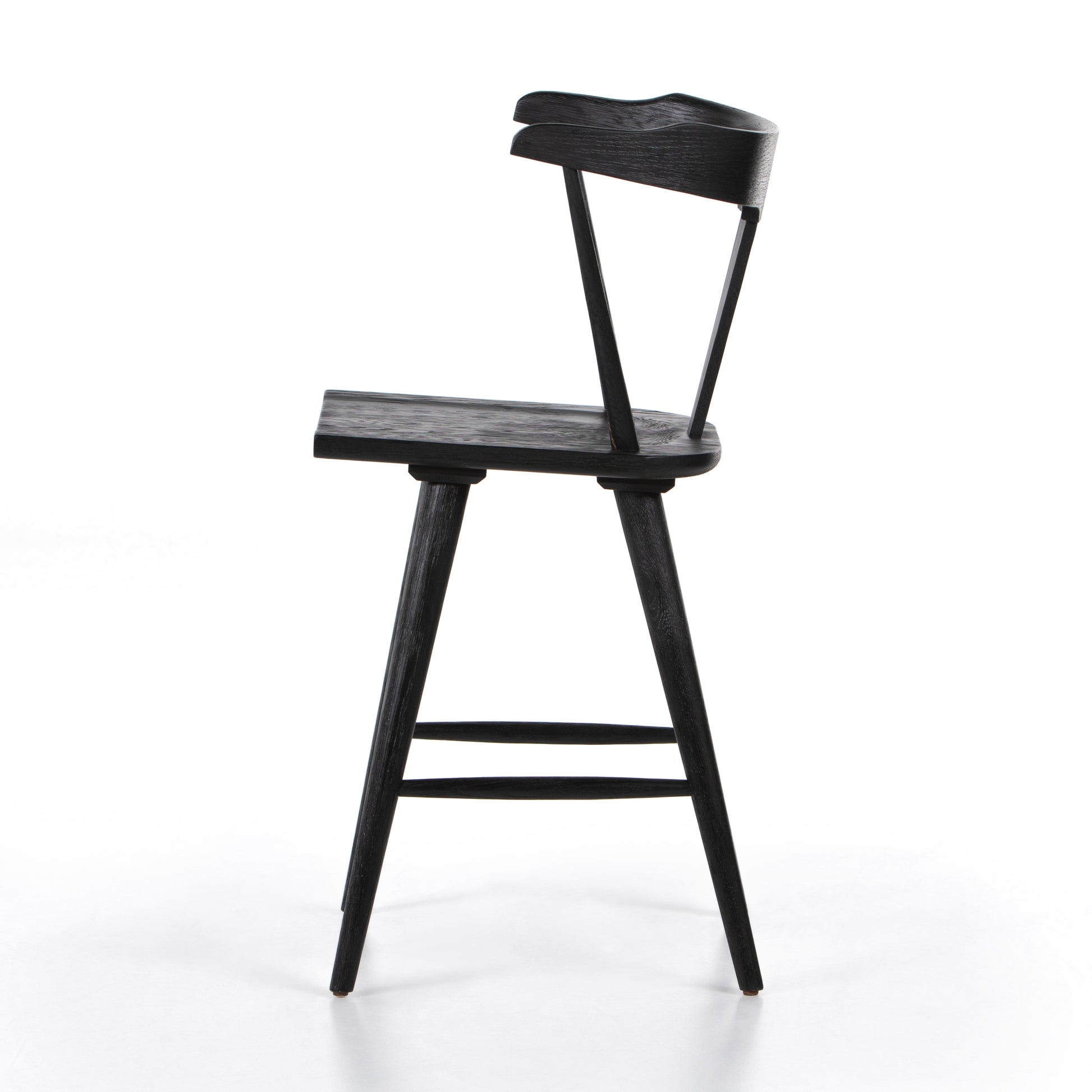 A fresh, counter-height take on mid-century Windsor seating, featuring a bowed, sculptural silhouette and soft black finish to highlight the natural grain of weathered oak.