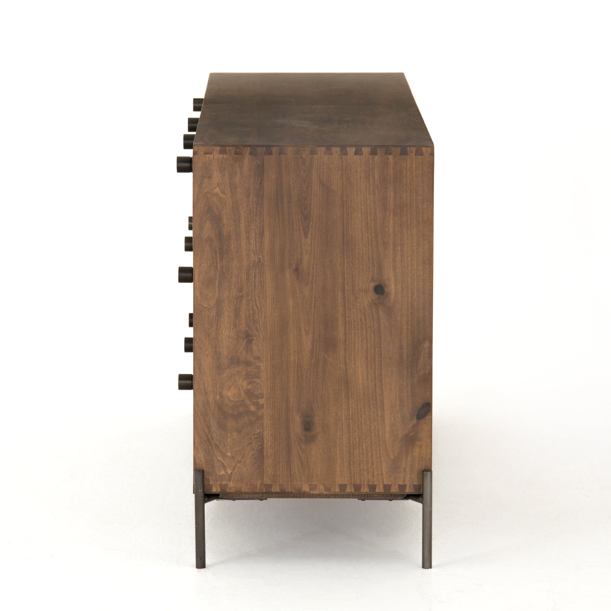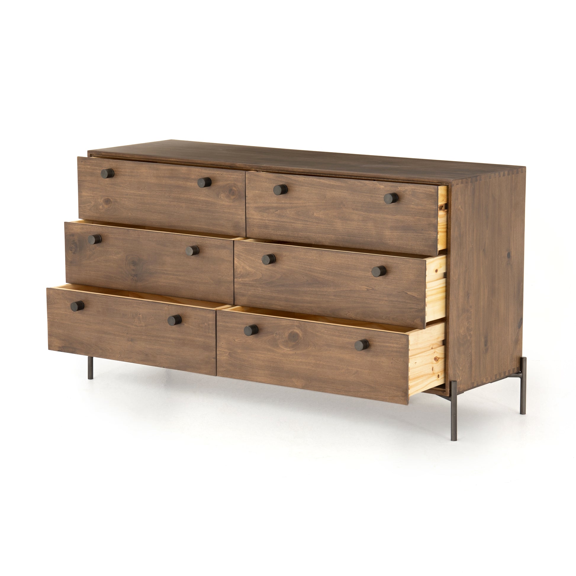 A deep and spacious solid poplar dresser inspired by vintage drawer chests is updated with linear iron framing. Cylindrical iron knobs add to the heirloom quality.