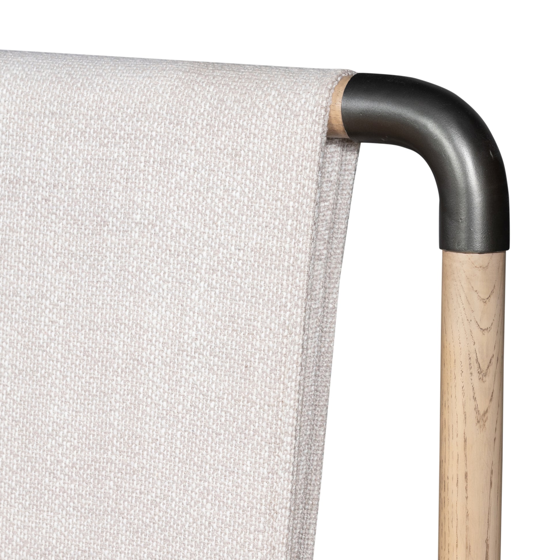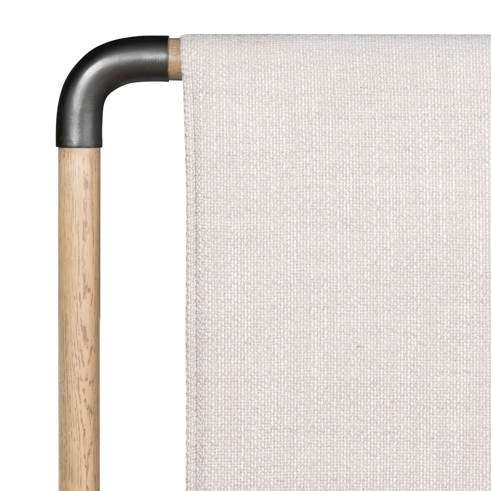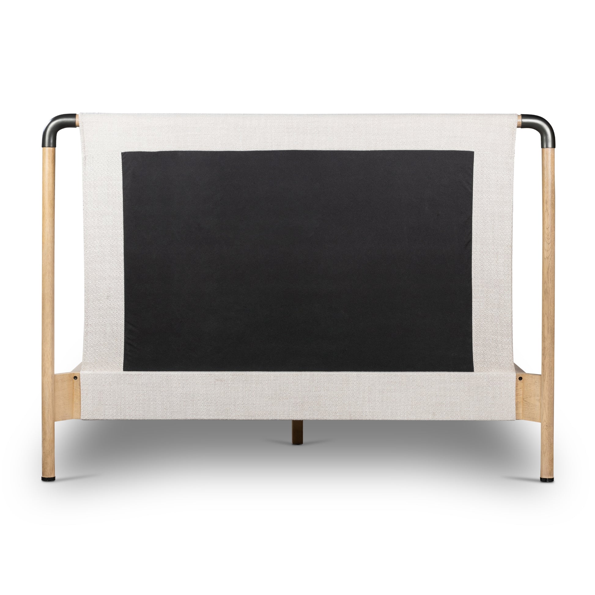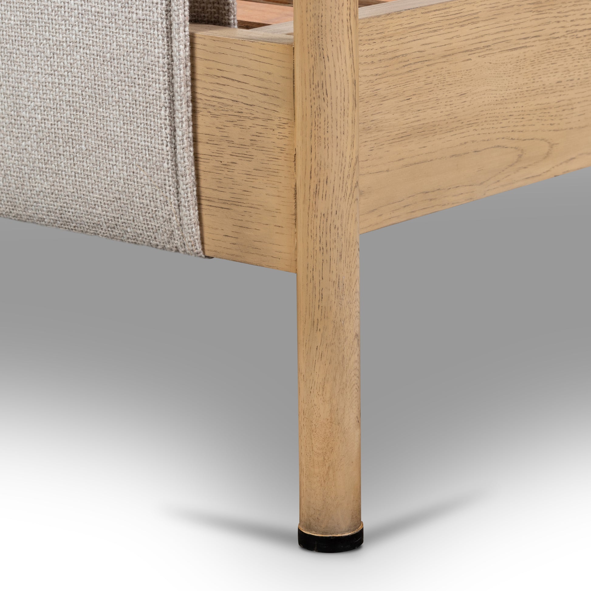 Mixed materials make the bed. Framed by solid oak with rounded iron corners, an upholstered, sling-style headboard brings a light, modern vibe to the bedroom. Performance fabrics are specially created to withstand spills, stains, high traffic and wear, ensuring long-term comfort and unmatched durability. This bed is not compatible with an adjustable mattress.