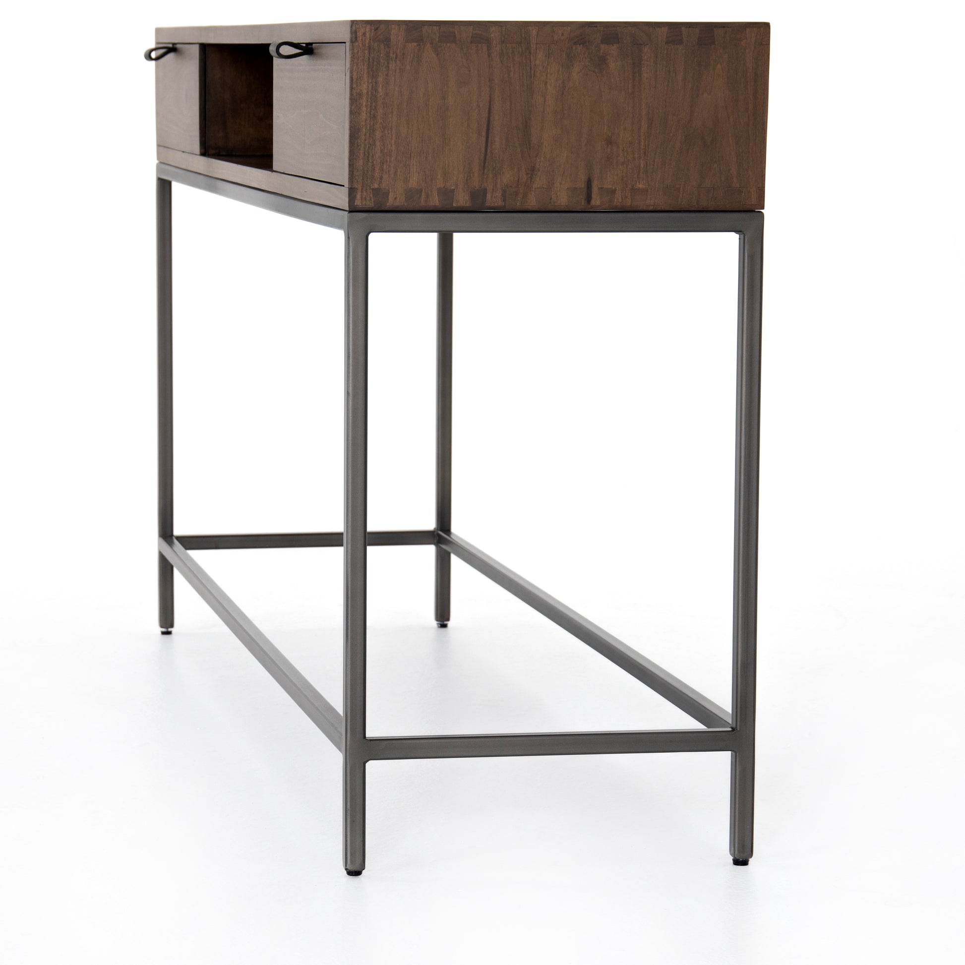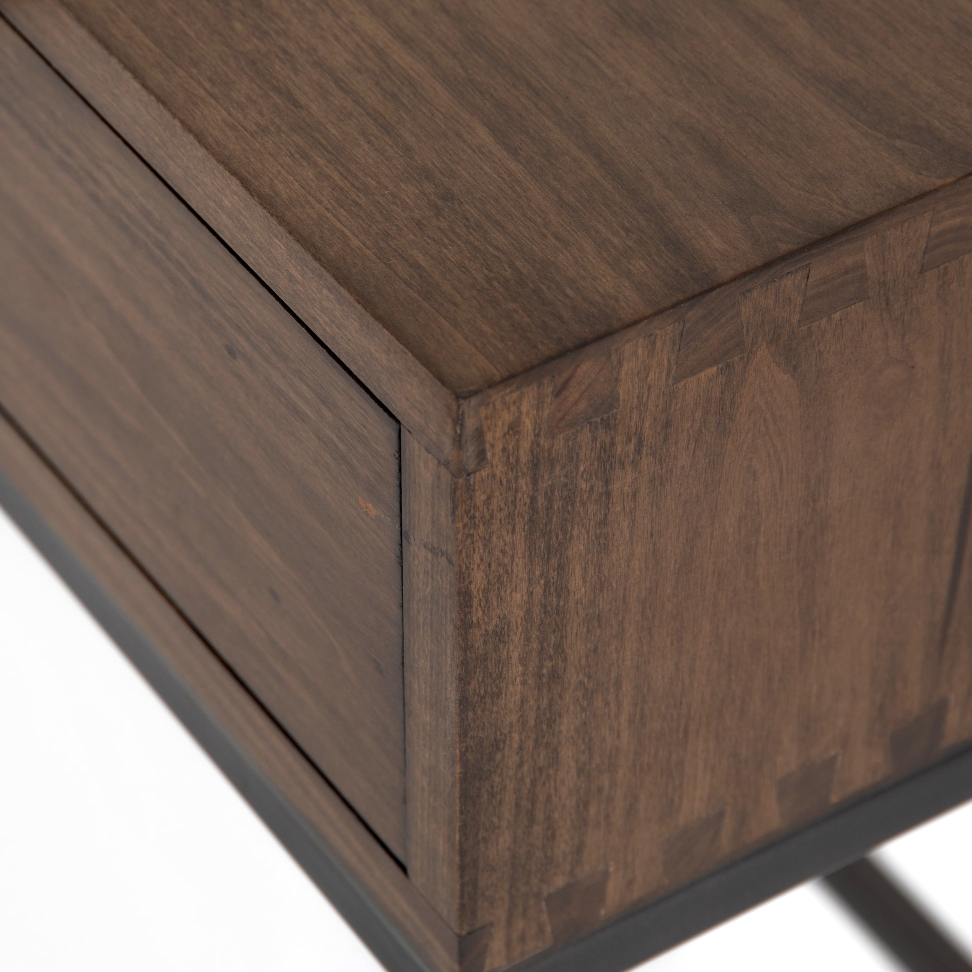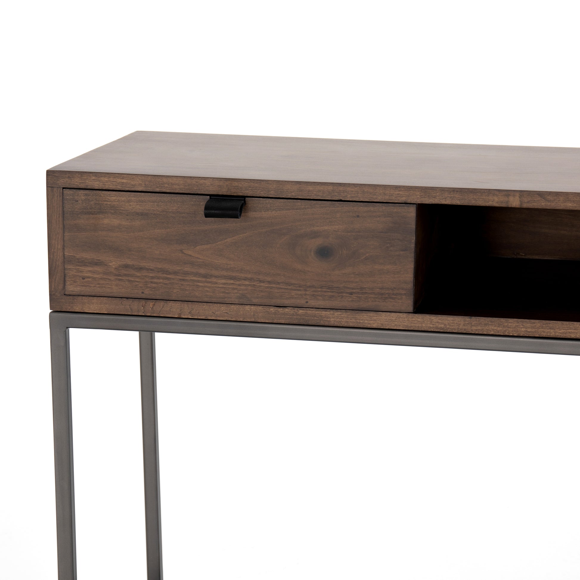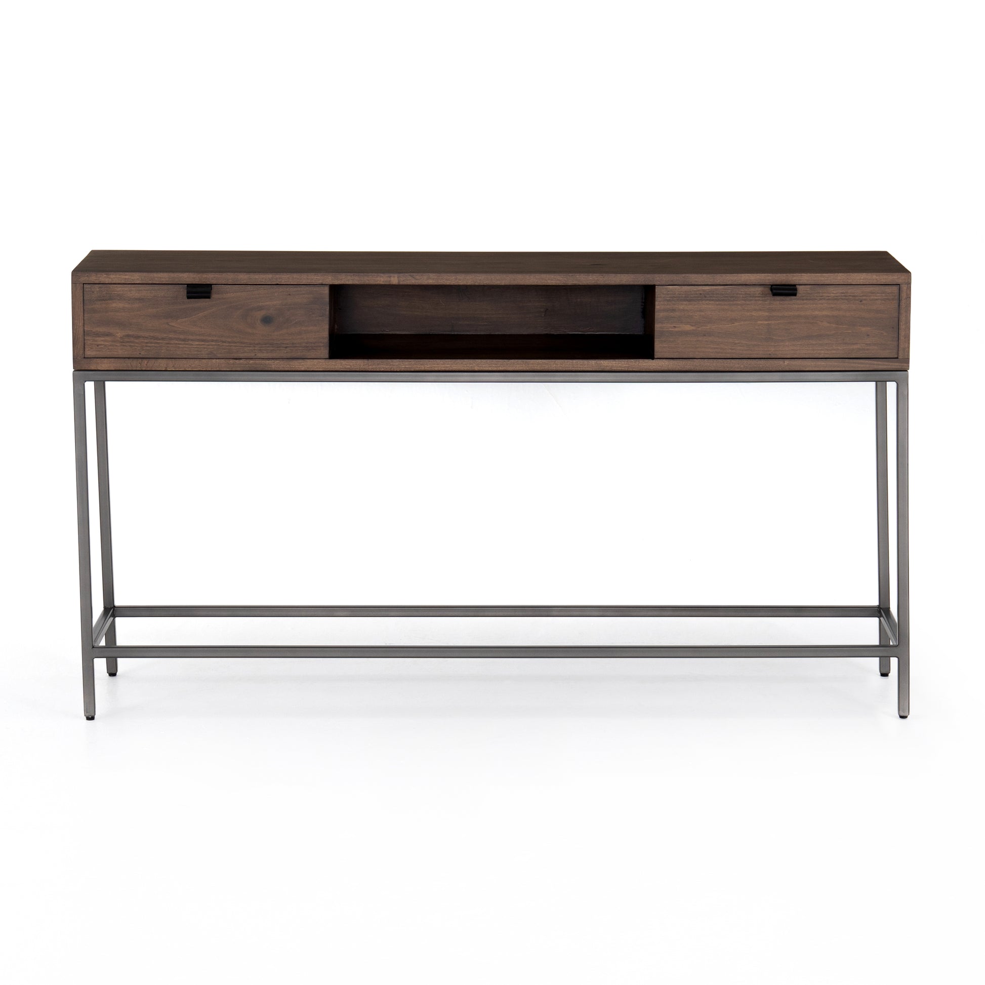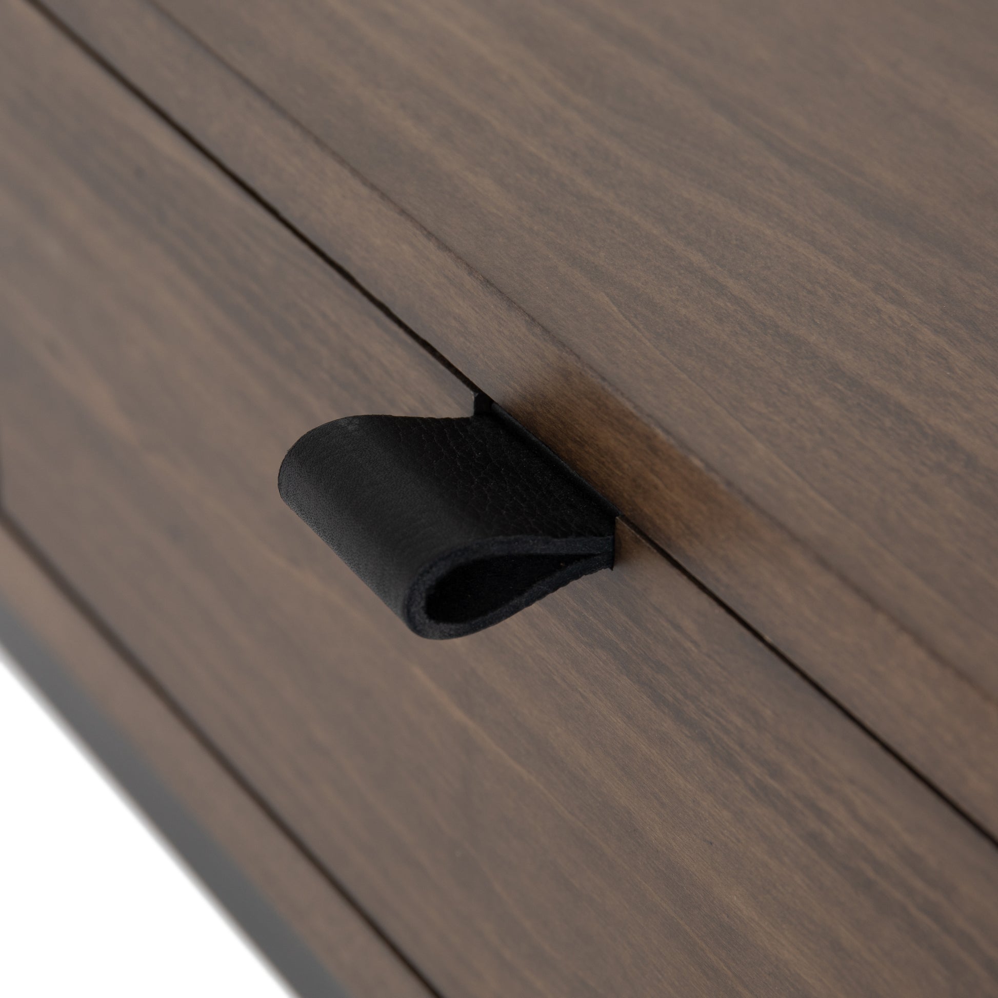 Inspired by clean mid-century design, light auburn-finished poplar offers media storage and more by way of a center cubby and dual side drawers. Metal-secured leather pulls add a textural element of surprise.