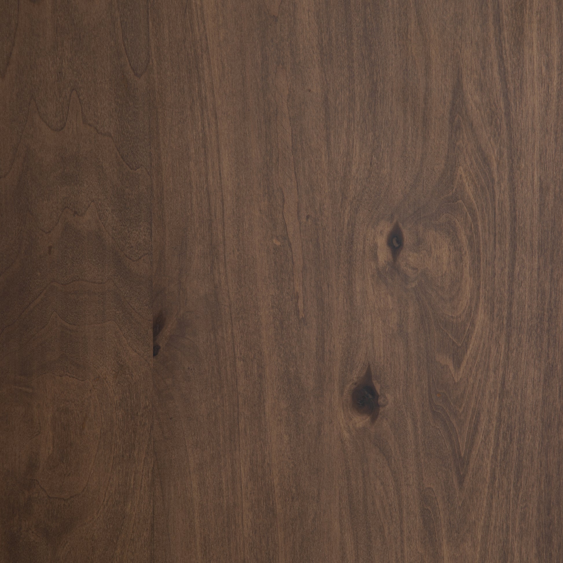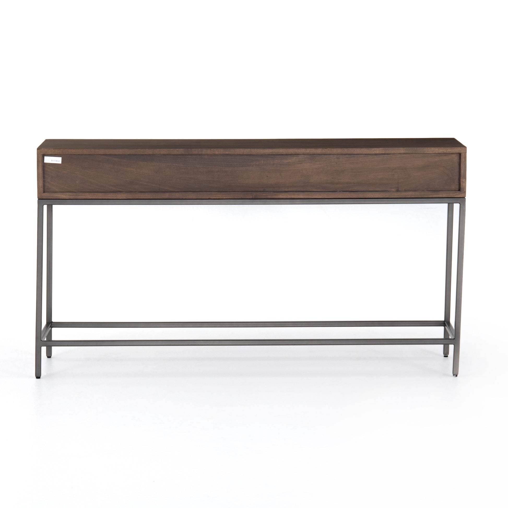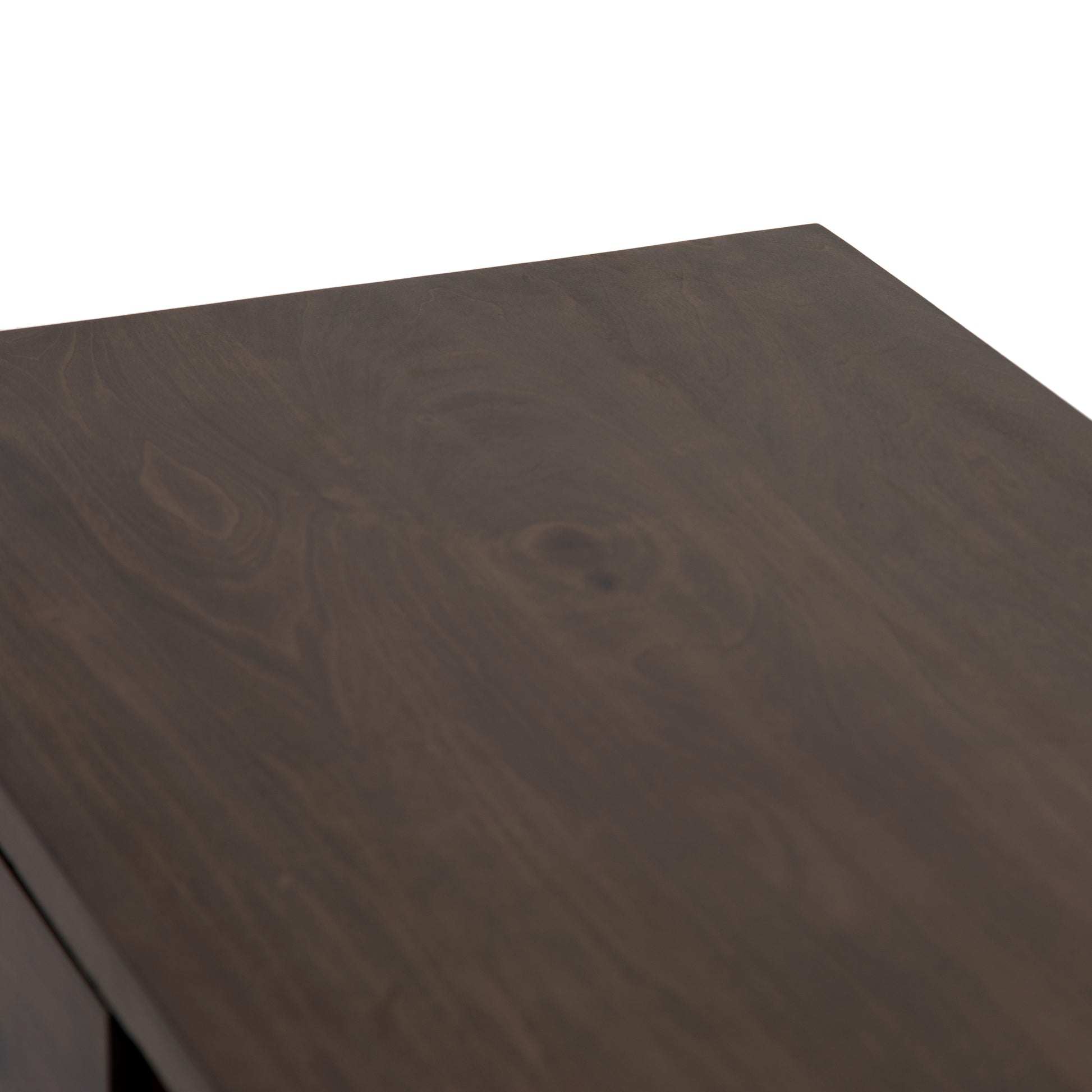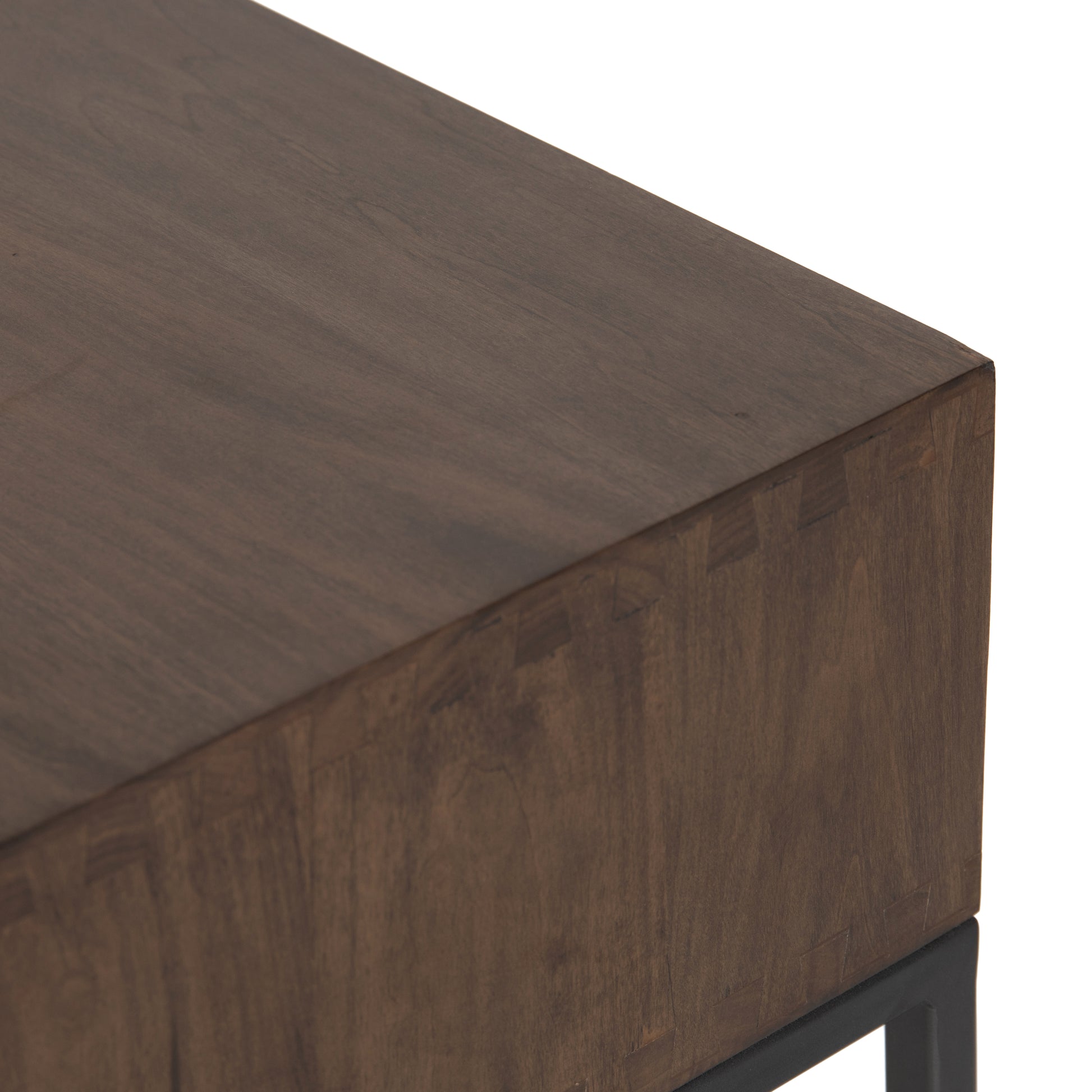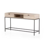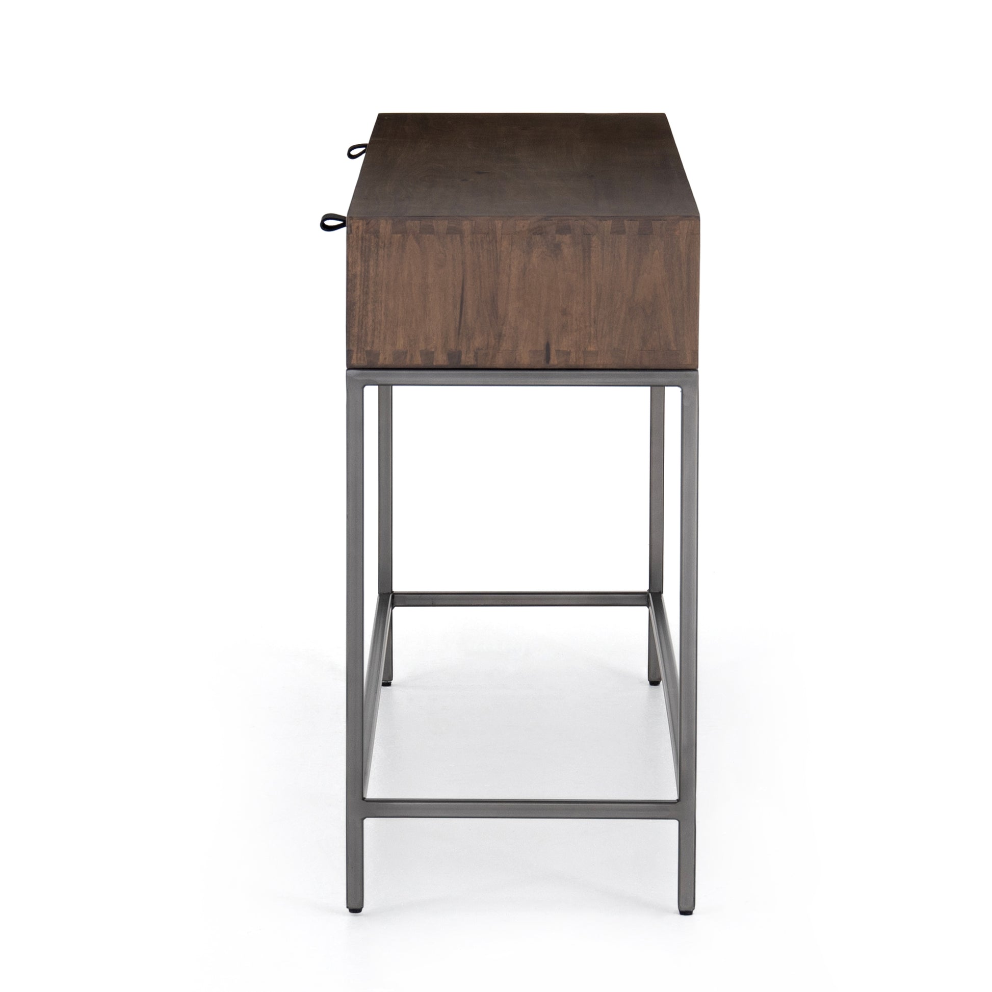 Inspired by clean mid-century design, light auburn-finished poplar offers media storage and more by way of a center cubby and dual side drawers. Metal-secured leather pulls add a textural element of surprise.