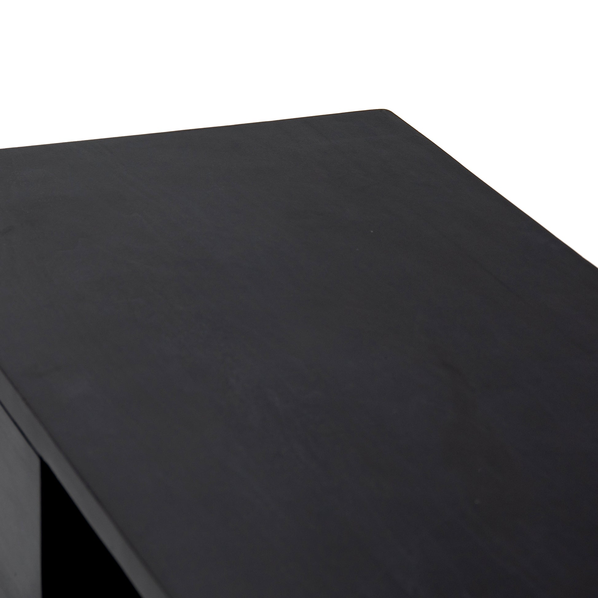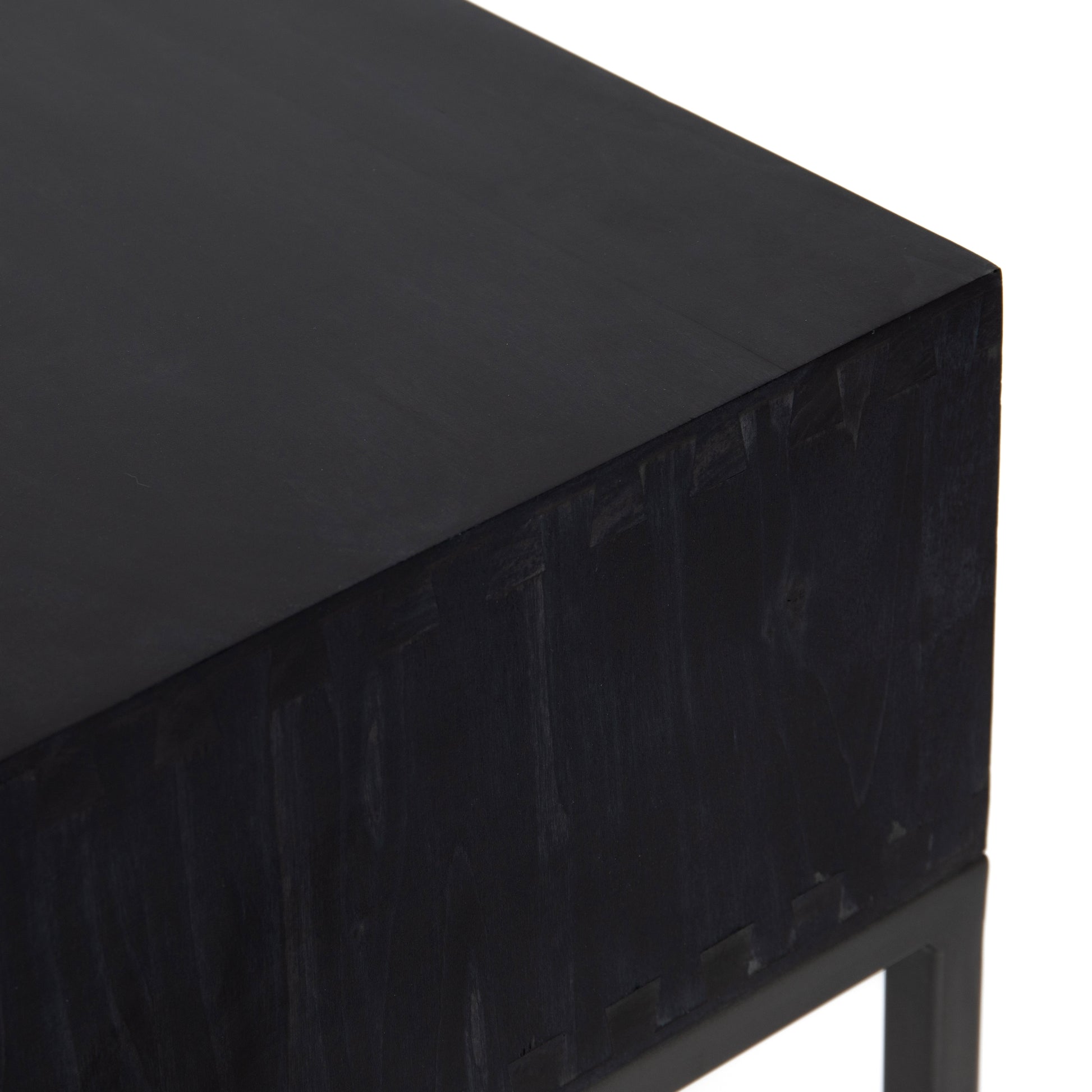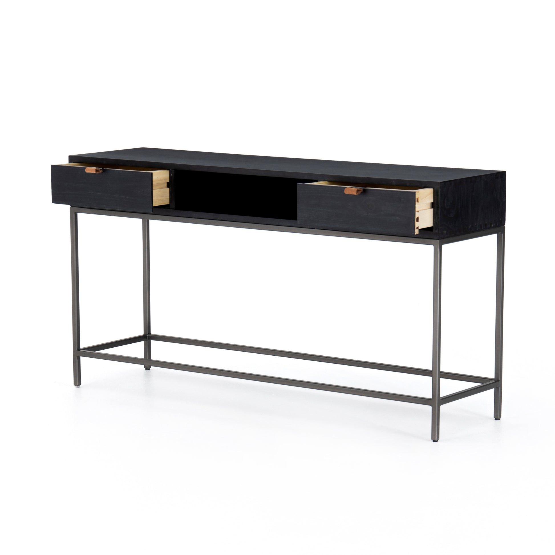 Inspired by clean mid-century design, black-washed poplar offers media storage and more by way of a center cubby and dual side drawers. Metal-secured leather pulls add a textural element of surprise.