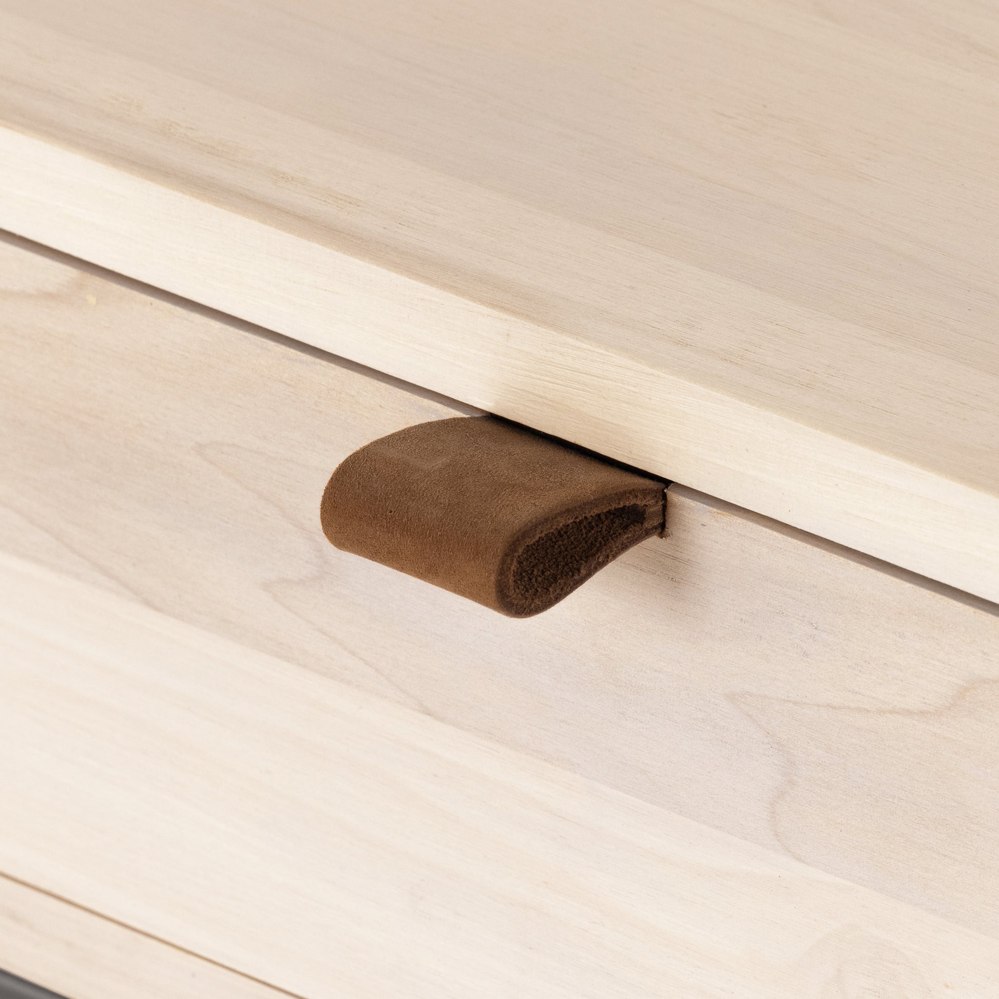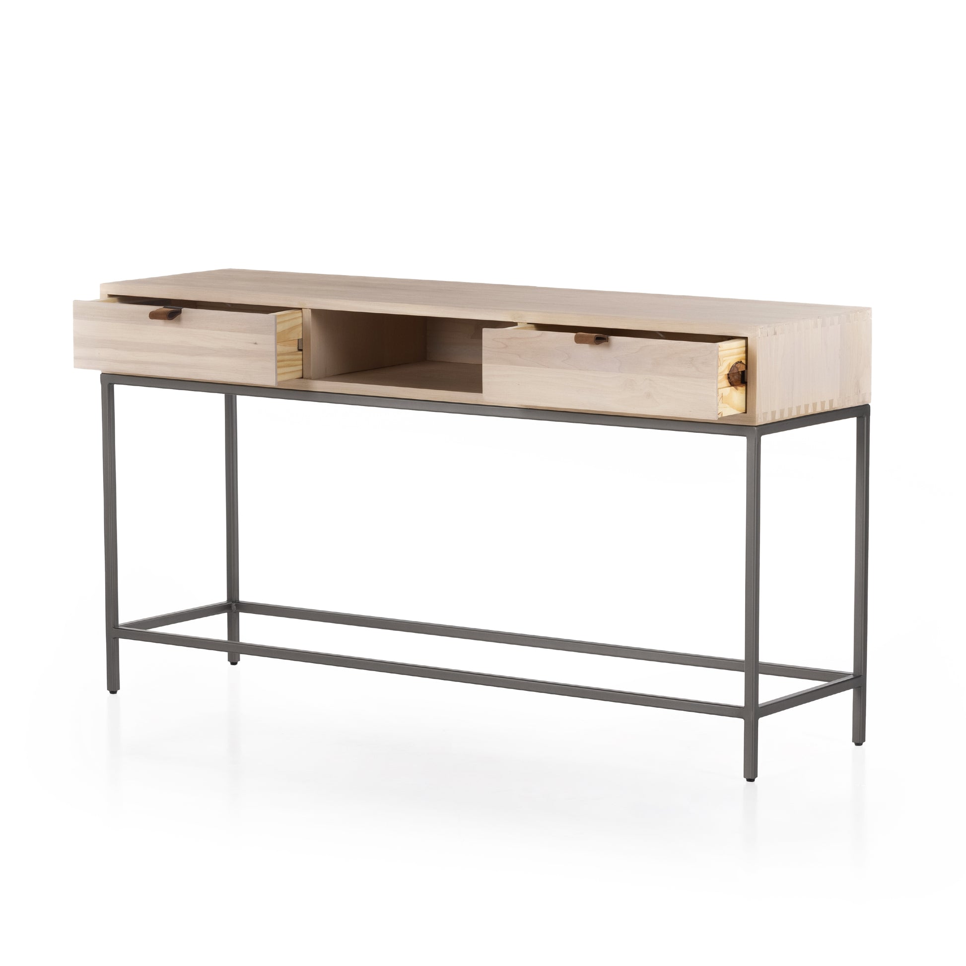 Inspired by clean midcentury design, solid poplar offers media storage and more by way of a center cubby and dual side drawers. Metal-secured leather pulls add a textural element of surprise.