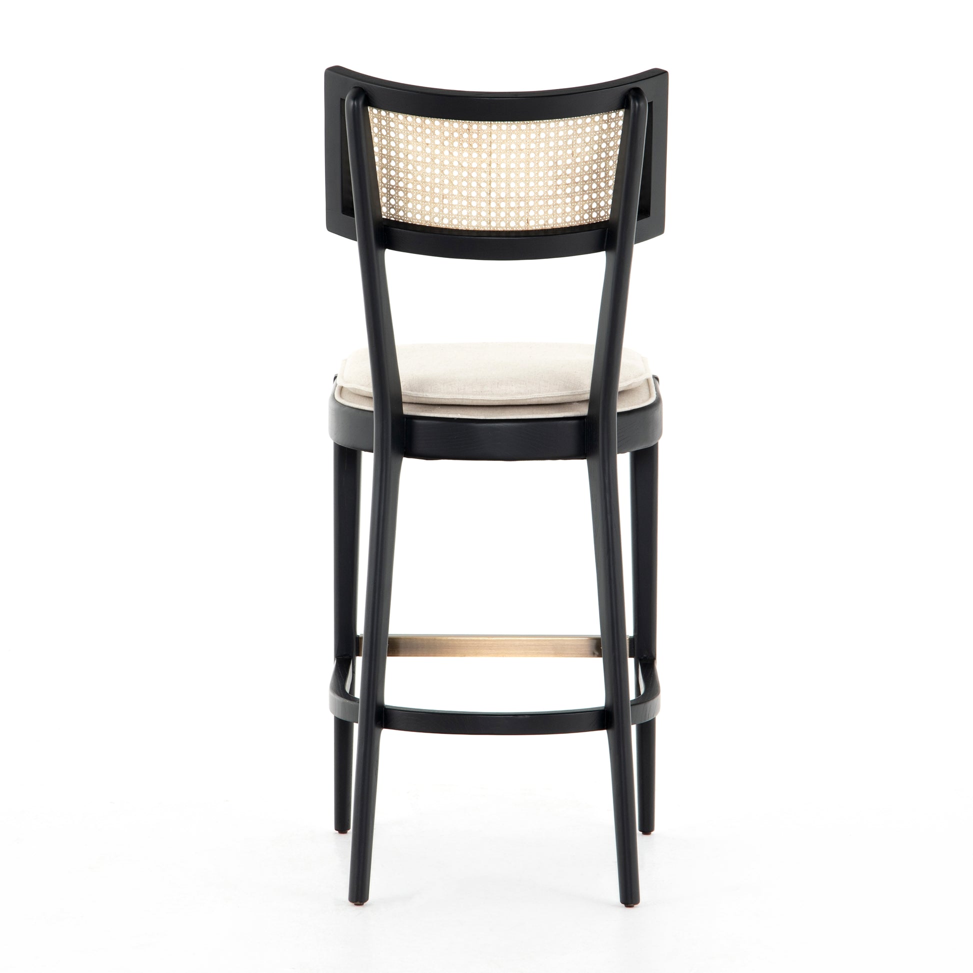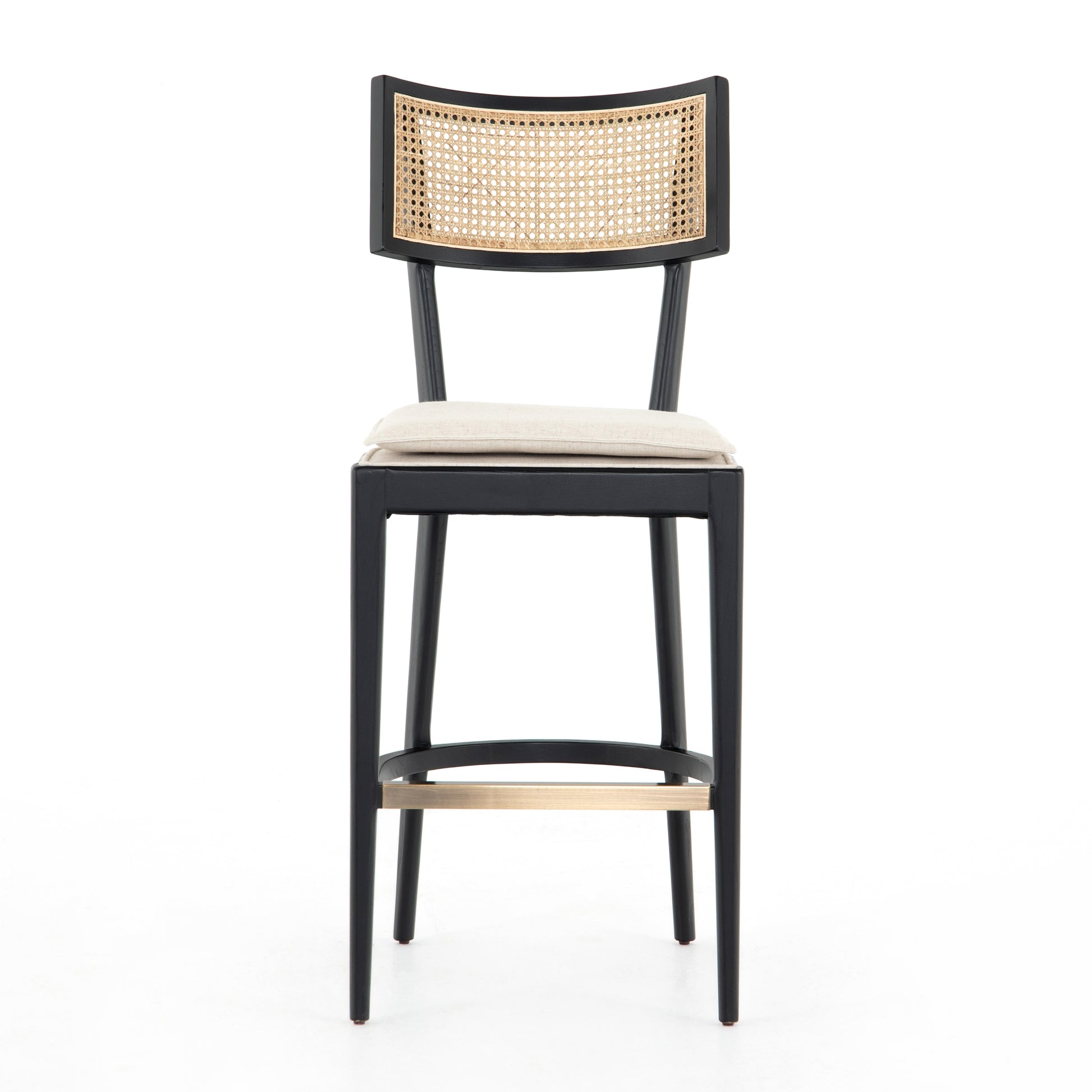 Mixed materials refresh retro styling. Brushed ebony nettlewood frames a textural inlay of natural cane for beautifully crisp contrast. Fastened by Velcro, linen-blend seating of high-performance fabric brings modern sensibility to bar styling. Performance fabrics are specially created to withstand spills, stains, high traffic and wear, ensuring long-term comfort and unmatched durability.