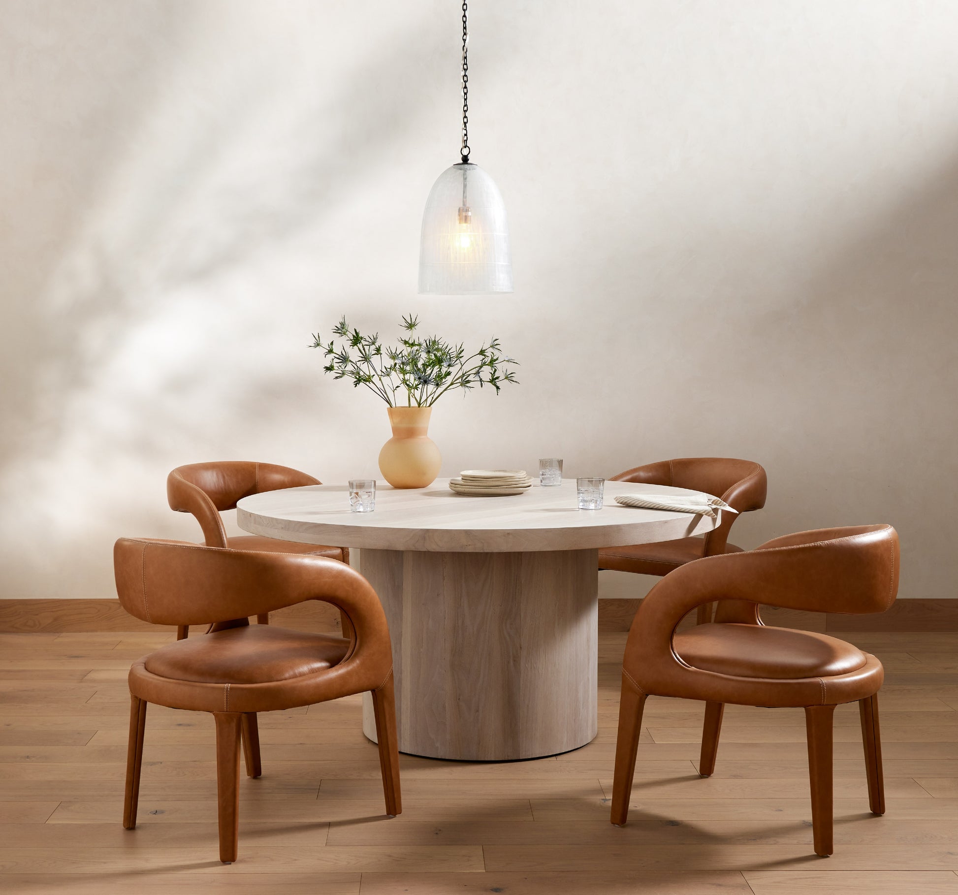 Stunning forces of nature are captured in a dining table, as walnut veneer and natural yukas are hand-shaped into a beautifully rounded silhouette. Reflective of woods' natural character, a slight color variance is possible from piece to piece.