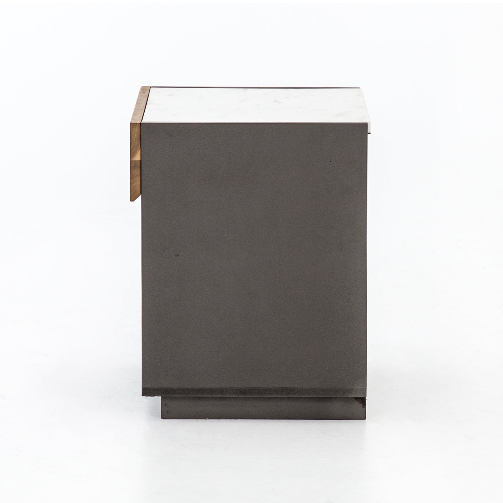 An intriguing material mix, perfectly cubed. Grey-lacquered hardwood casing welcomes a single spacious drawer of smoked oak. A smooth top of polished white marble brings sophisticated contrast to bedside storage.