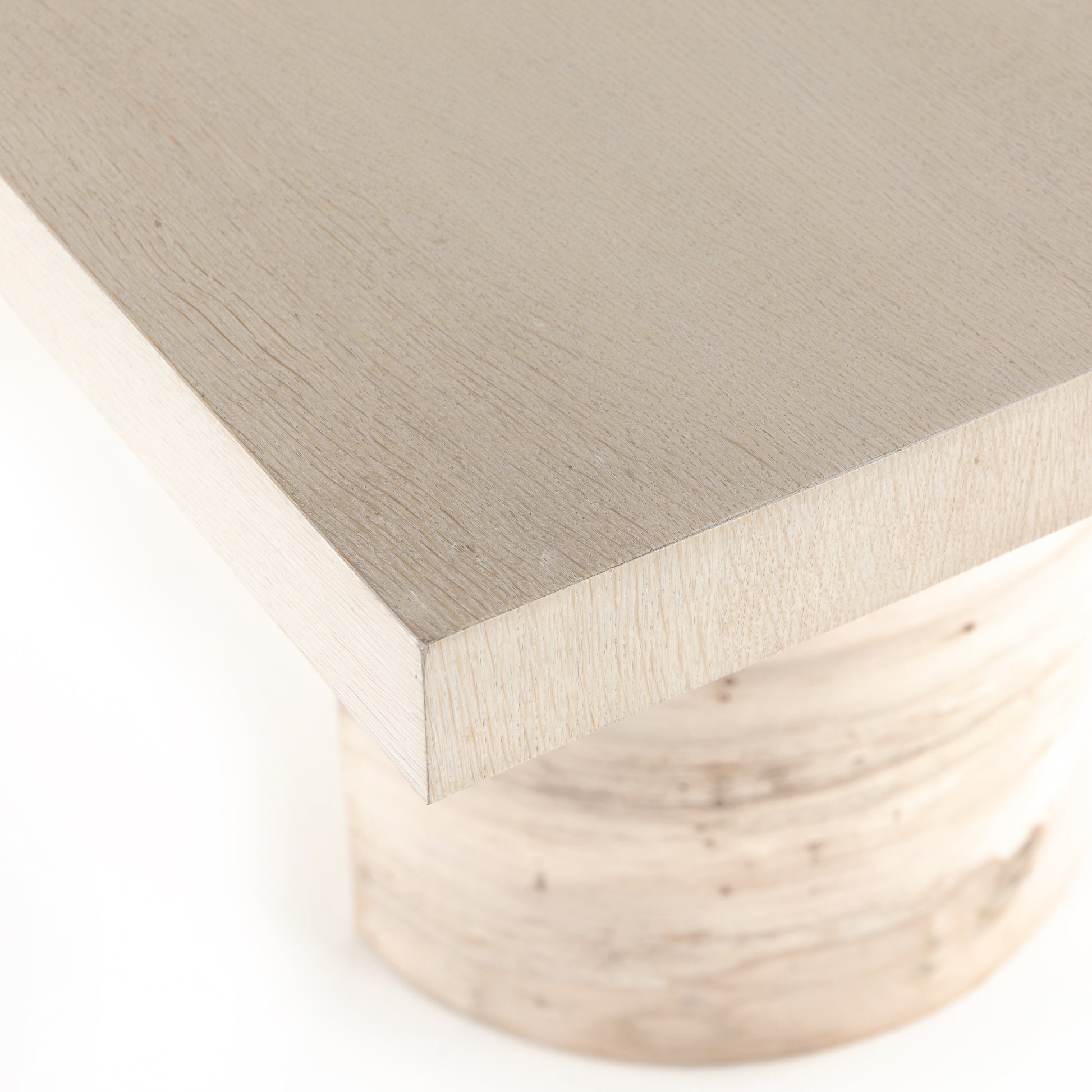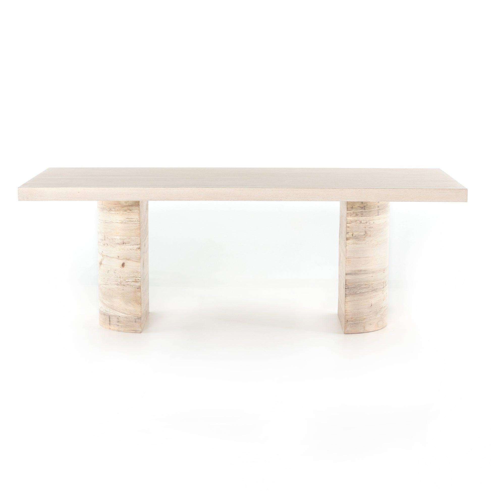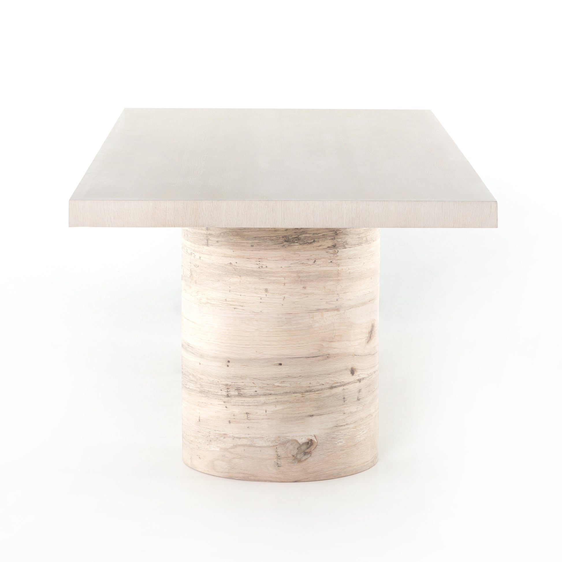 Organic in tone, sculptural in spirit. Inspired by bold Eighties-era design, a rectangular dining table of thick oak veneer features beautifully shaped legs in a bleached finish, with a pale tabletop for subtle contrast of tone. Seats six to eight comfortably.
