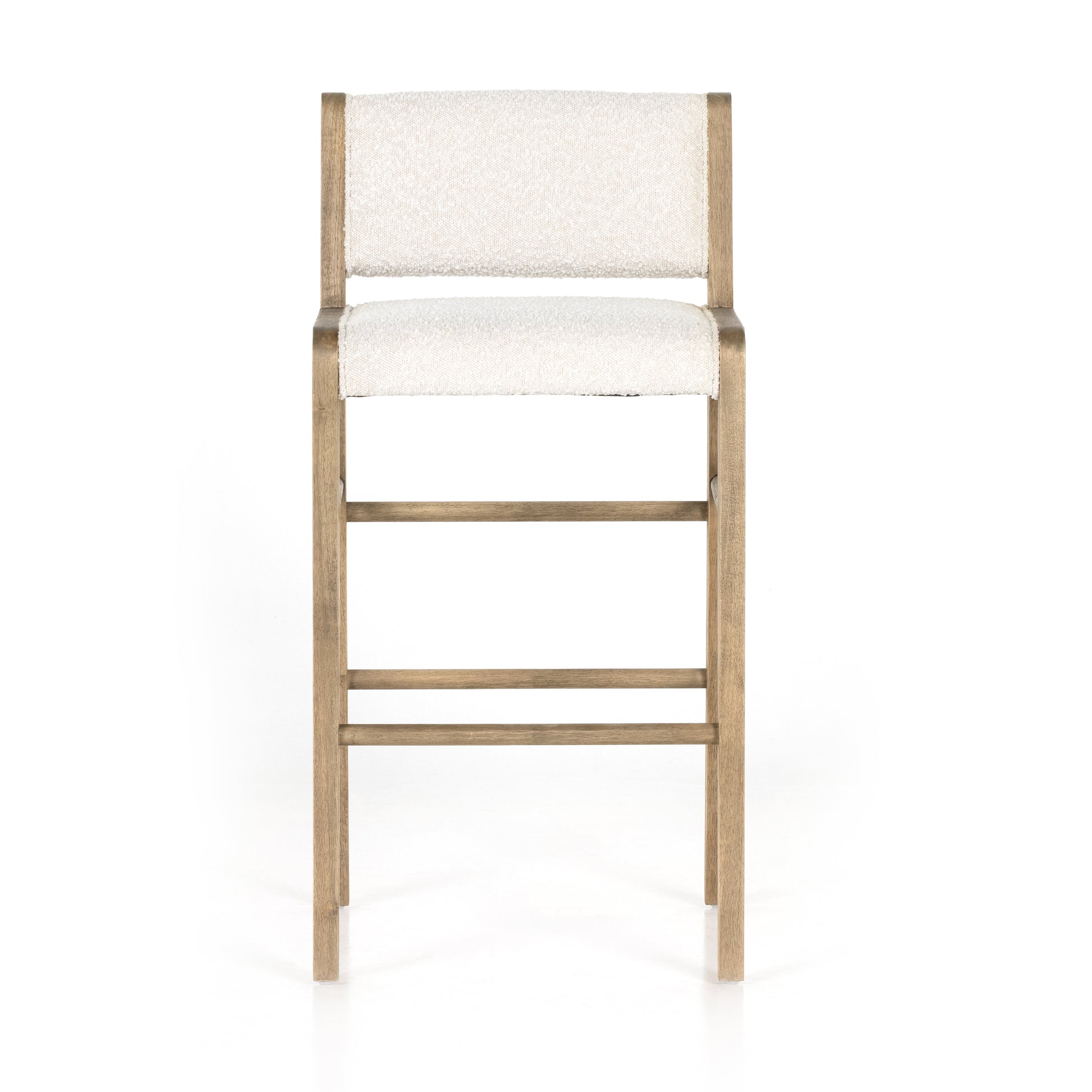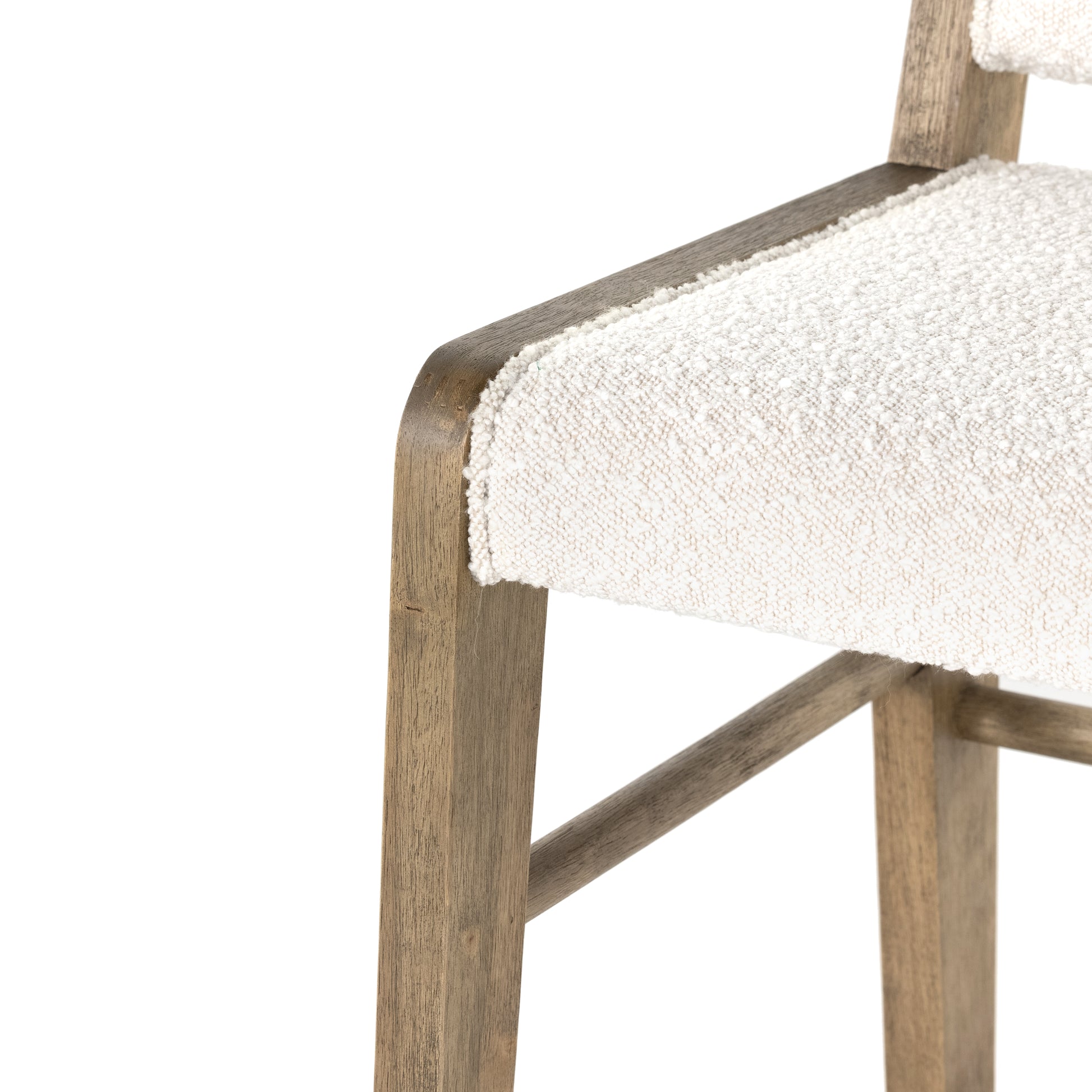 Make it modern with mixed materials. In a light, natural finish, solid parawood forms an angular frame for boucle-upholstered bar seating in a classic cream. Performance fabrics are specially created to withstand spills, stains, high traffic and wear, ensuring long-term comfort and unmatched durability.