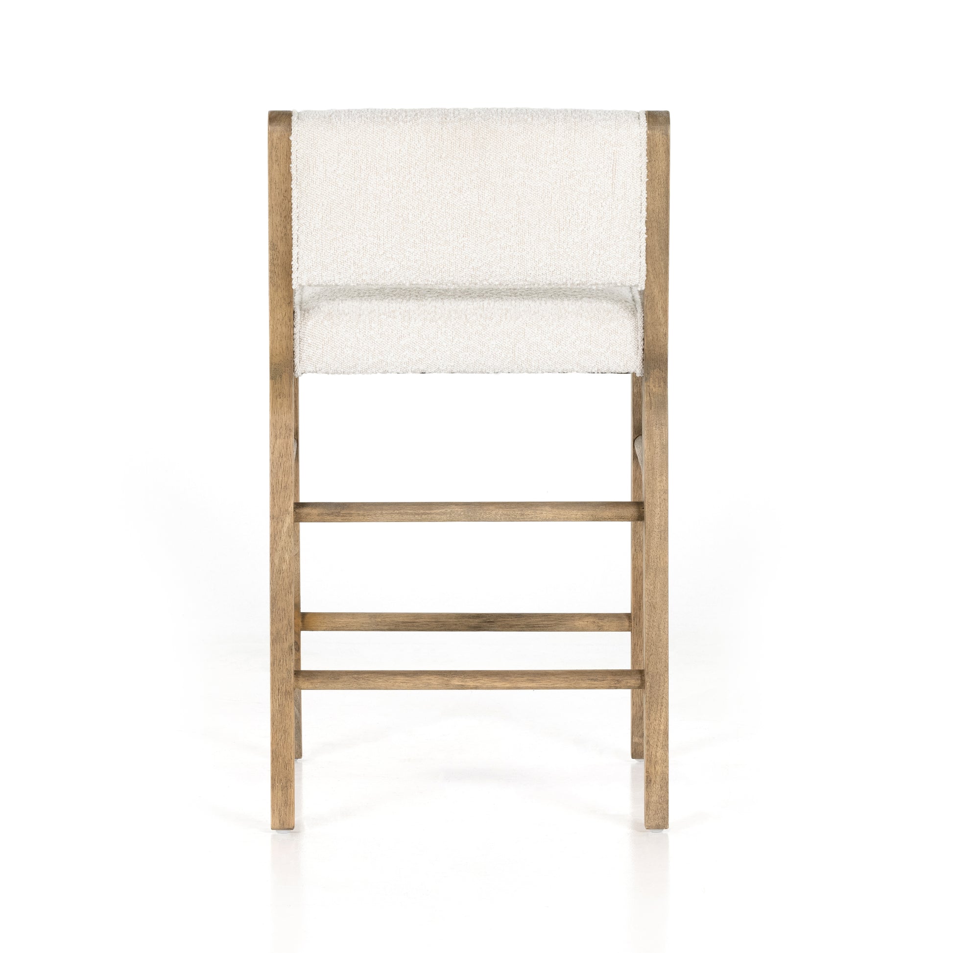 Make it modern with mixed materials. In a light, natural finish, solid parawood forms an angular frame for boucle-upholstered counter seating in a classic cream. Performance fabrics are specially created to withstand spills, stains, high traffic and wear, ensuring long-term comfort and unmatched durability.