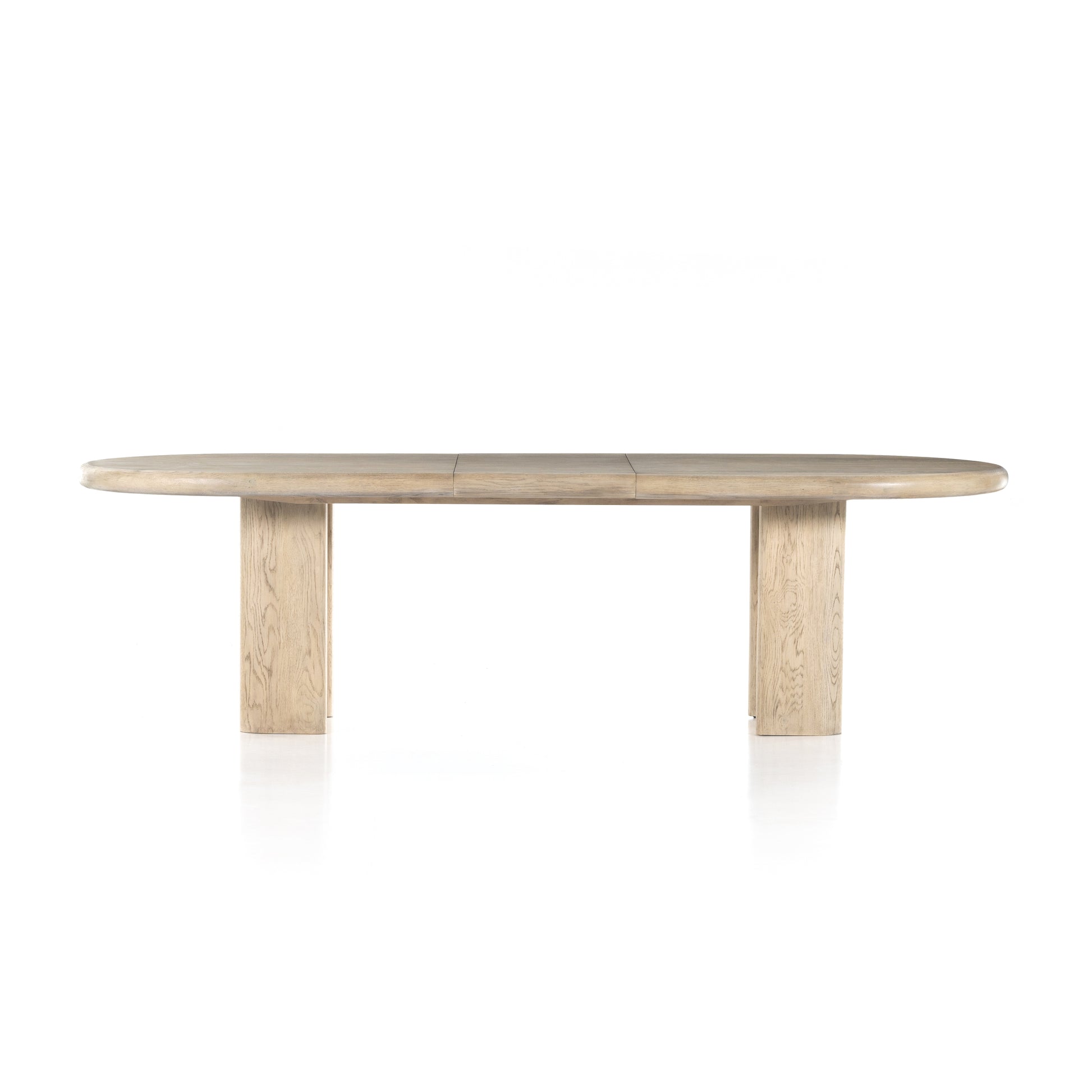 Made from light-finished oak, an oval-shaped dining table flaunts eye-catching curves, with an extension feature that expands the table from 87" to a roomier 107".