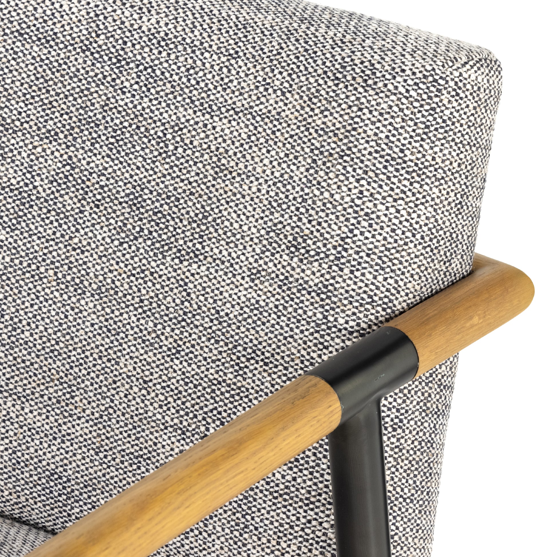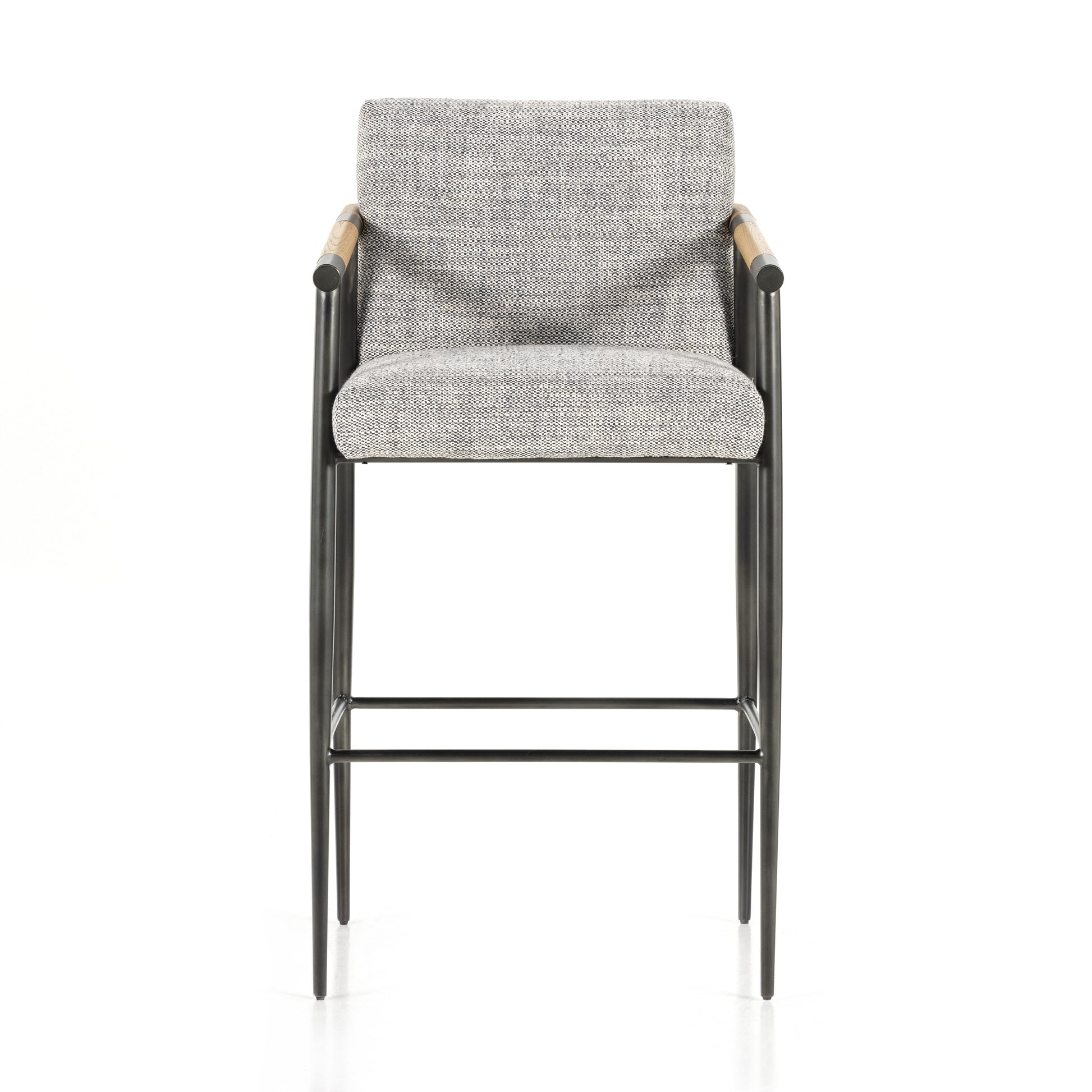 Textural grey seating upholstered in high-performance fabric exclusive to Four Hands, with angular solid oak arms and black-finished stainless steel framing. The perfectly stylish go-to for the modern-minded bar. Performance fabrics are specially created to withstand spills, stains, high traffic and wear, ensuring long-term comfort and unmatched durability.