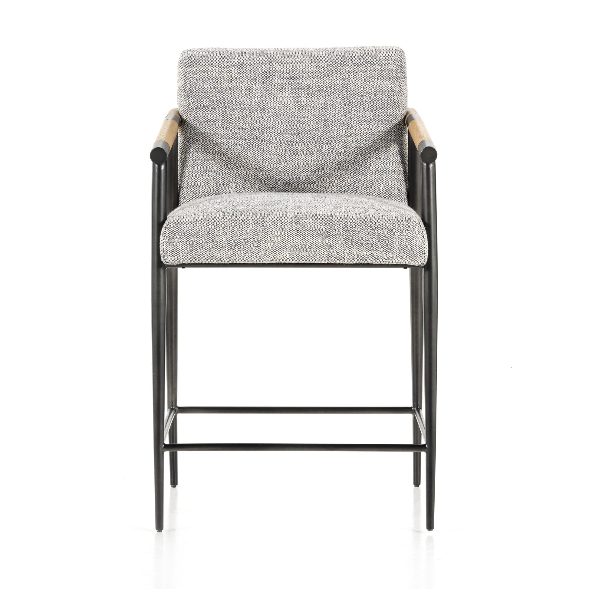 Textural grey seating upholstered in high-performance fabric exclusive to Four Hands, with angular solid oak arms and black-finished stainless steel framing perfectly sized for the counter. Performance fabrics are specially created to withstand spills, stains, high traffic and wear, ensuring long-term comfort and unmatched durability.