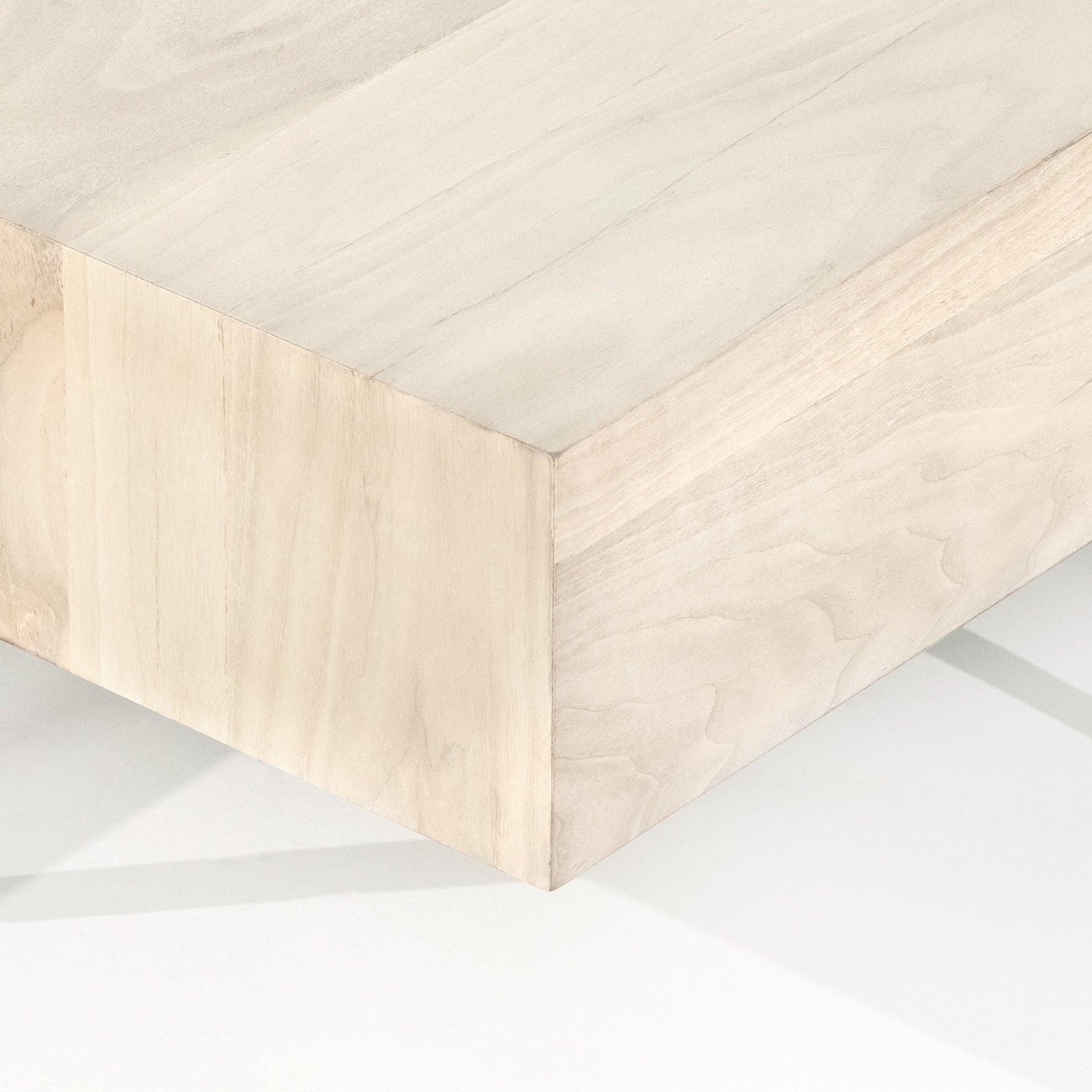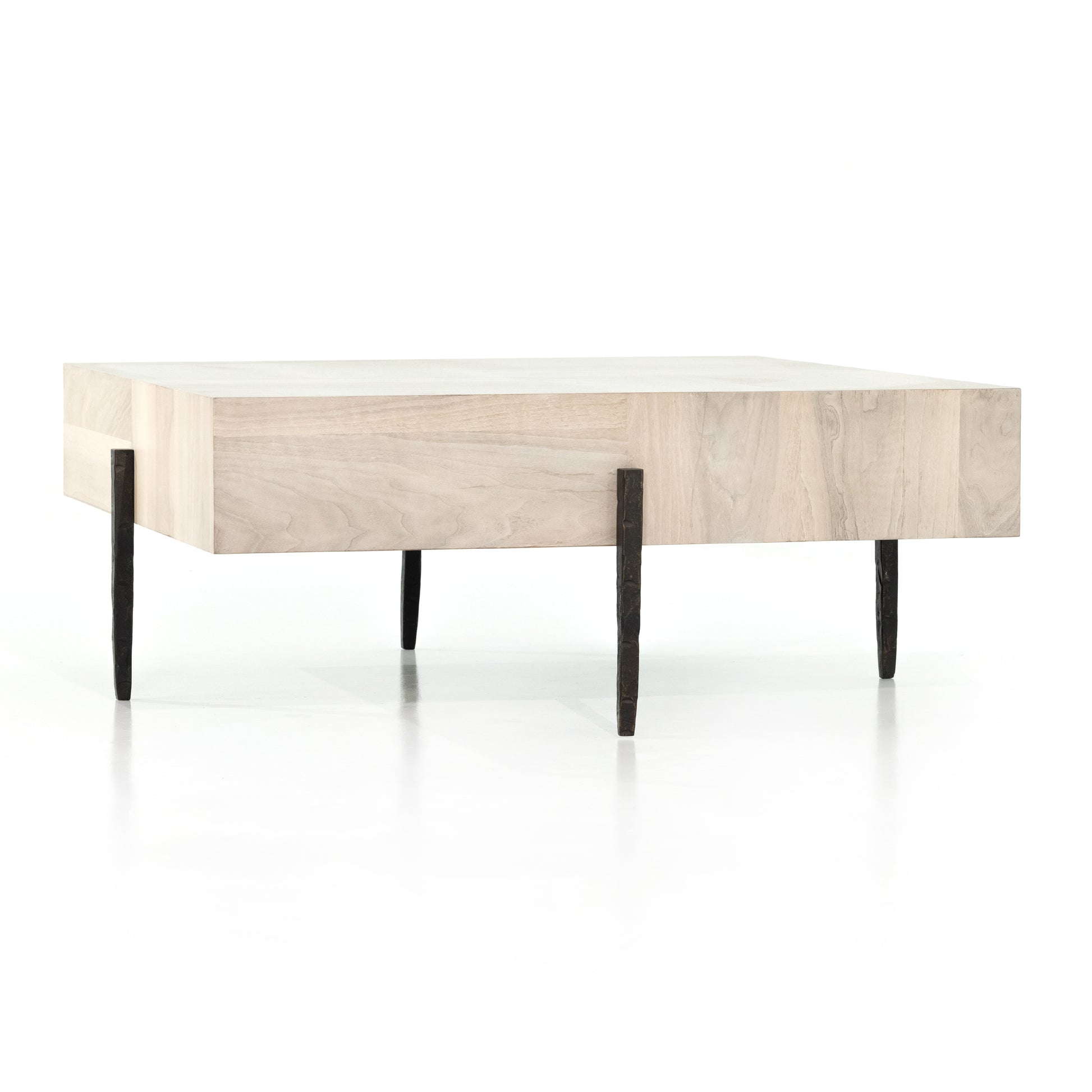 Square geometry and offset hammered iron legs give streamlined shape and warm, modern style. Rich natural surface of thick walnut veneer and pine placed asymmetrically creates an unexpected yet beautiful pattern. Clean corners bring a tailored touch to sun-bleached wood, creating a perfect blend of styles.