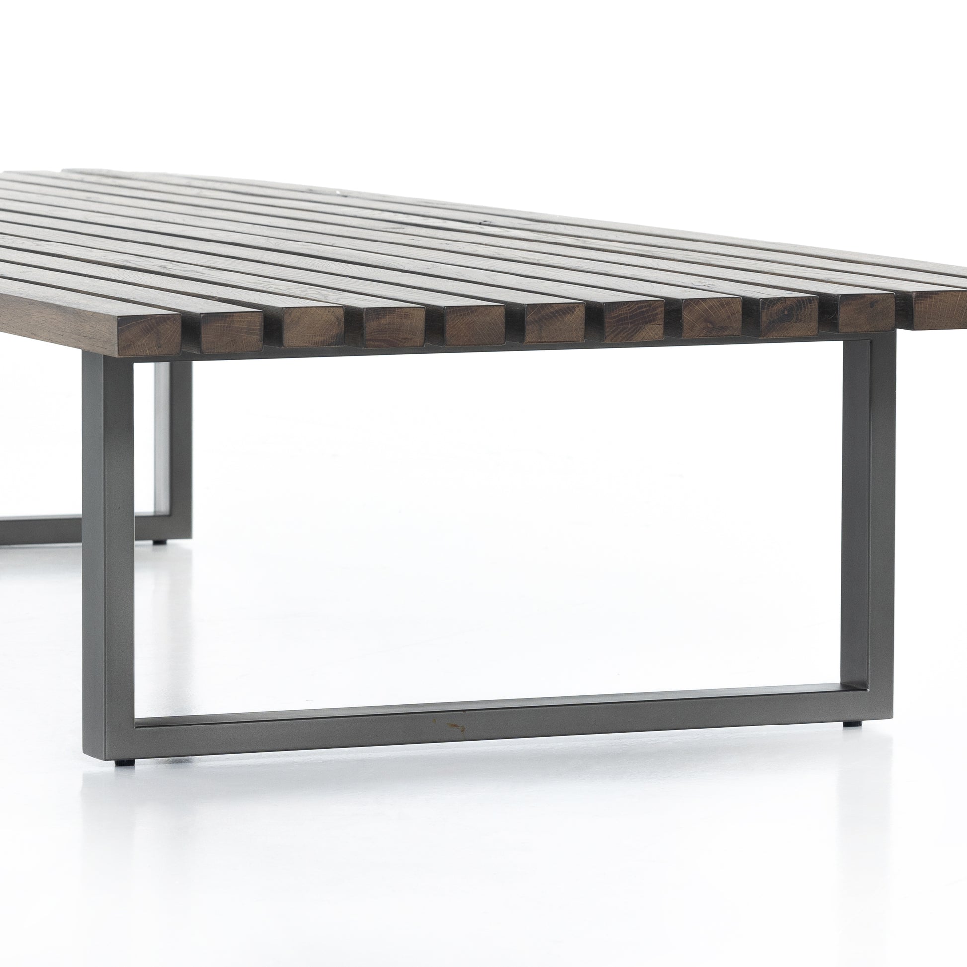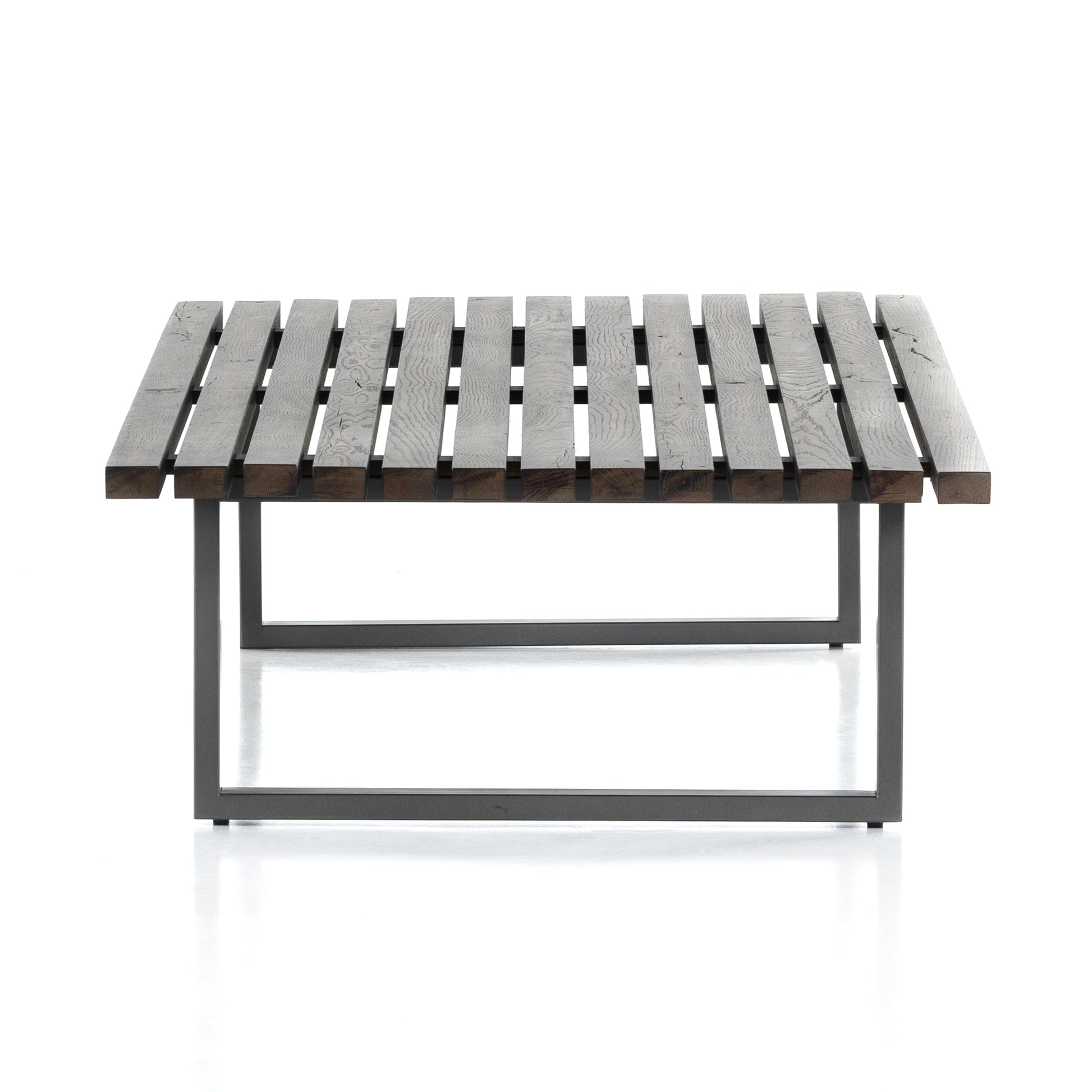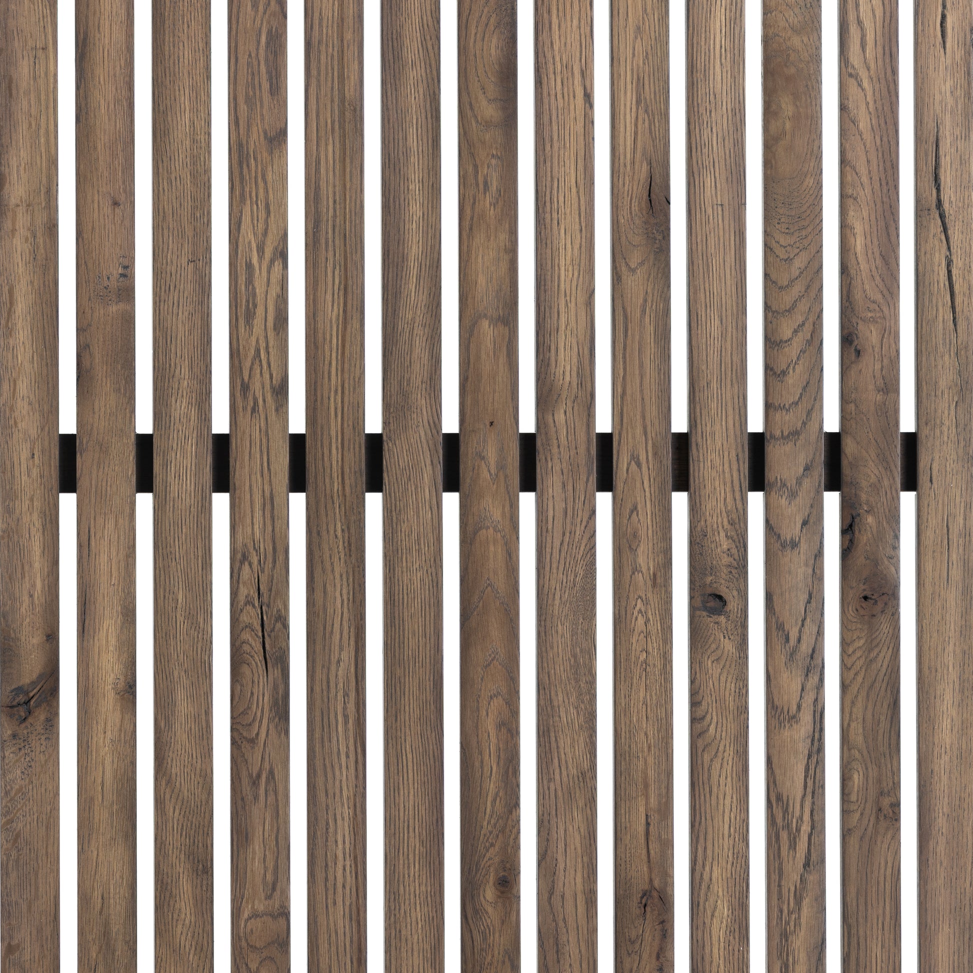 Inspired by linear midcentury décor, a solid oak coffee table is slatted for texture and movement alike, atop a sleigh-style iron base.