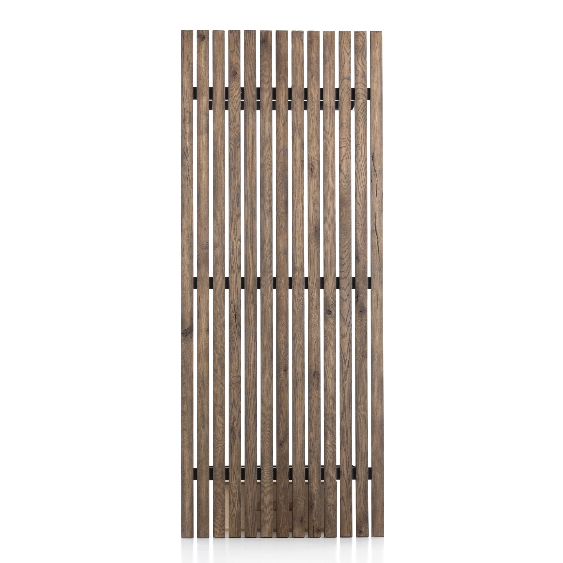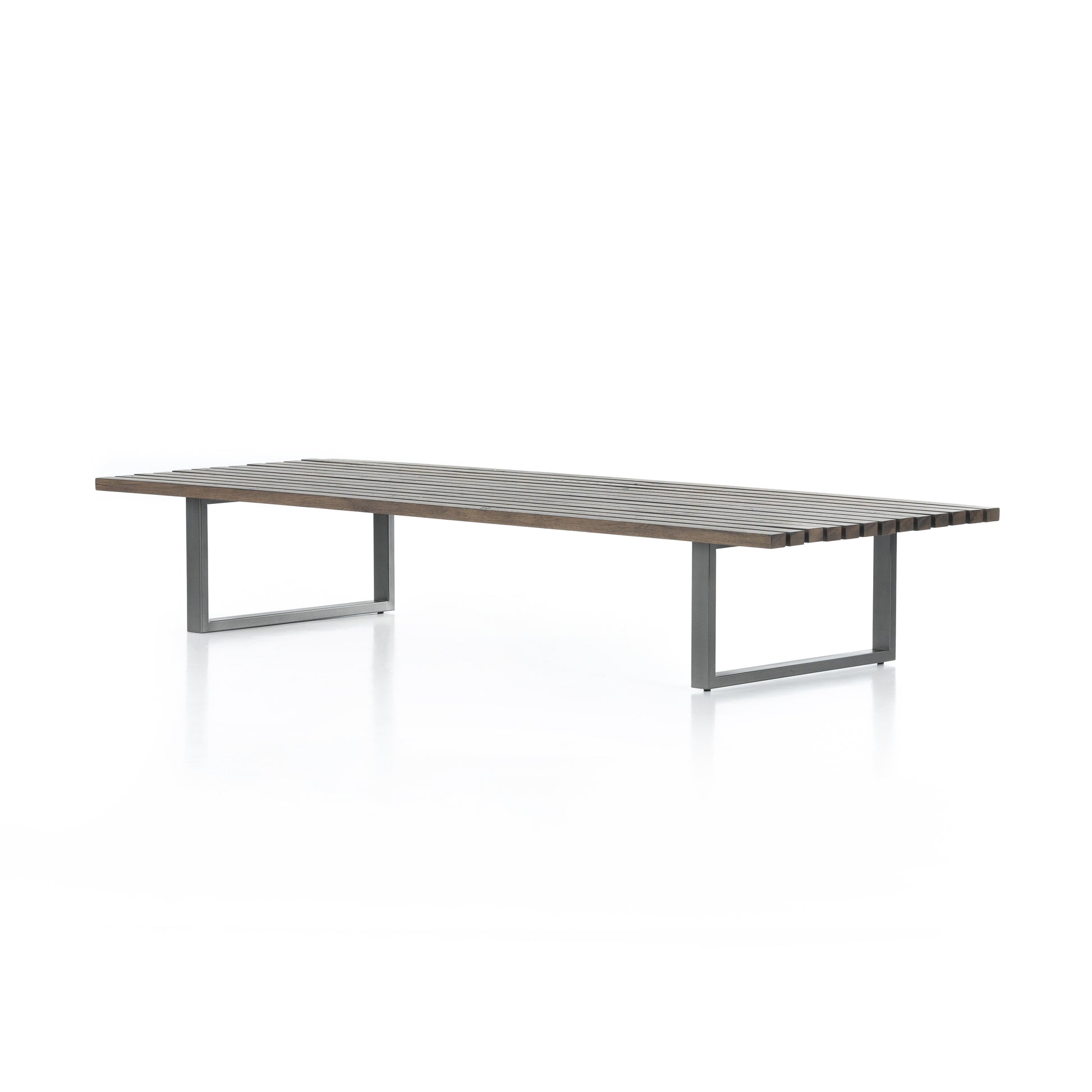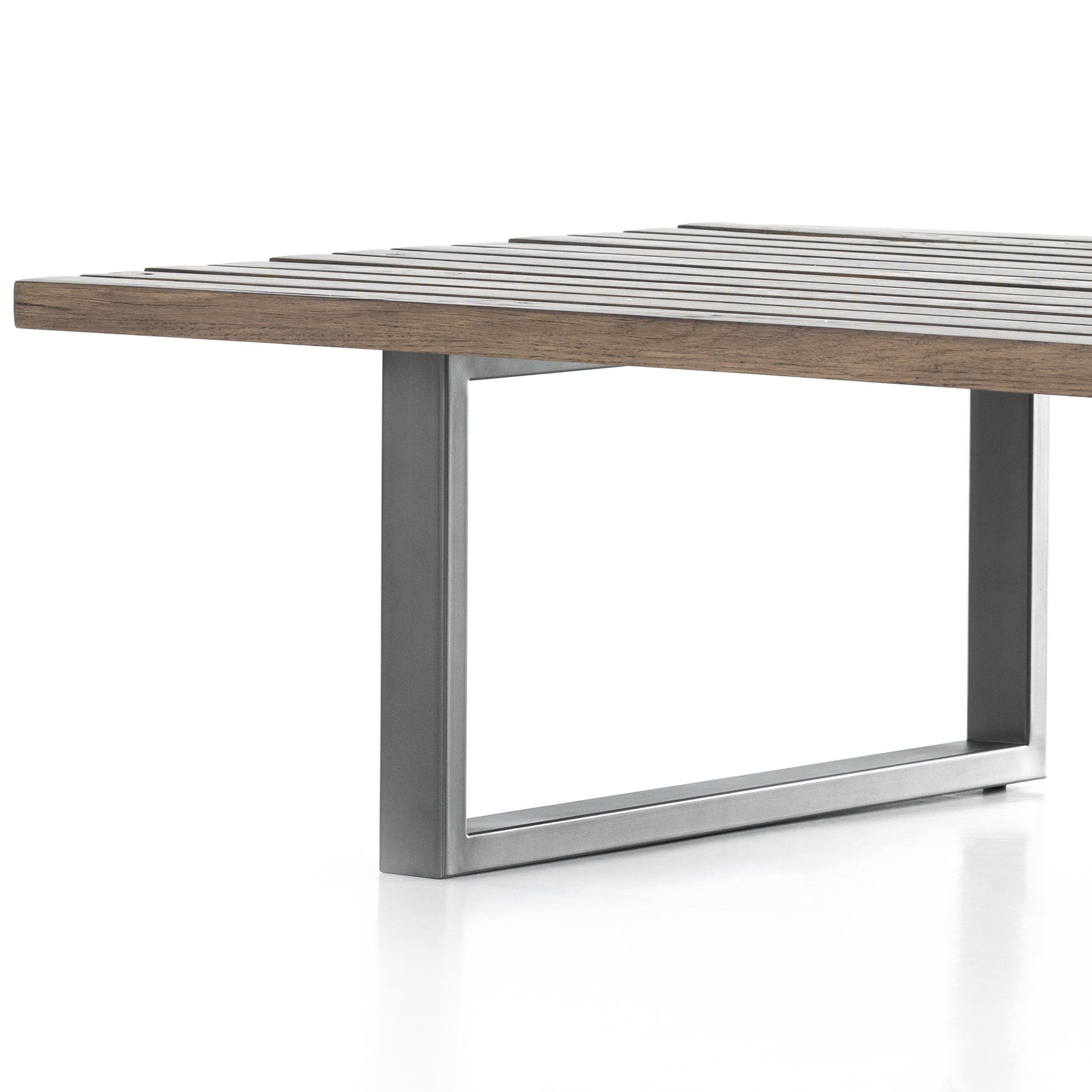 Inspired by linear midcentury décor, a solid oak coffee table is slatted for texture and movement alike, atop a sleigh-style iron base.