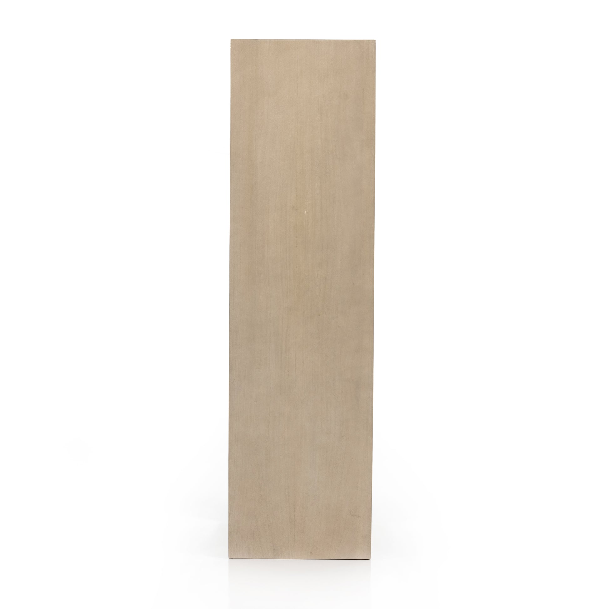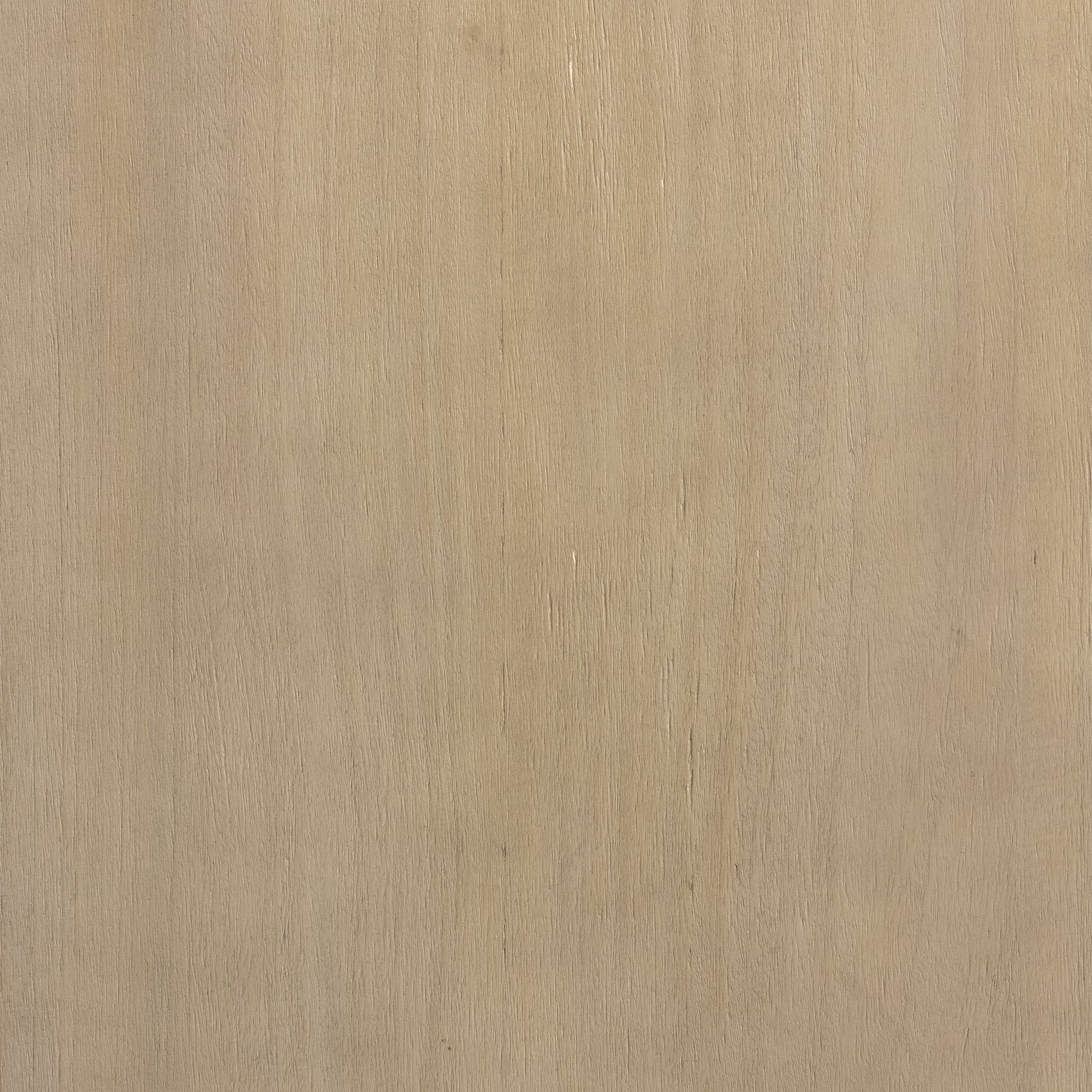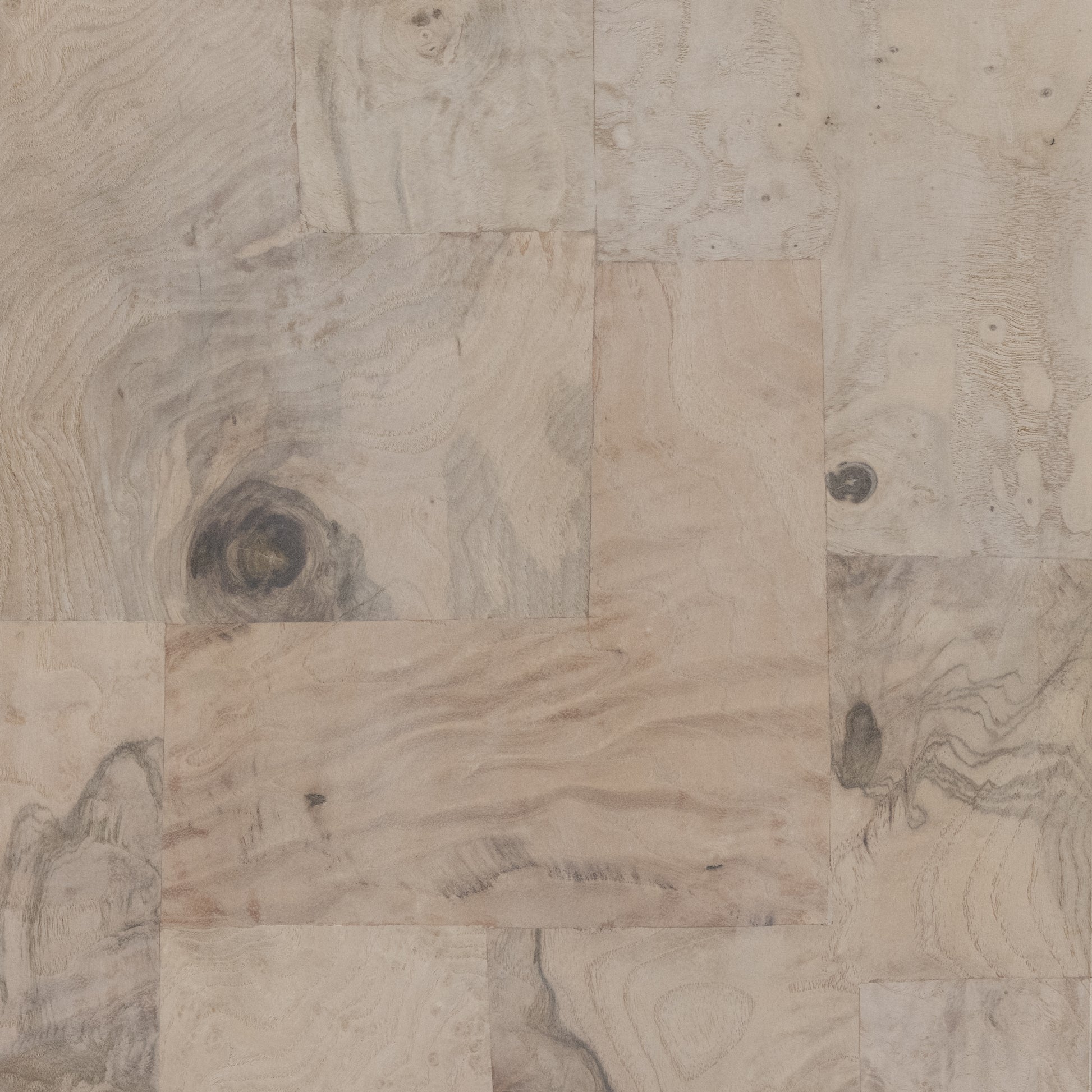 Minimalist gone modern. White-finished mahogany forms a cantilever-like C shape, while an accent leg of bleached ash burl veneer speaks subtly to Brutalist inspiration. Color variance in sun-bleached finishes is expected and reflects woods' naturally unique character.