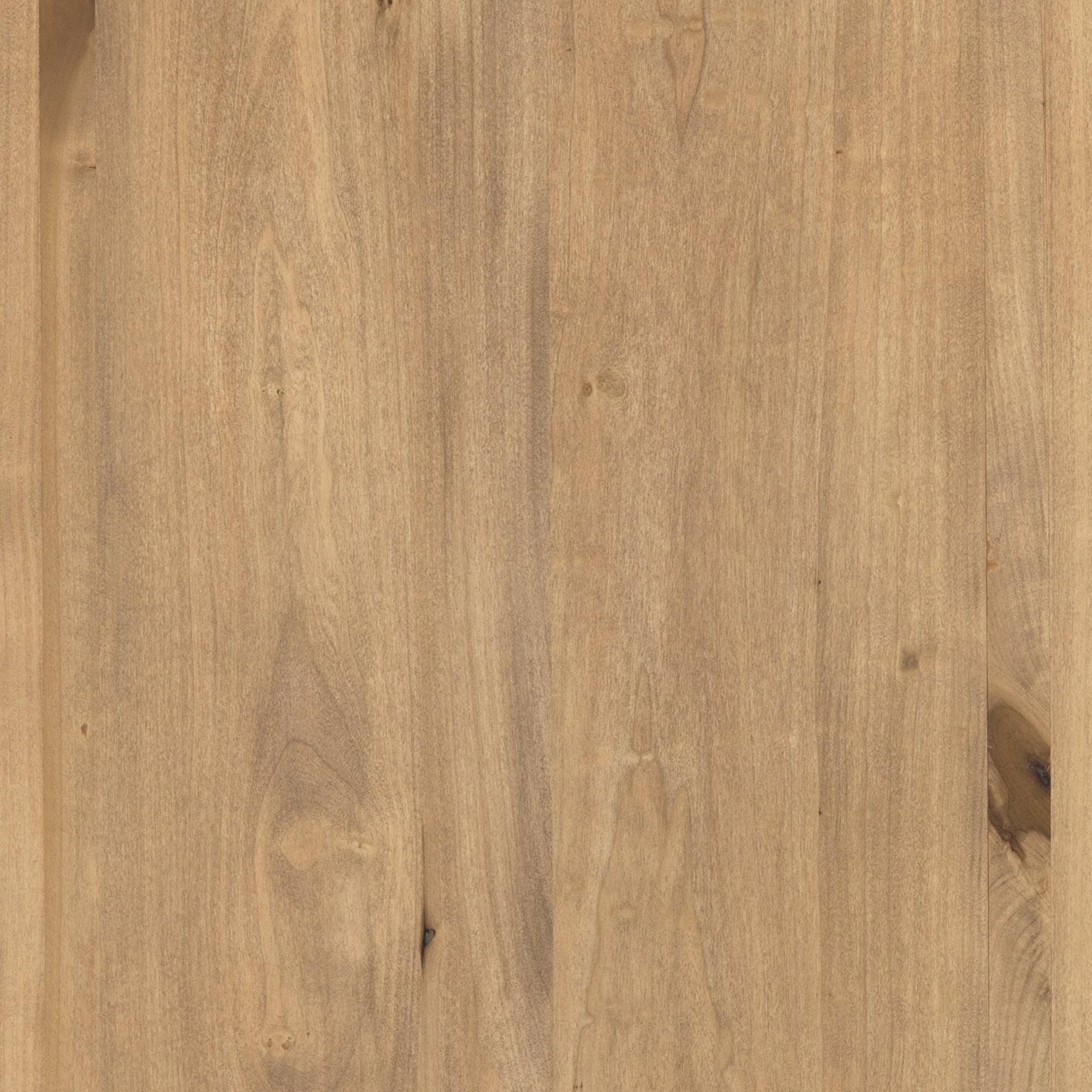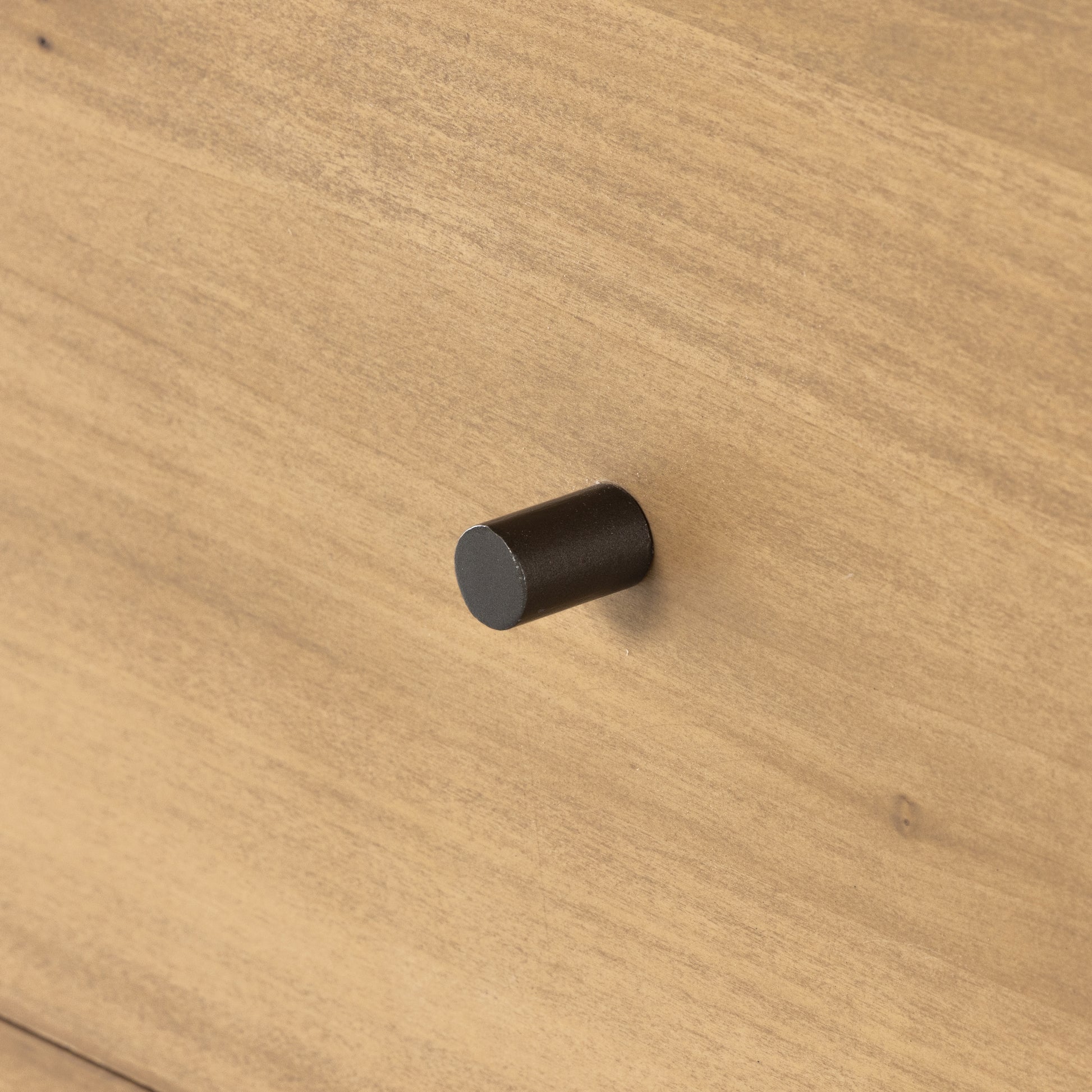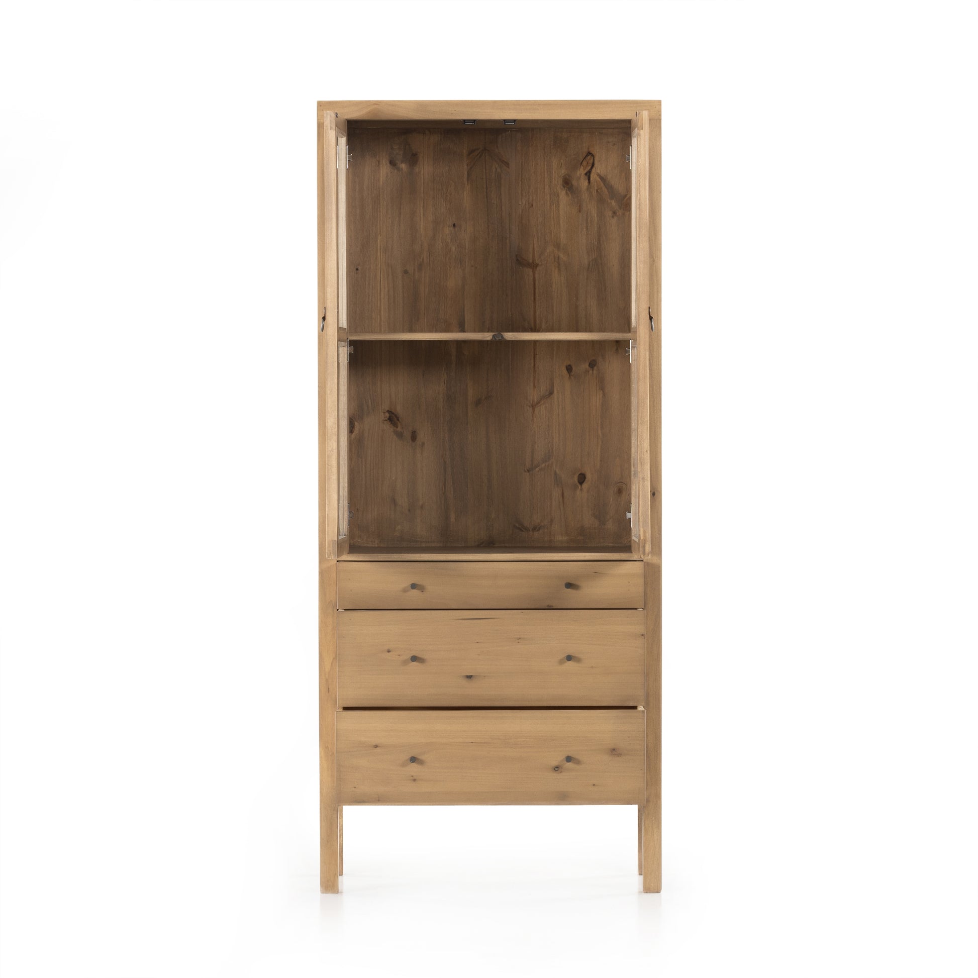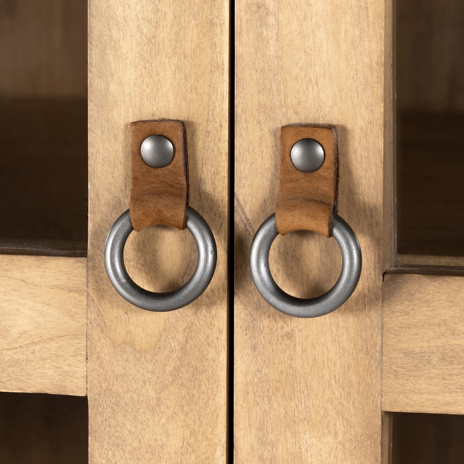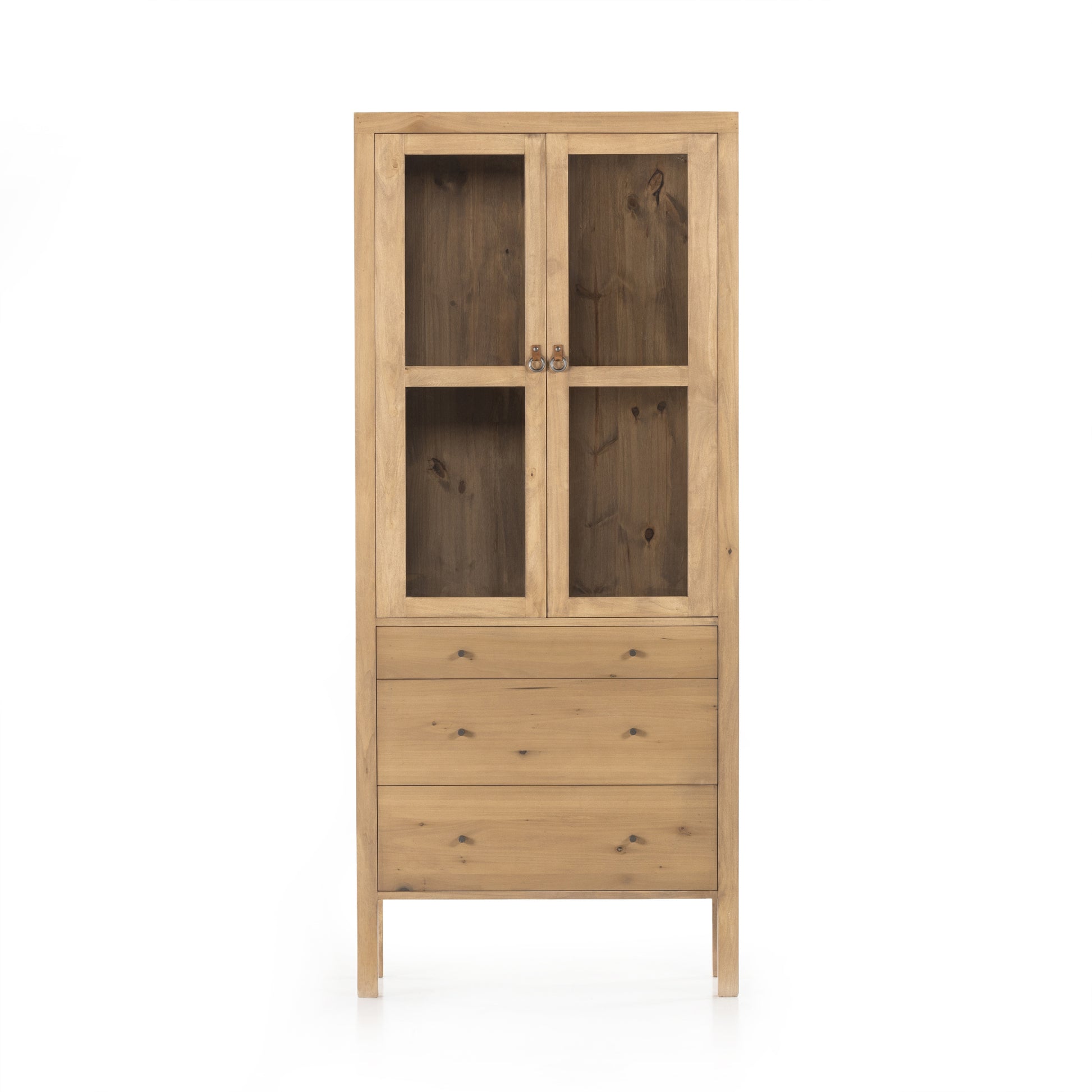 Beautifully simple in spirit. Solid dry-washed poplar forms clean, Parsons-style cabinetry, with three drawers and glass-front doors. Faux dovetail joinery plus iron and leather hardware place a material-driven update to Shaker-inspired styling.