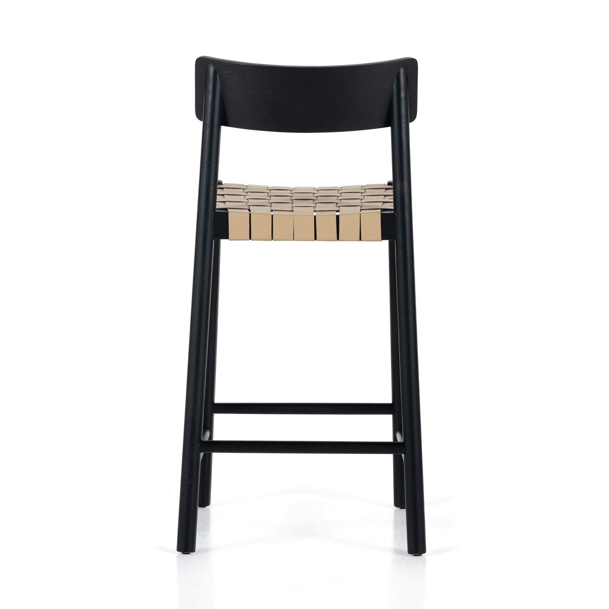 Almond leather and black-finished ash fuse to craft a slim, stylish silhouette. A classic basketweave seat pattern complements the simple lines of this bar stool's streamlined frame.