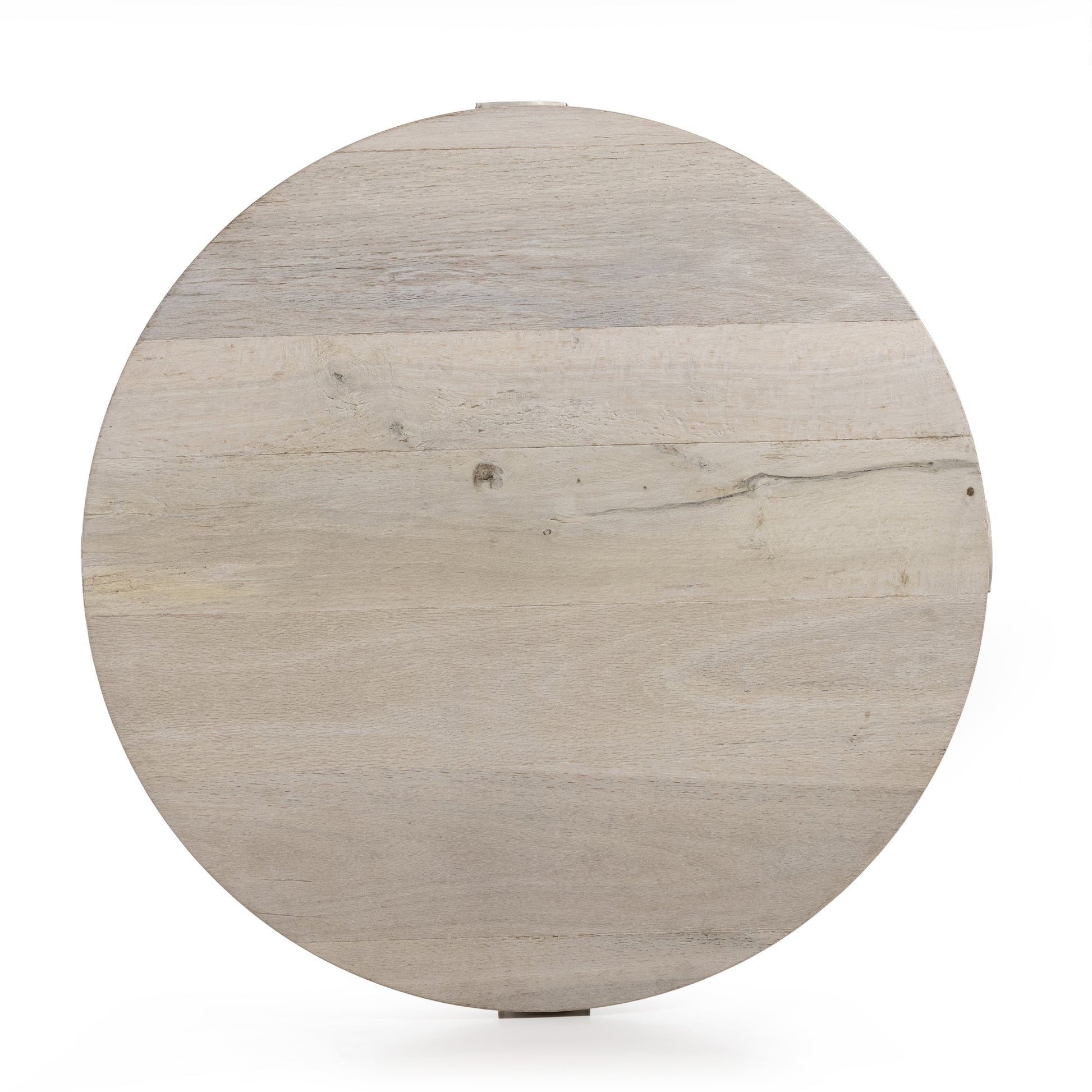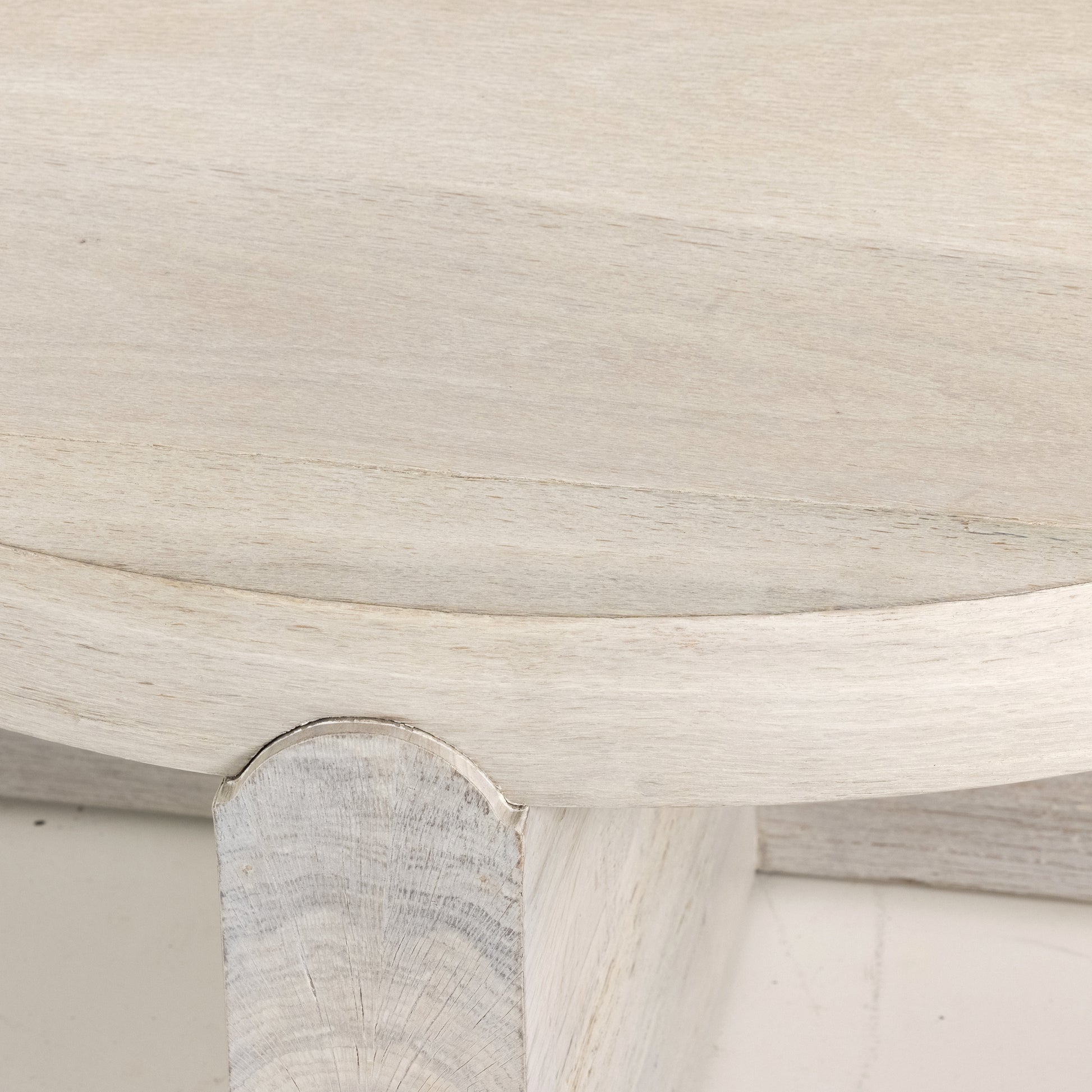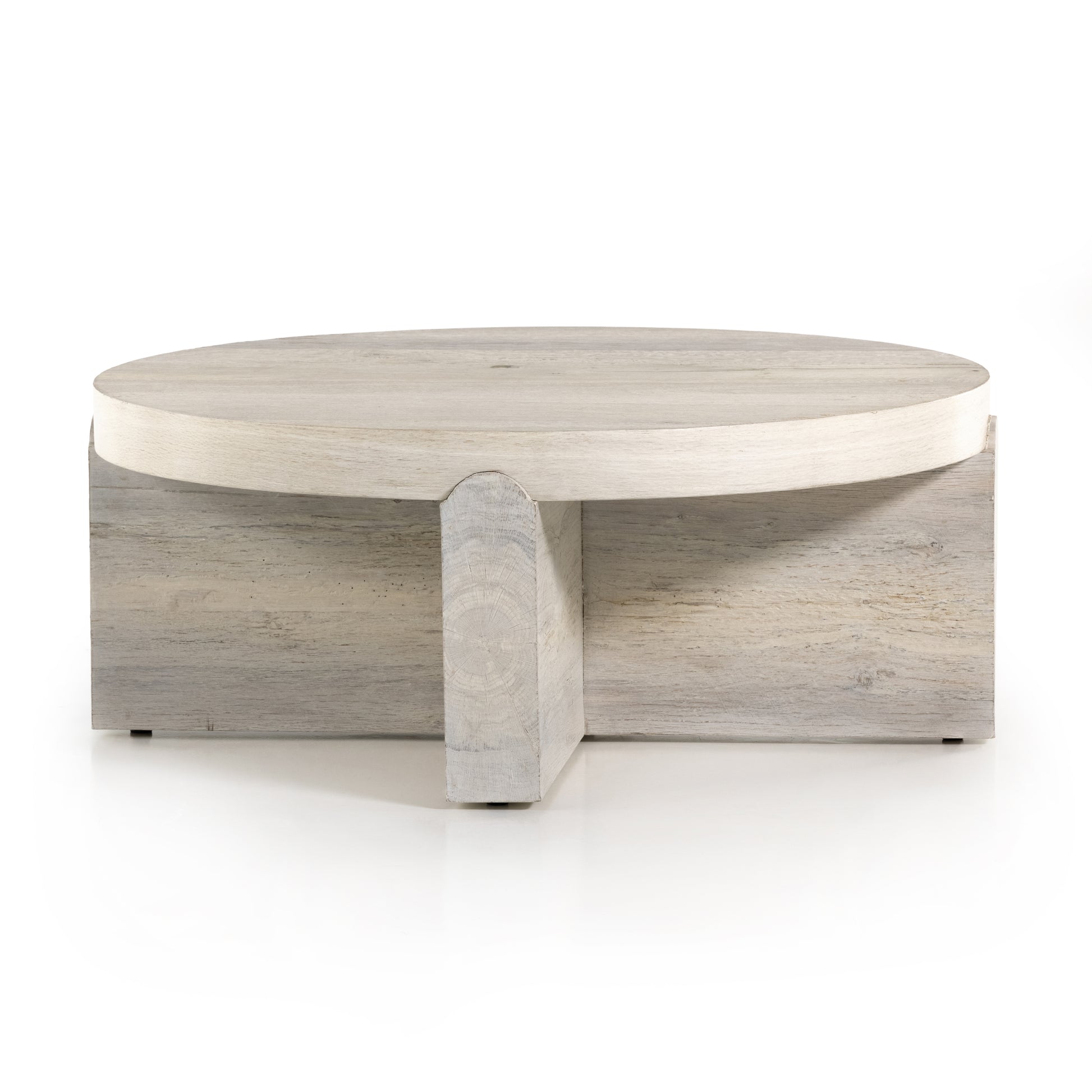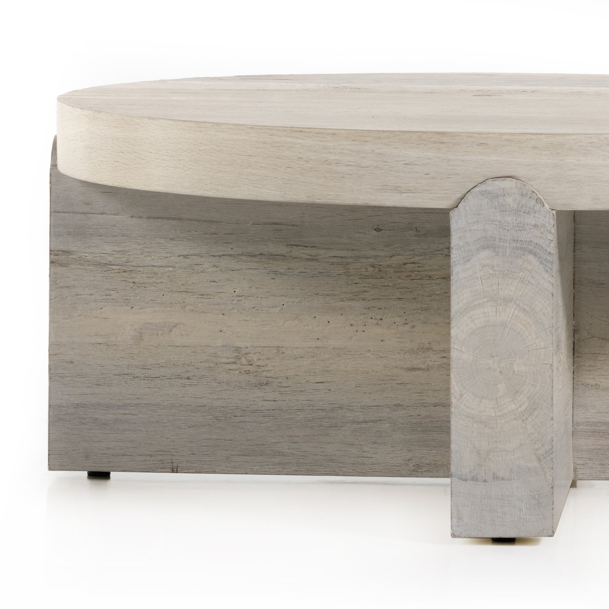 Keep things light and monochromatic with a rounded coffee table made from bleached oak veneer. Slab-style legs intersect a thick-cut top for an intriguing, geometric touch. A subtle color variance is to be expected from piece to piece, reflective of sun bleaching process.