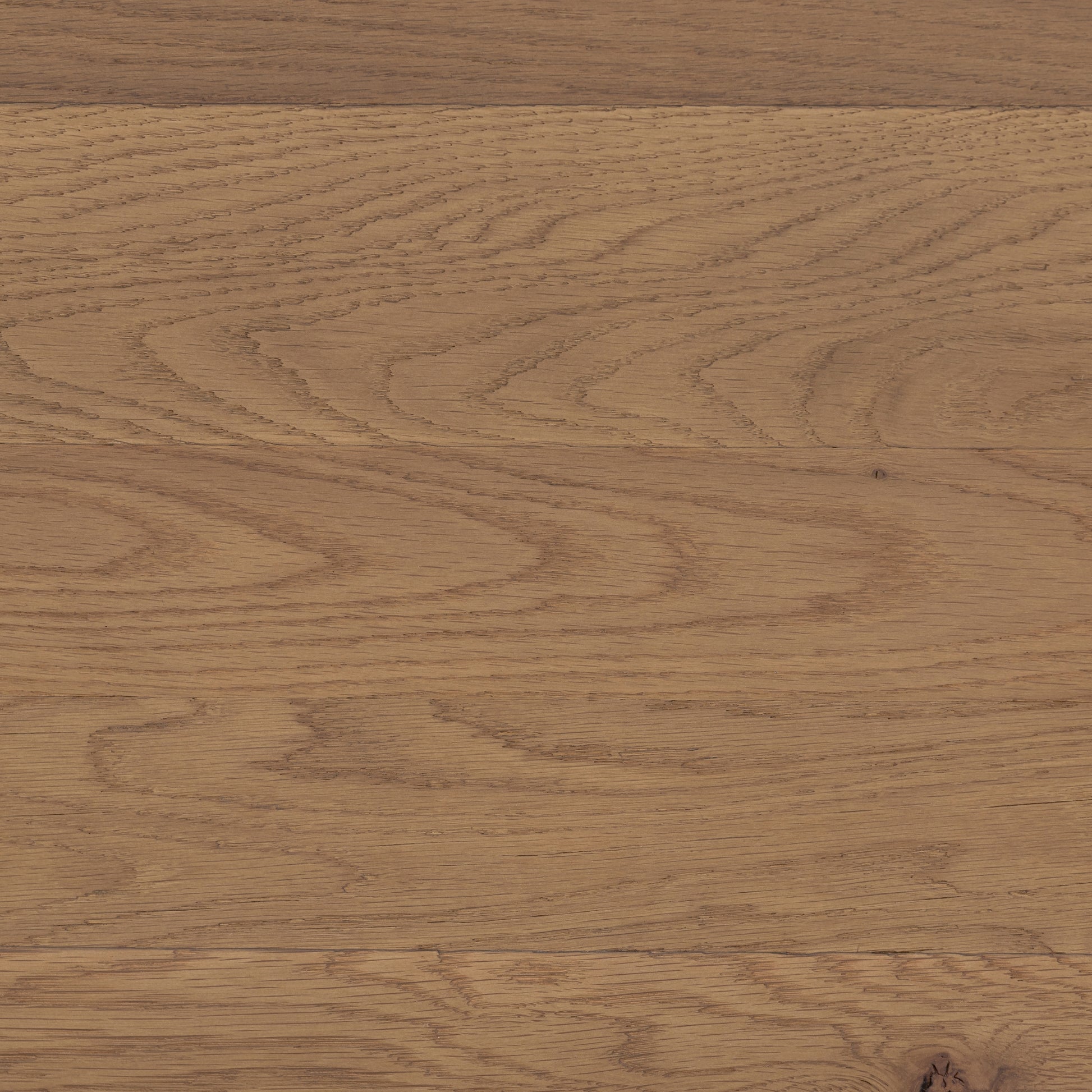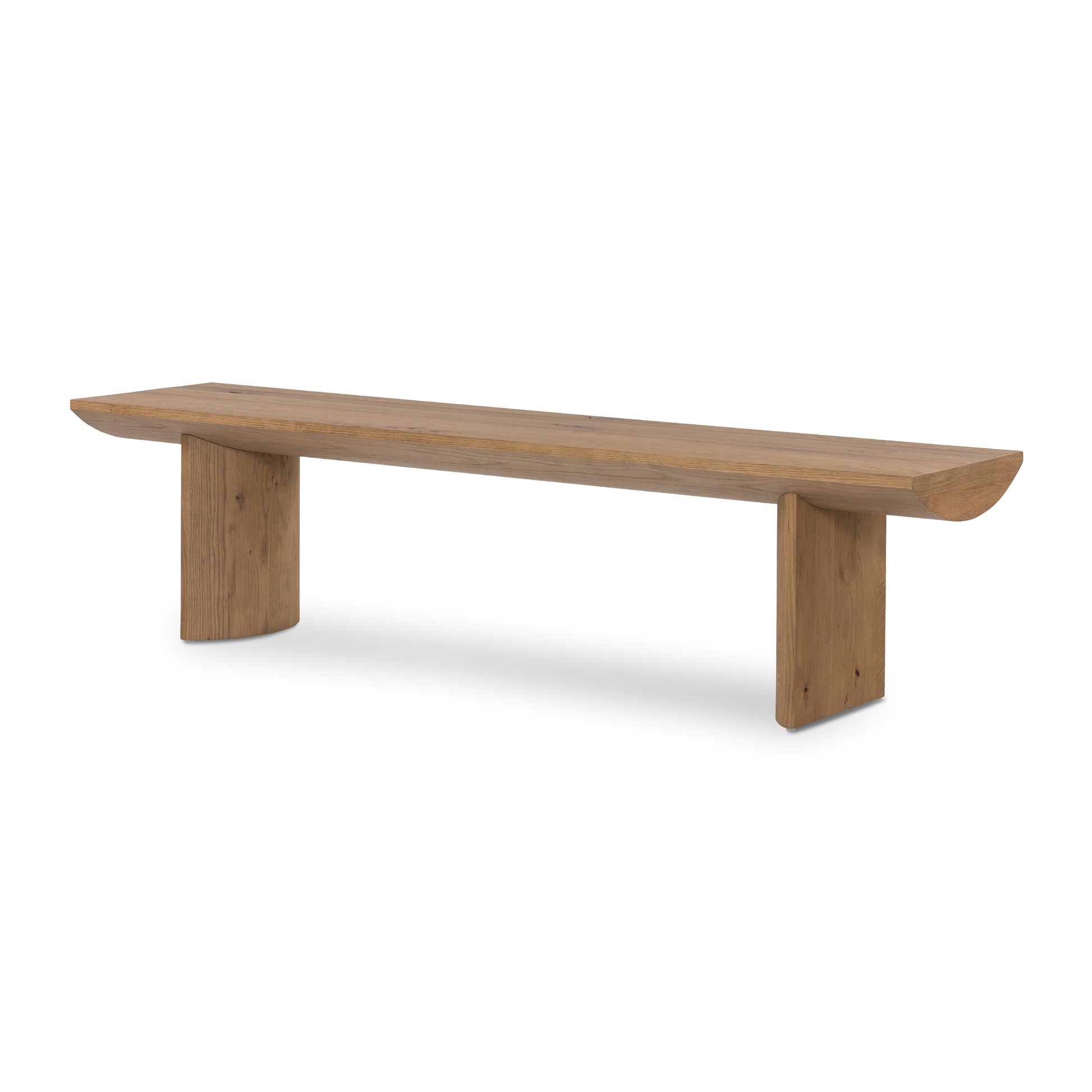 A shape-driven dining bench made from thick-cut oak veneer features overscale proportions and half-moon shaping in a warm grey-brown finish. Option to pair with matching table.