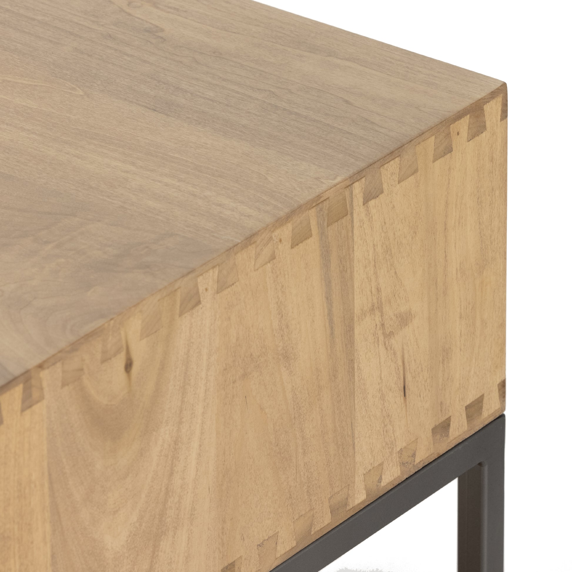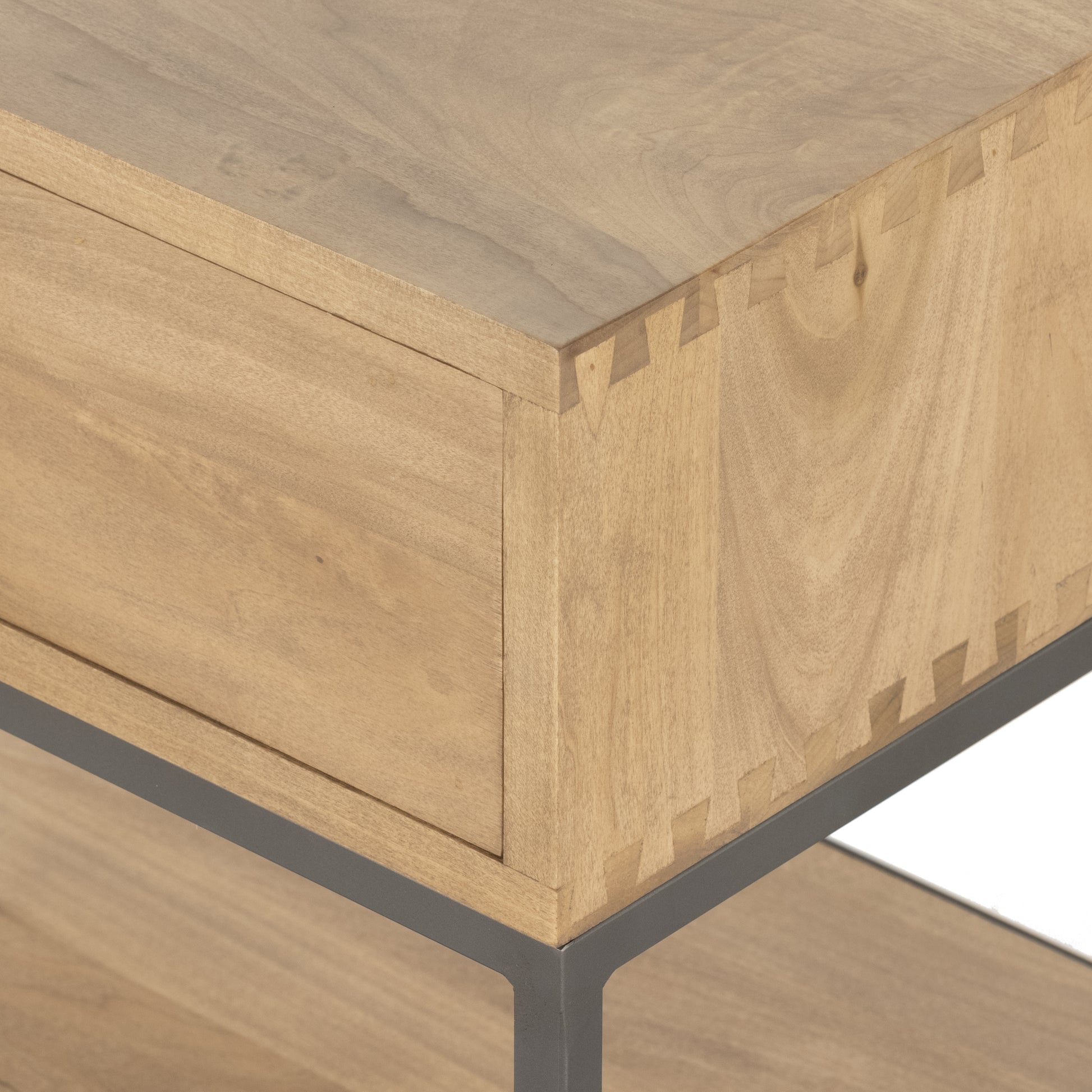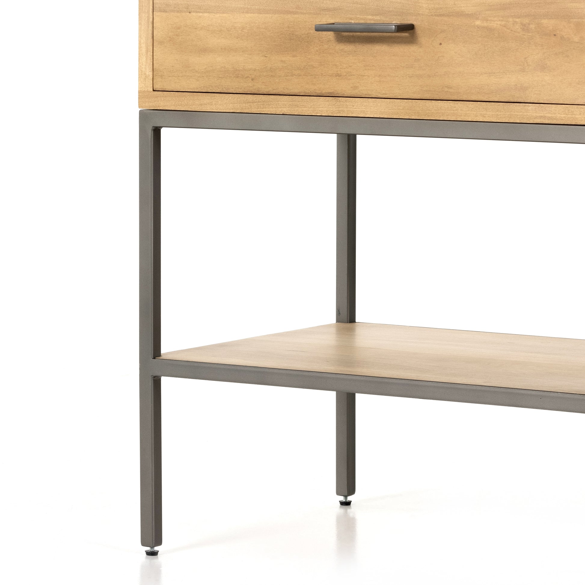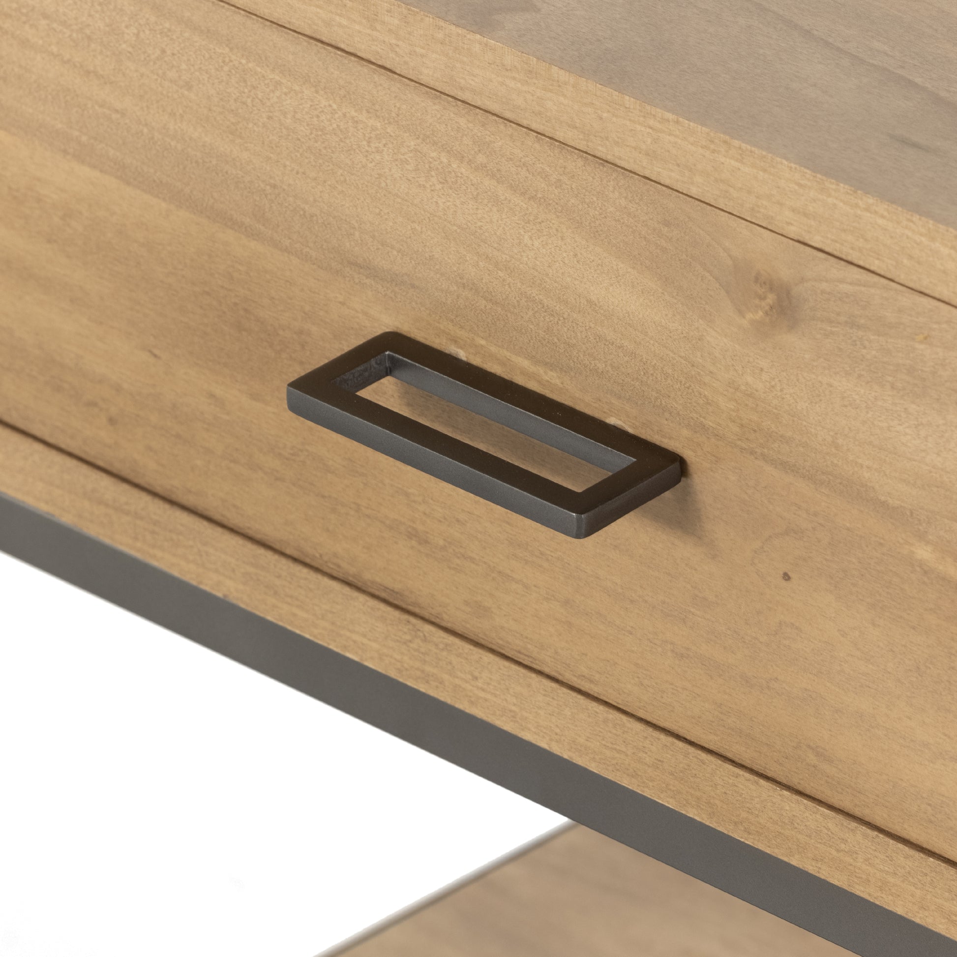 Solid poplar in a soft, natural hue creates a linear silhouette for a spacious drawer and shelf-space with iron framing and hardware.