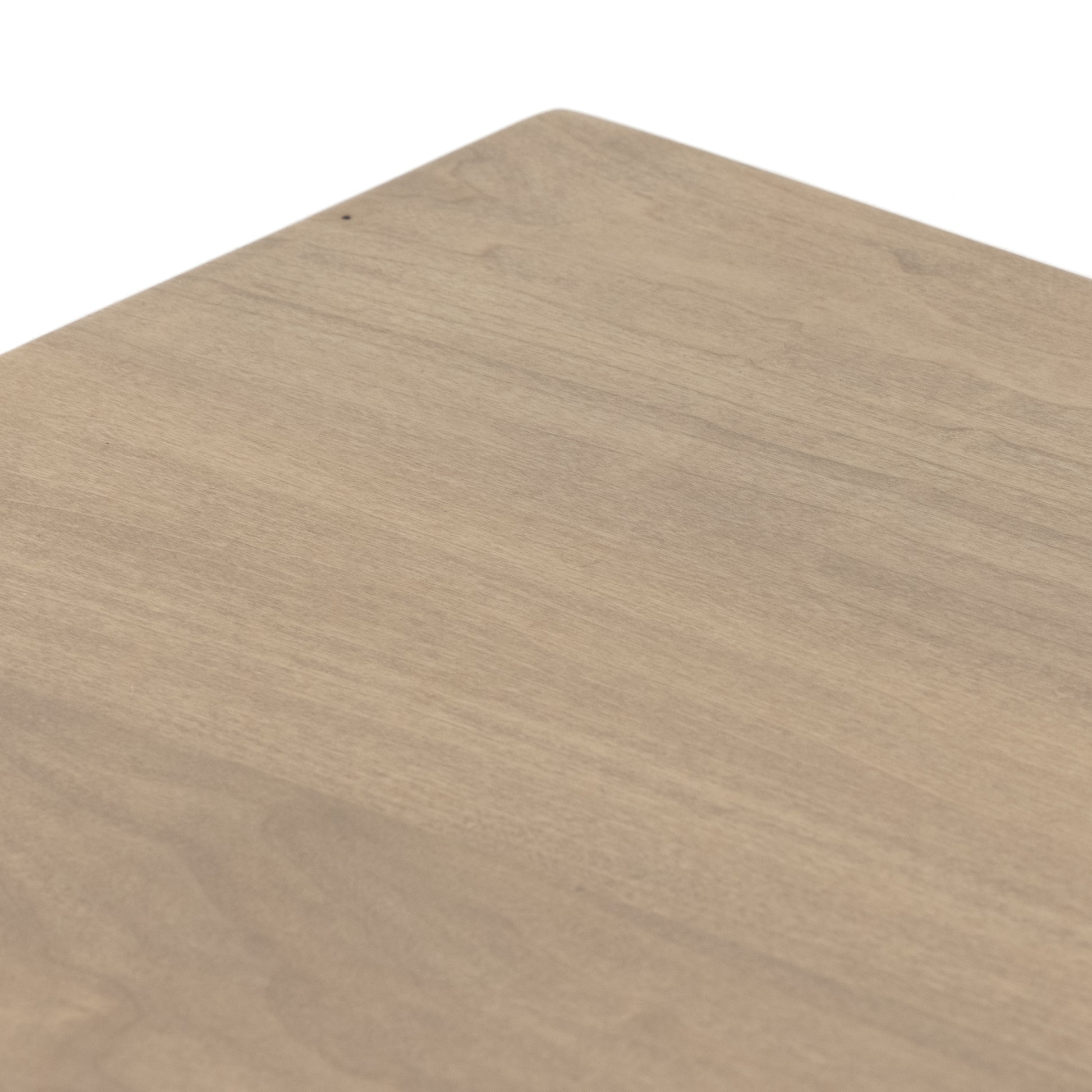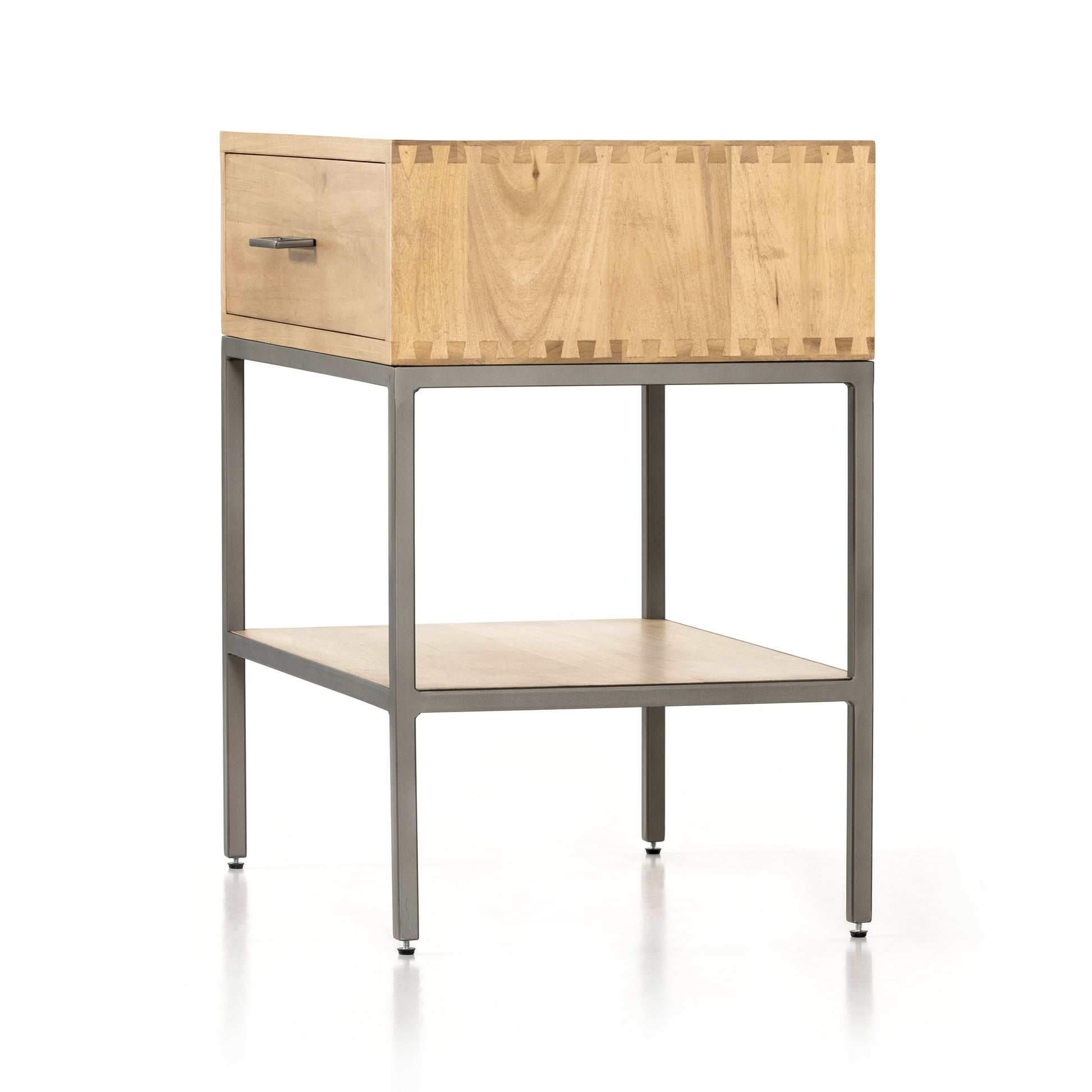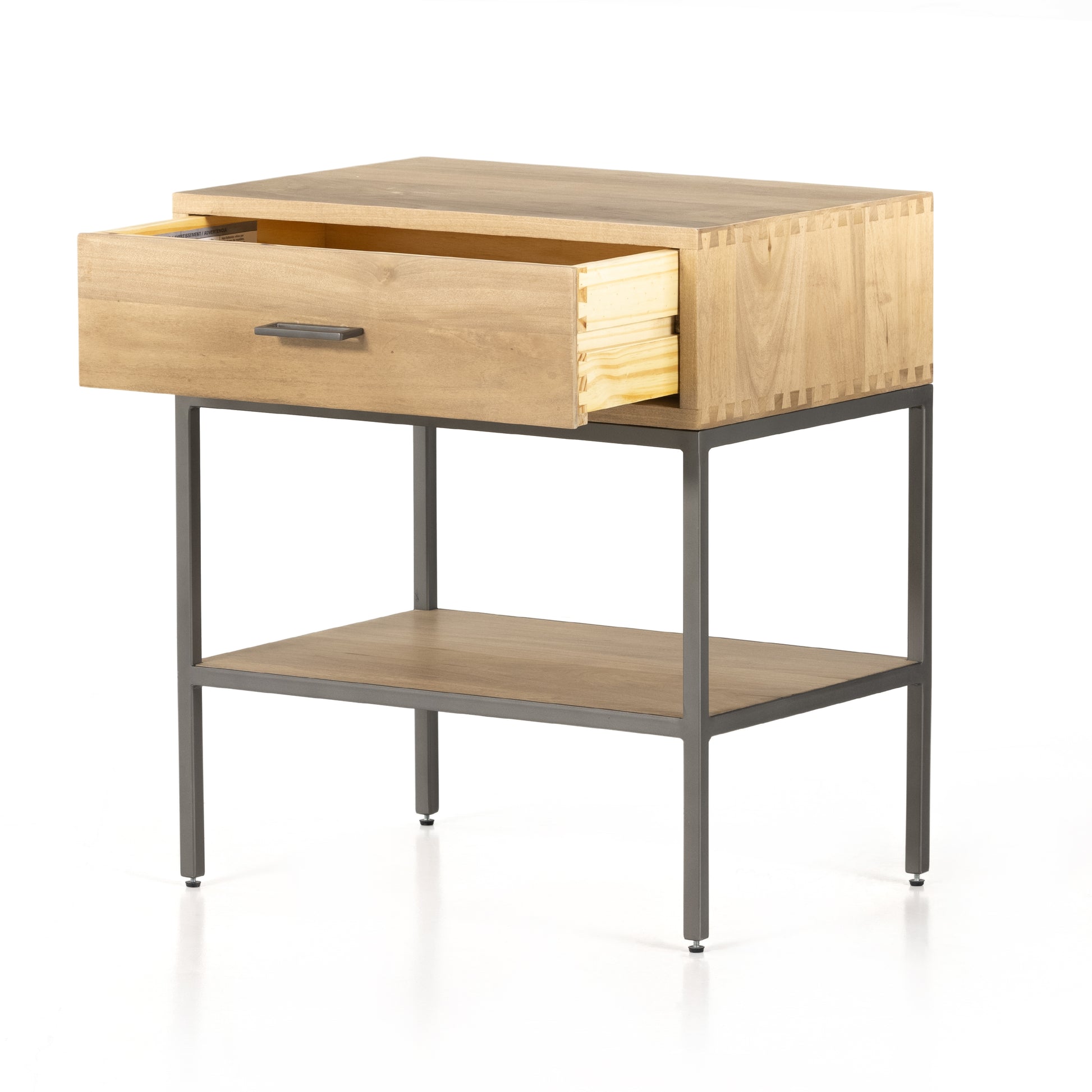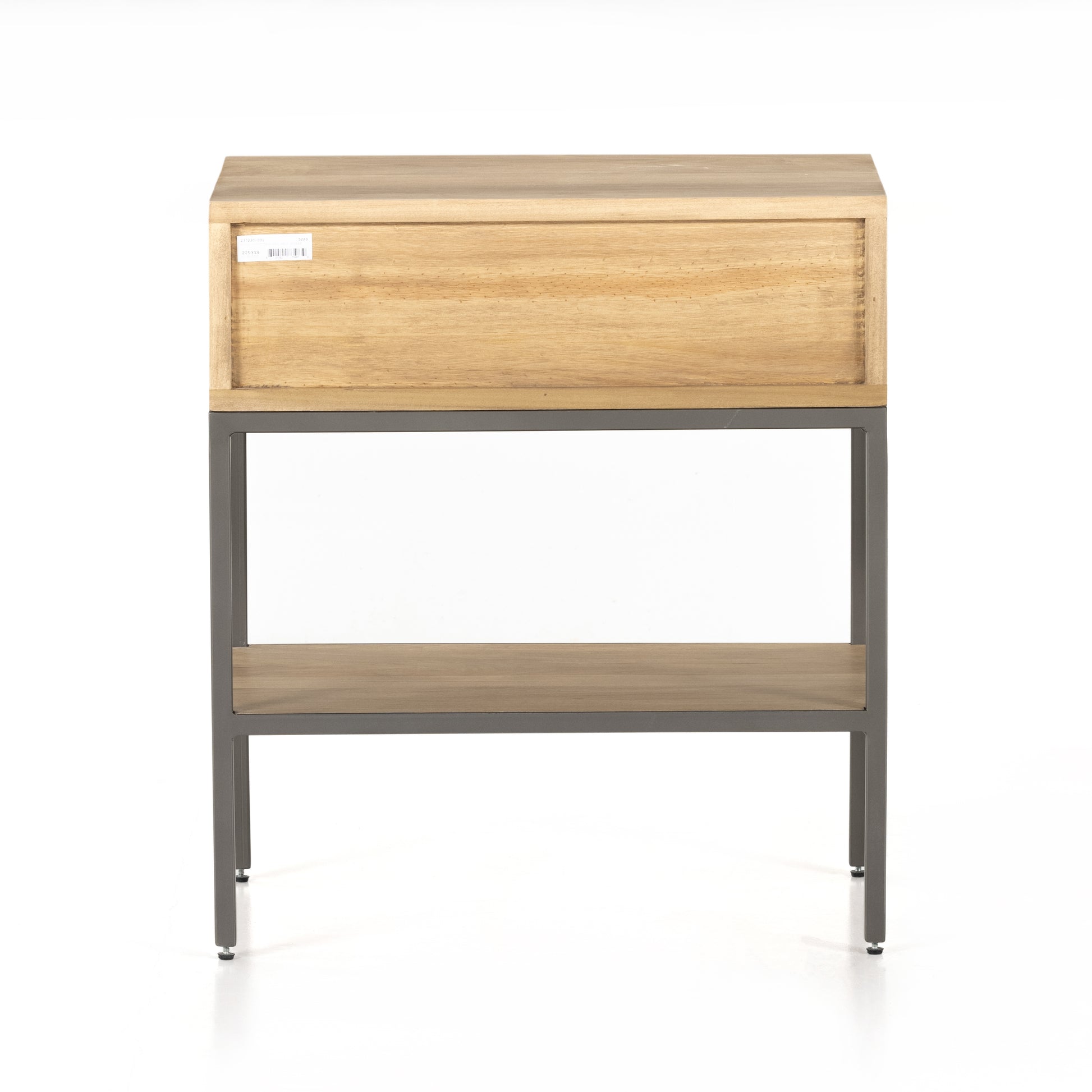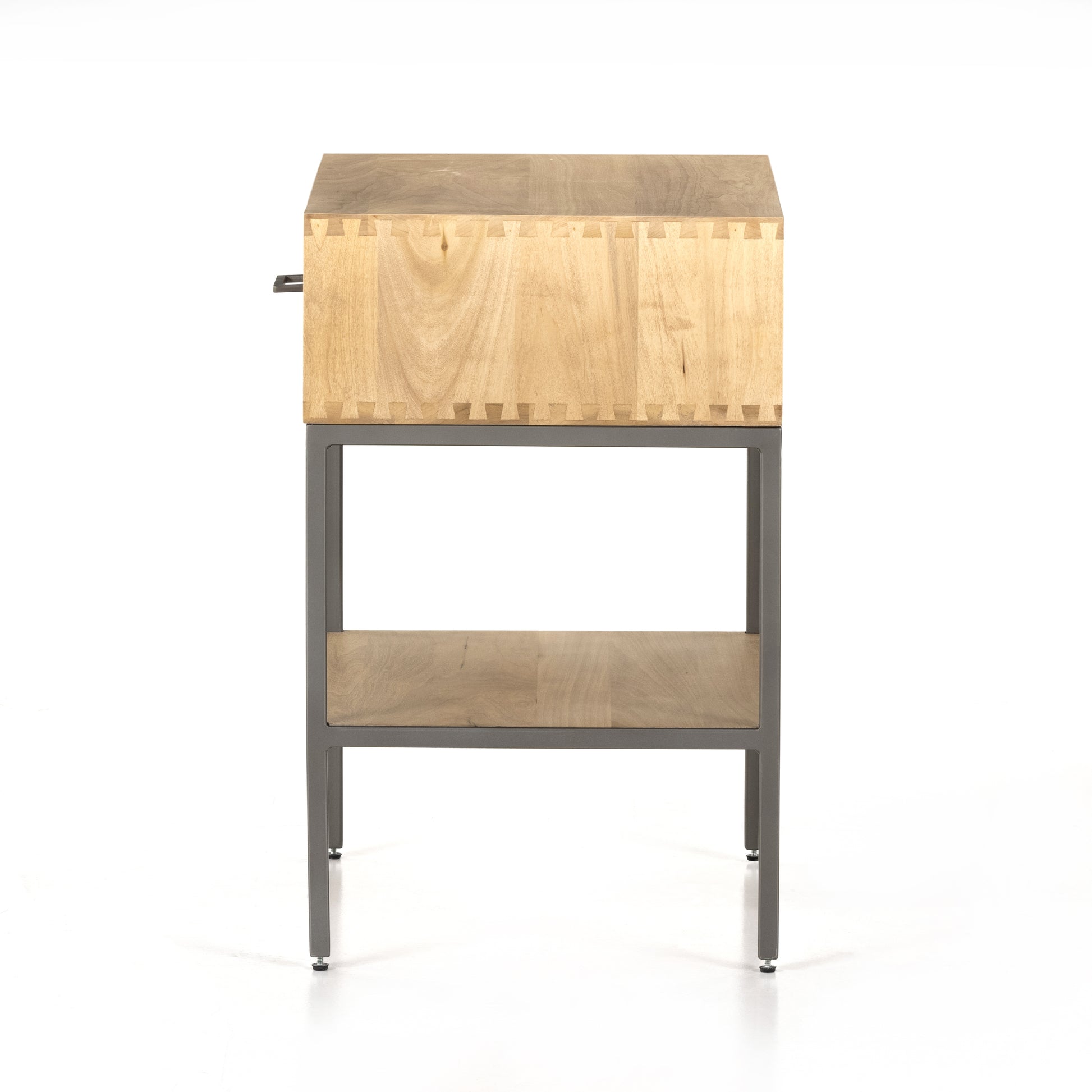 Solid poplar in a soft, natural hue creates a linear silhouette for a spacious drawer and shelf-space with iron framing and hardware.