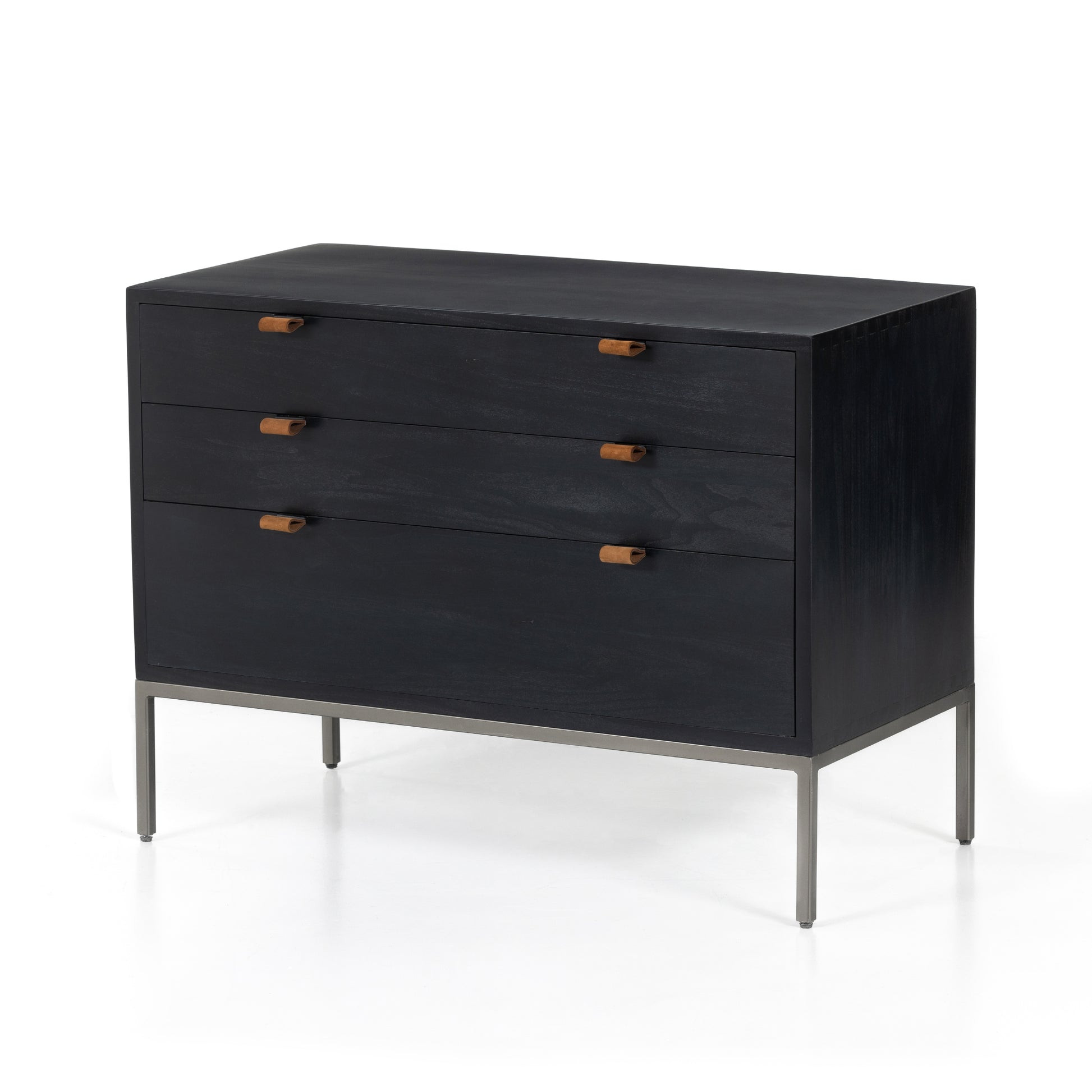 Simple style, inspired by midcentury décor. Made from black-washed poplar, a roomy three-drawer nightstand brings extra storage space to the bedside. Top-grain leather pulls add a textural finishing touch.