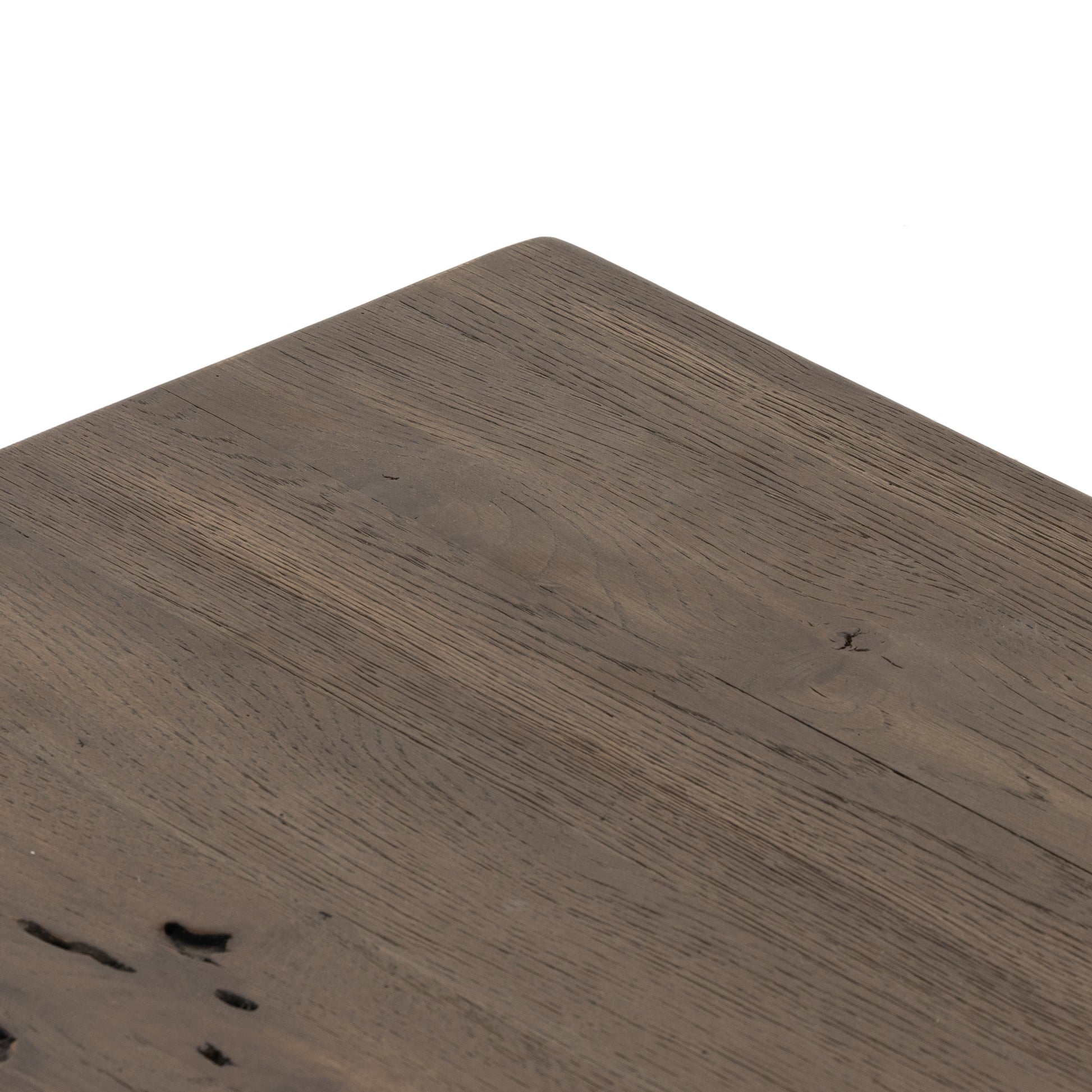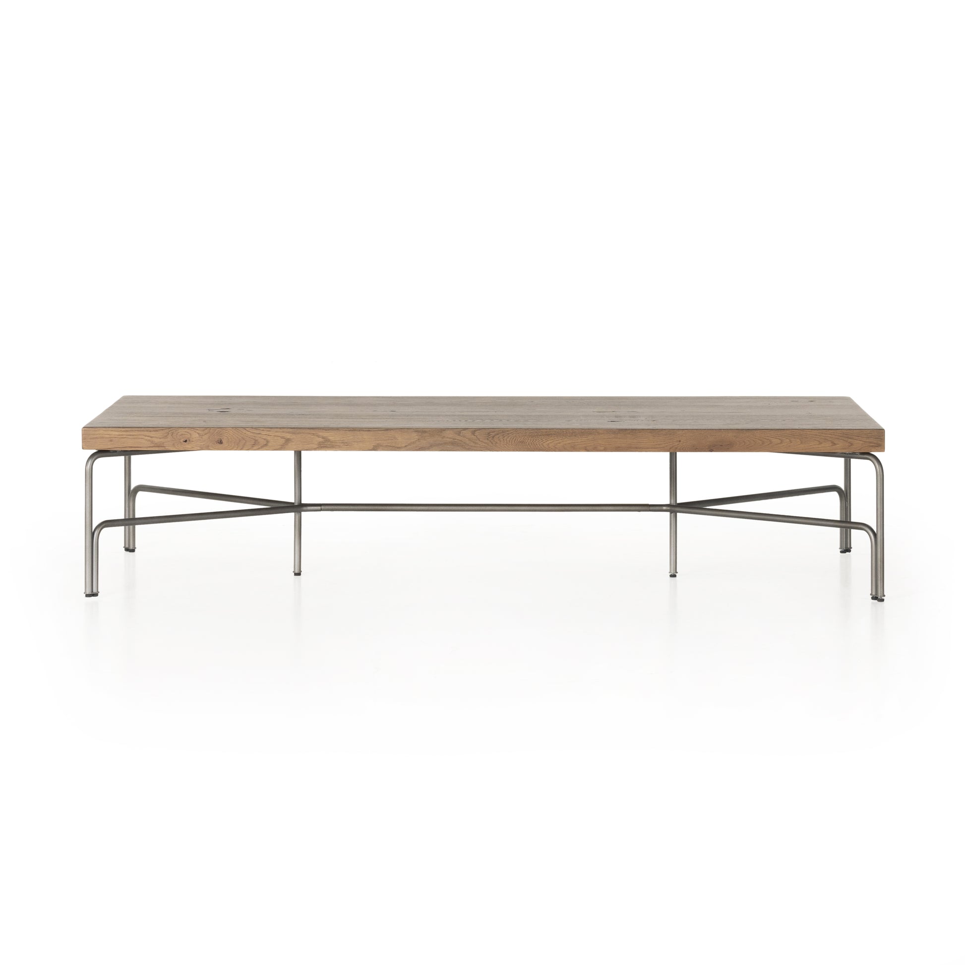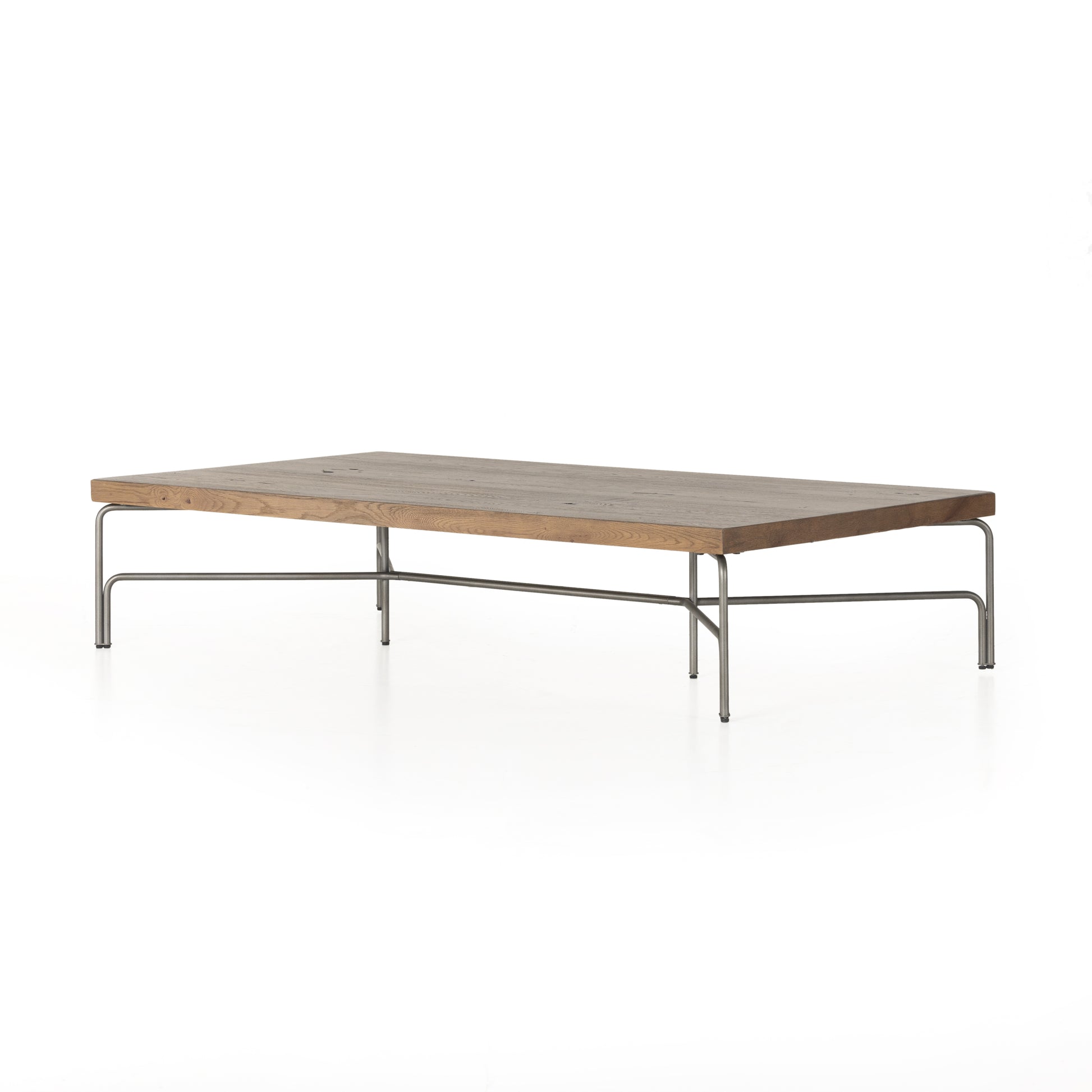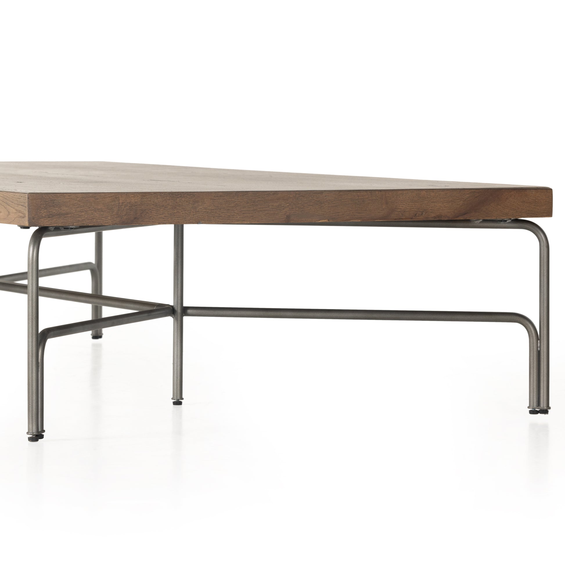 Atop a tubular iron base finished in a brushed gunmetal, a long, lean tabletop of resawn oak in a rustic brown hue anchors the living room in style.