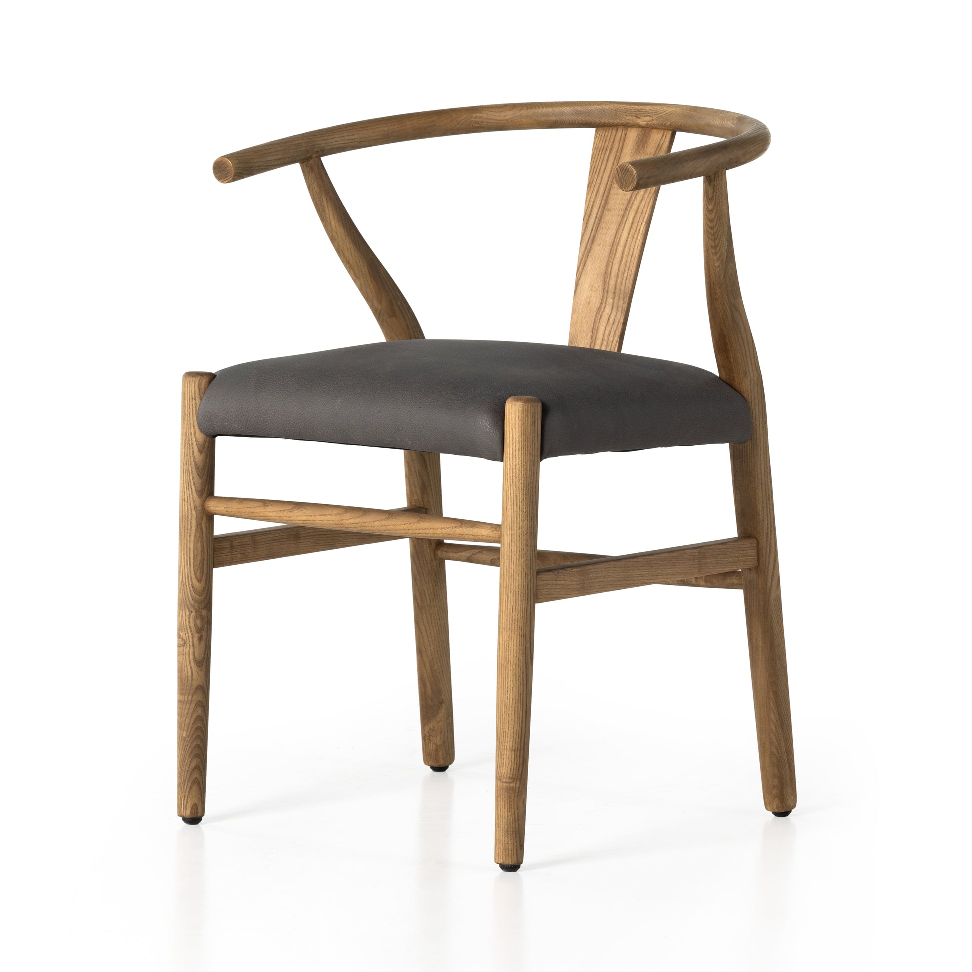 Pale-finished solid ash forms a classic wishbone-style frame for top-grain leather seating in a modern graphite.