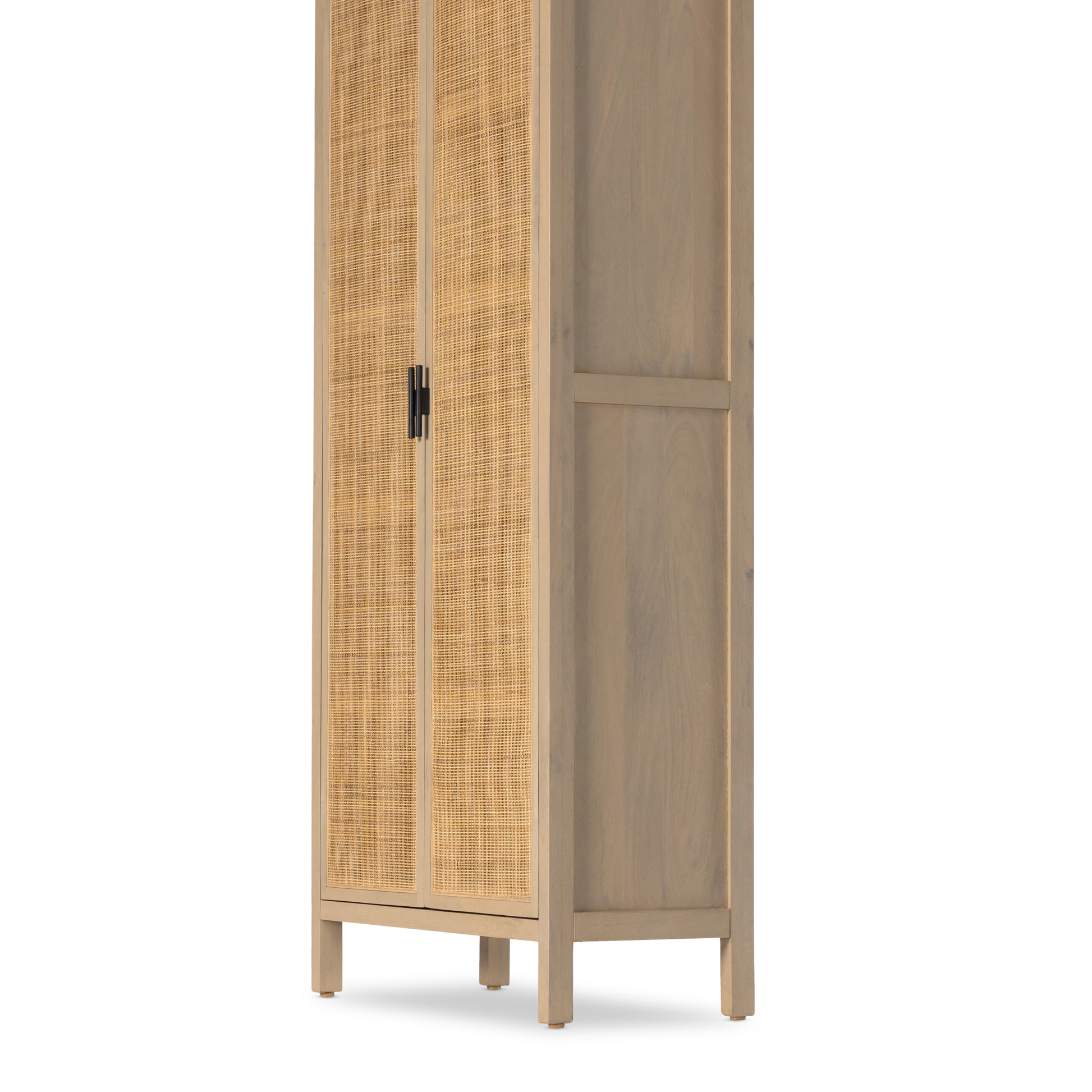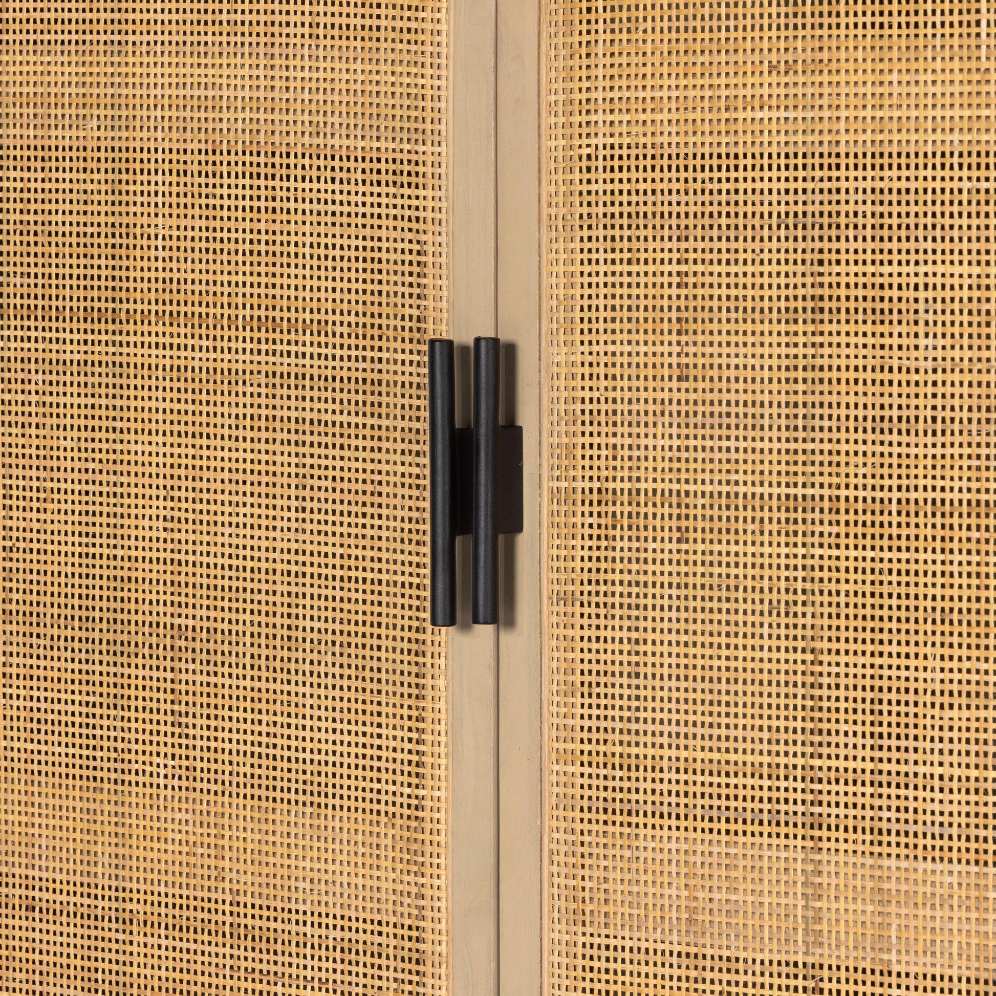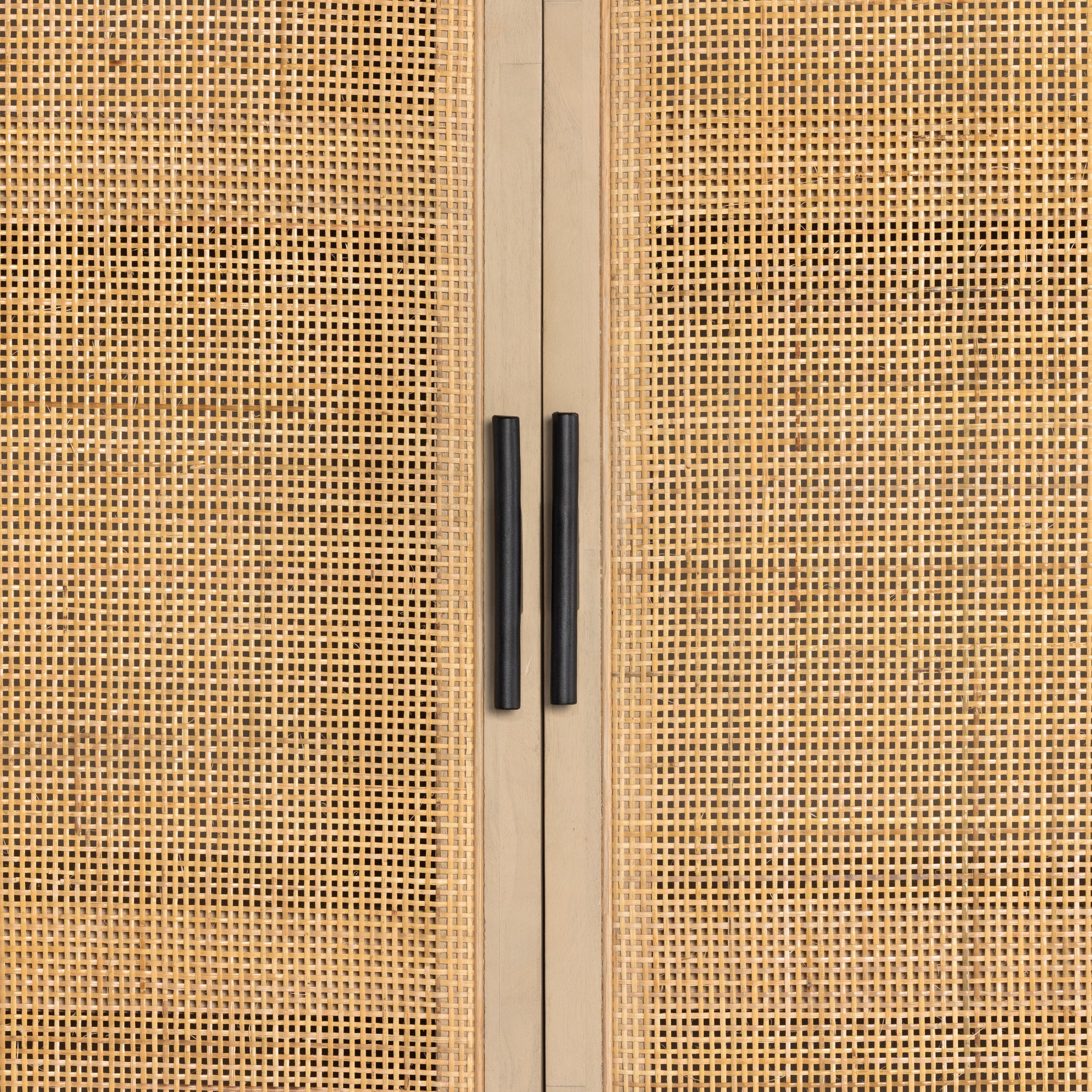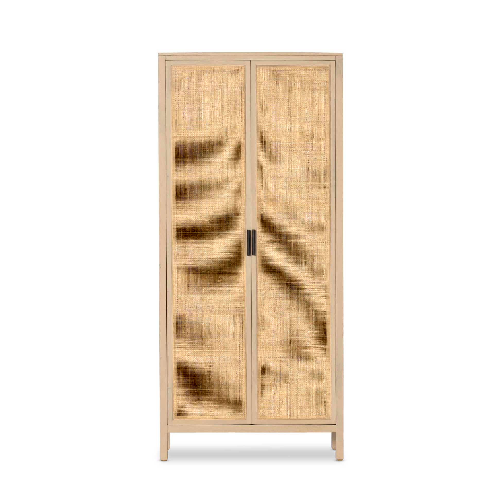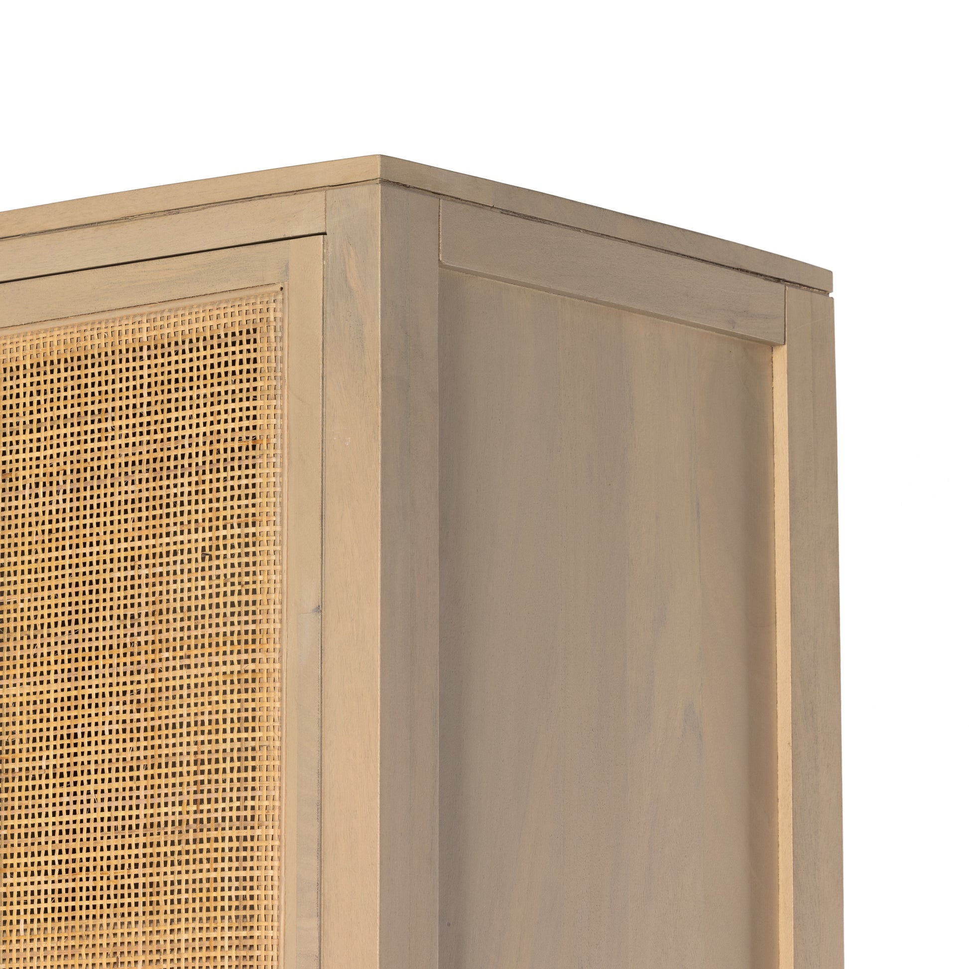 Natural mango encases textural cane doors which open to reveal generous interior storage. A simple Parsons-style base keeps things open and airy.